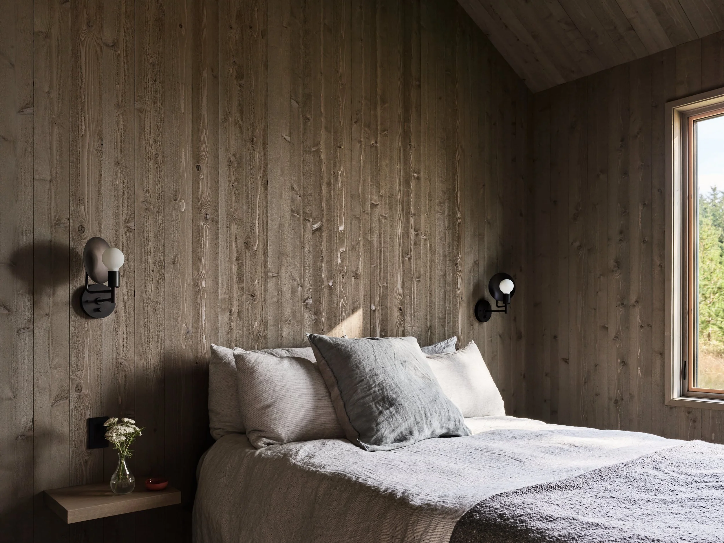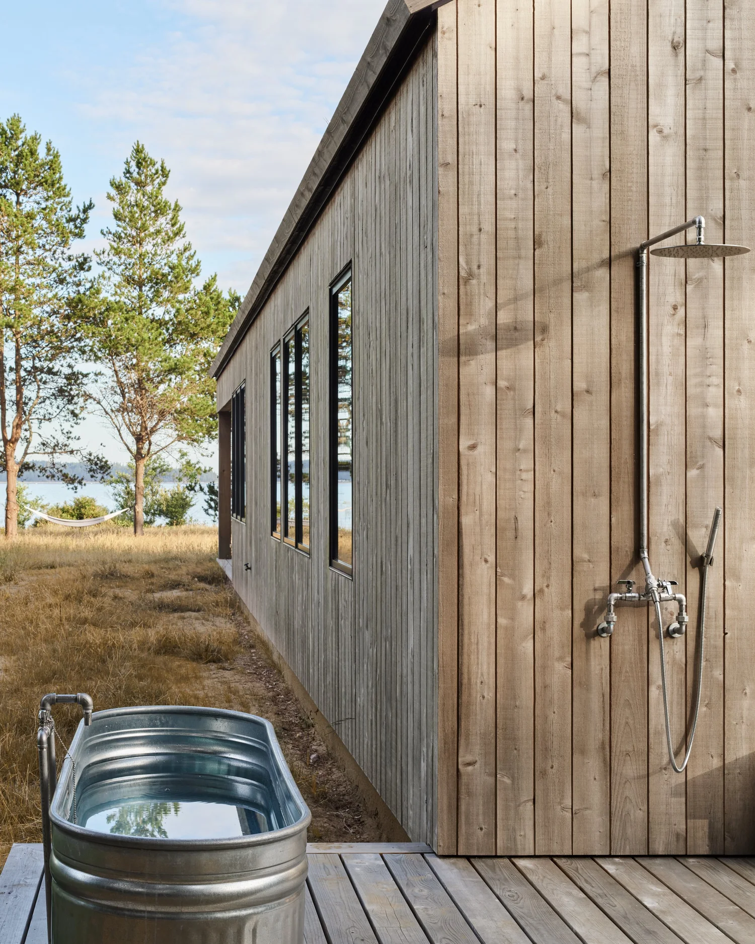 Zarówno ściany, jak i dachy obu budynków pokryto surowymi deskami z cedru, pozostawionymi do naturalnego szarzenia pod wpływem słońca i wiatru. Wewnątrz te same deski zostały zabarwione na odcień zgaszonej szarości, tworząc spokojną, chłodną oazę w kontrze do intensywnego letniego światła.