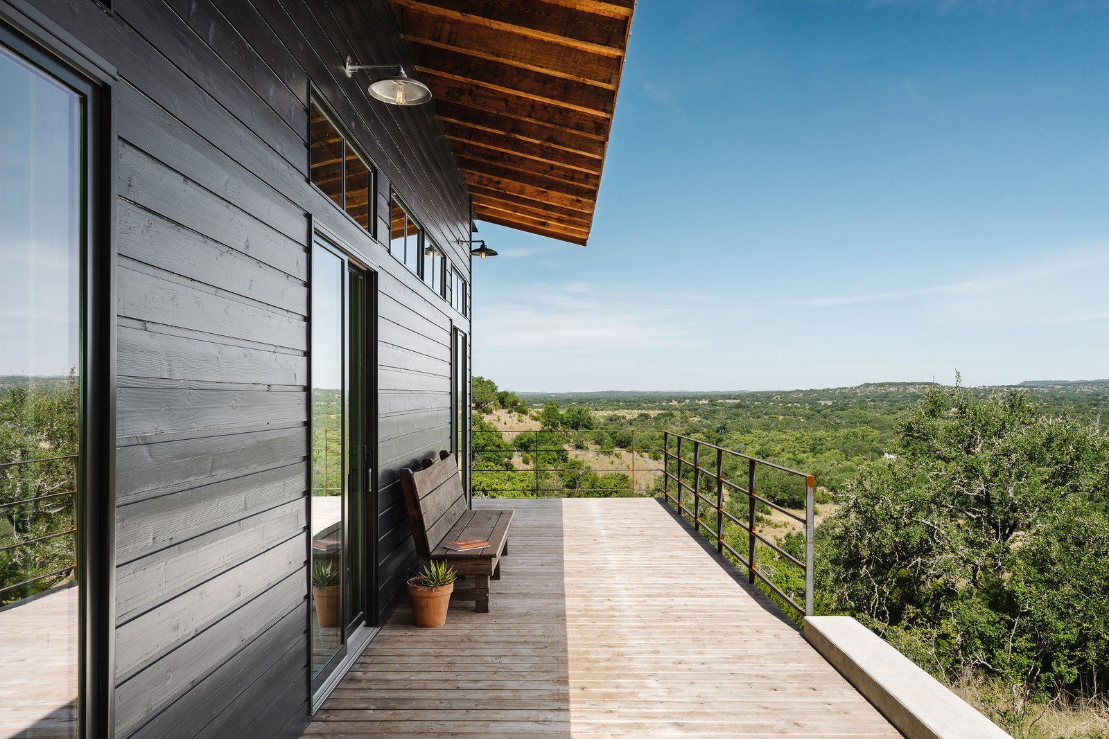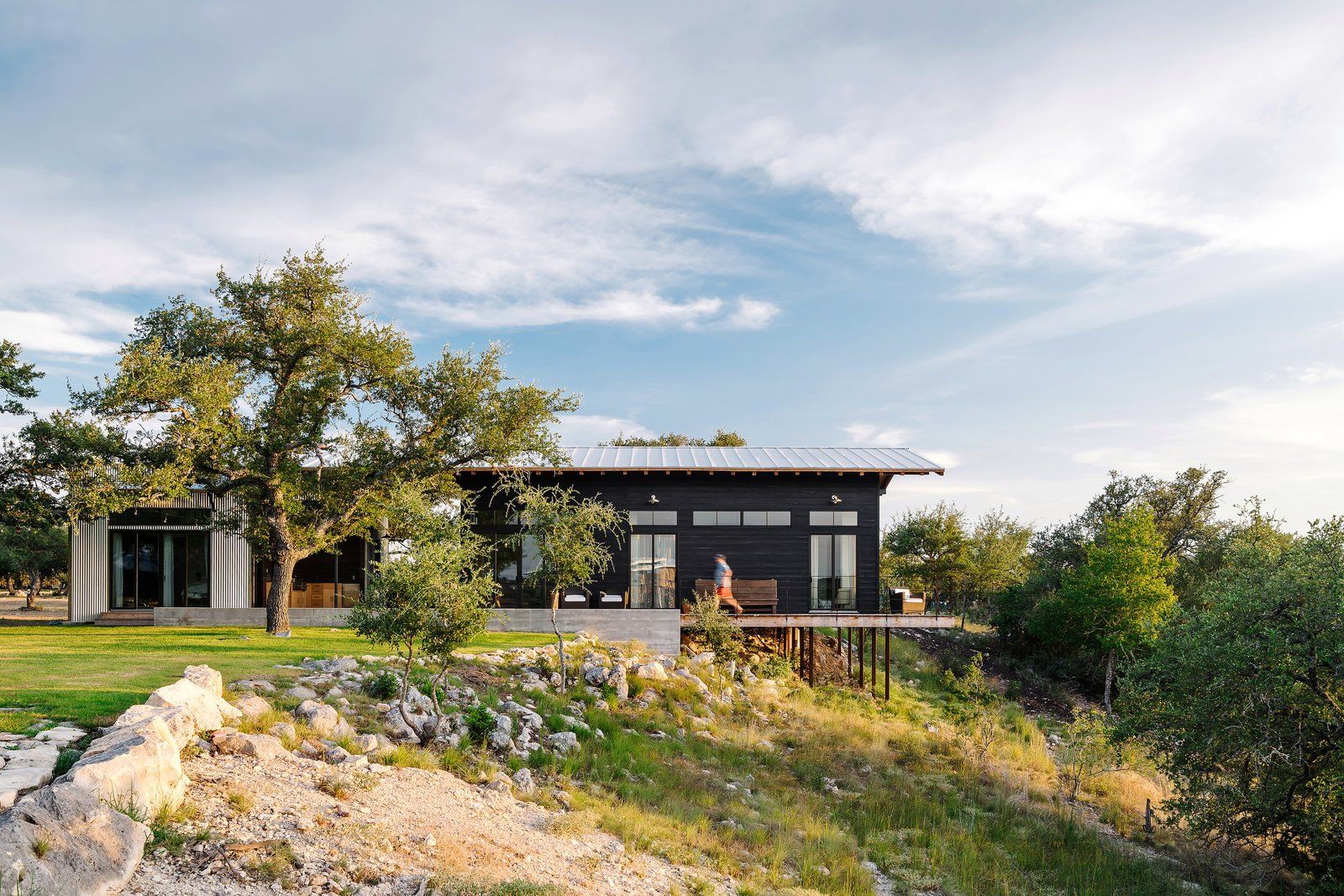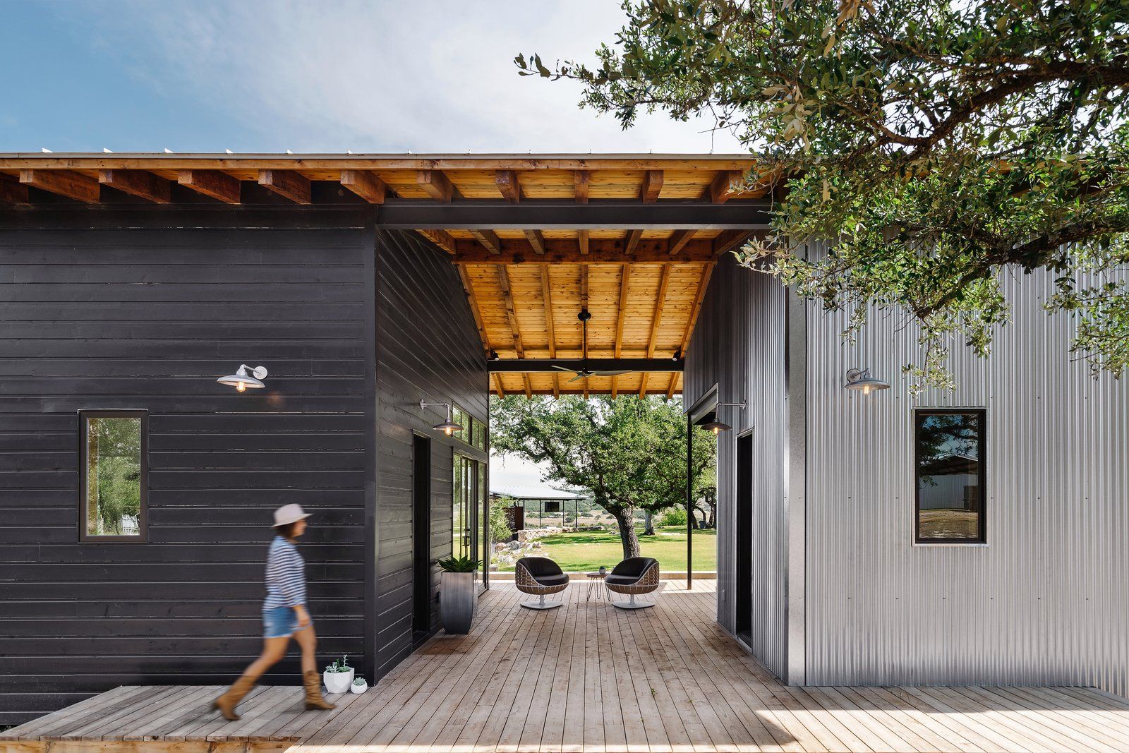Dom zyskał współczesny wygląd, dzięki zastosowaniu metalowego dachu i czarnej elewacji. Przestrzenie mieszkalne powiększono o zacienione tarasy, z których można podziwiać piękne widoki na teksańską przyrodę. Wnętrze uległo gruntownej przemianie.Nowa paleta materiałów nie kłóci się ze swoim otoczeniem i historią tego miejsca. Obejmuje bowiem produkty, które z czasem zyskają srebrzystą patynę. W projekcie pojawiają się też surowe, stalowe drzwi i półki, cynkowane blaty oraz drewniane sufity. Zestawiono je dla kontrastu z białymi, prostymi, gipsowymi wykończeniami ścian. W nowym domu pojawiają się duże przeszklenia, które wprowadzają do wnętrza naturalne światło i panoramiczne widoki. Specjalna przestrzeń dla gości to odnowiony stylowo „Teksański Motel”, czyli Airstream pochodzący z 1976 roku. Jego odświeżone wnętrze to połączenie drewnianych paneli z ikonicznym, błyszczącym, srebrnym wykończeniem.