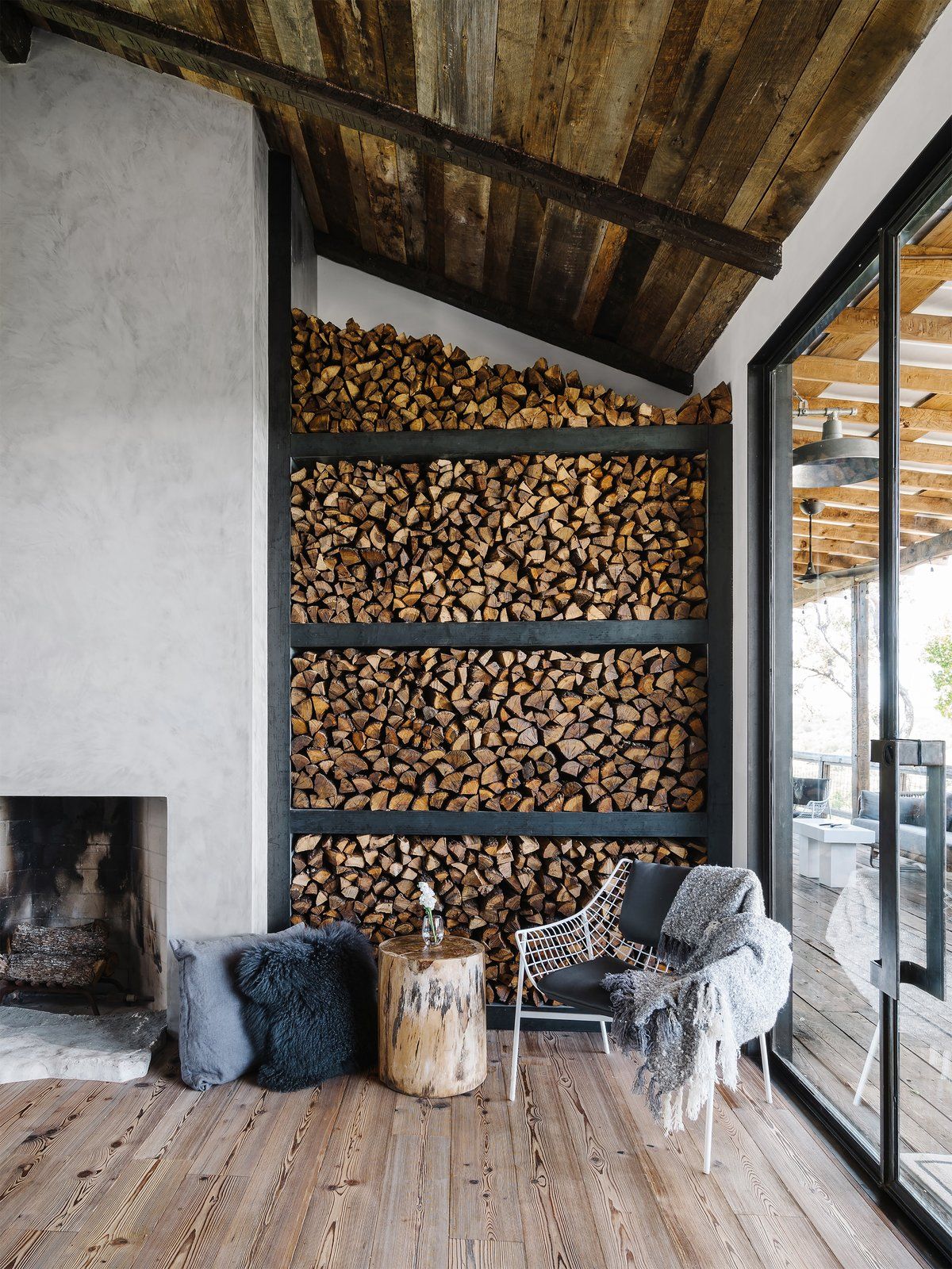 Architekci zadbali także o przestrzeń zewnętrzną wokół domu. Przy basenie stworzyli doskonałe miejsce wypoczynku i rozrywki na świeżym powietrzu. Pojawiła się tam nowa, stalowa konstrukcja z lekko nachylonym dachem. Daje on nie tylko cień podczas spotkań, ale w pawilonie mieści się też zewnętrzna kuchnia i jadalnia. Z tyłu pawilonu stworzono oryginalną ścianę wyłożoną drewnem do kominka, w której znajduje się zewnętrzne palenisko i telewizor idealny na letnie wieczory kinowe. Z tego miejsca roztacza się też zachwycający widok na położoną poniżej równinę.