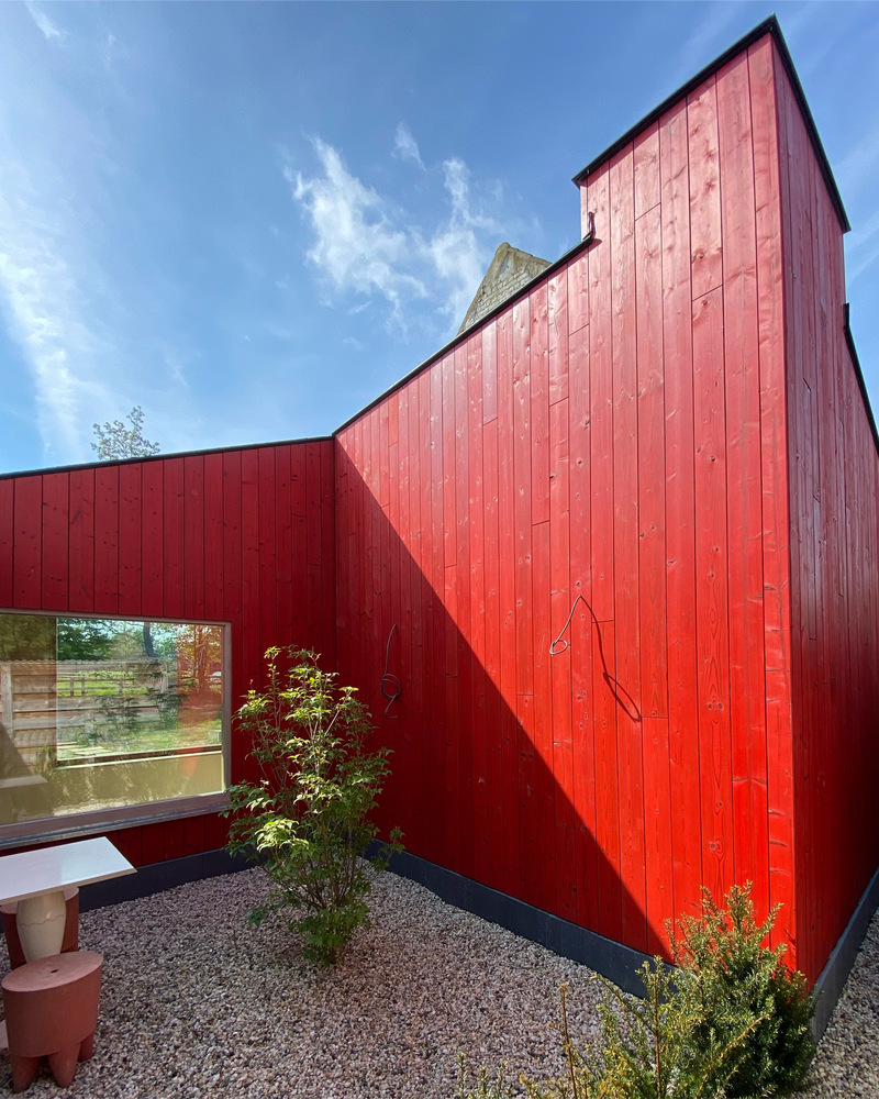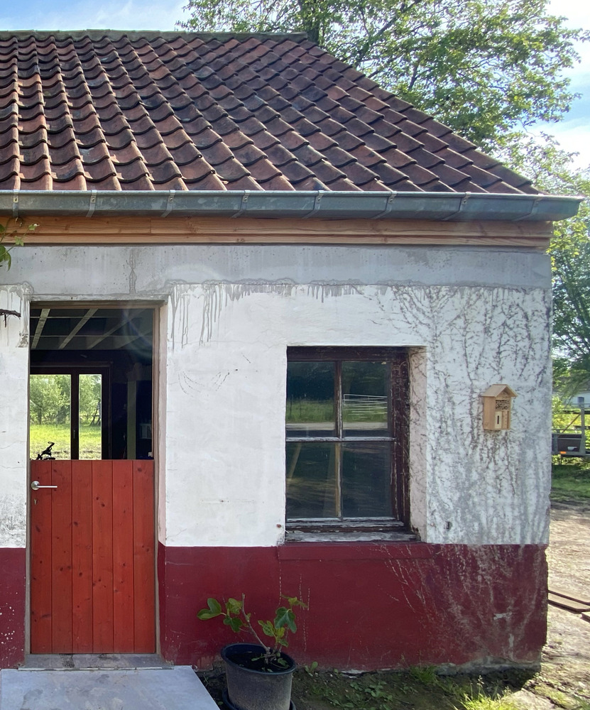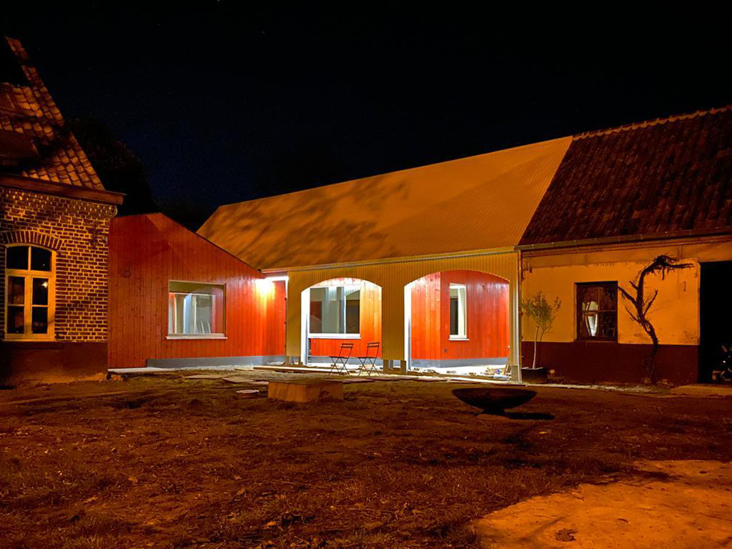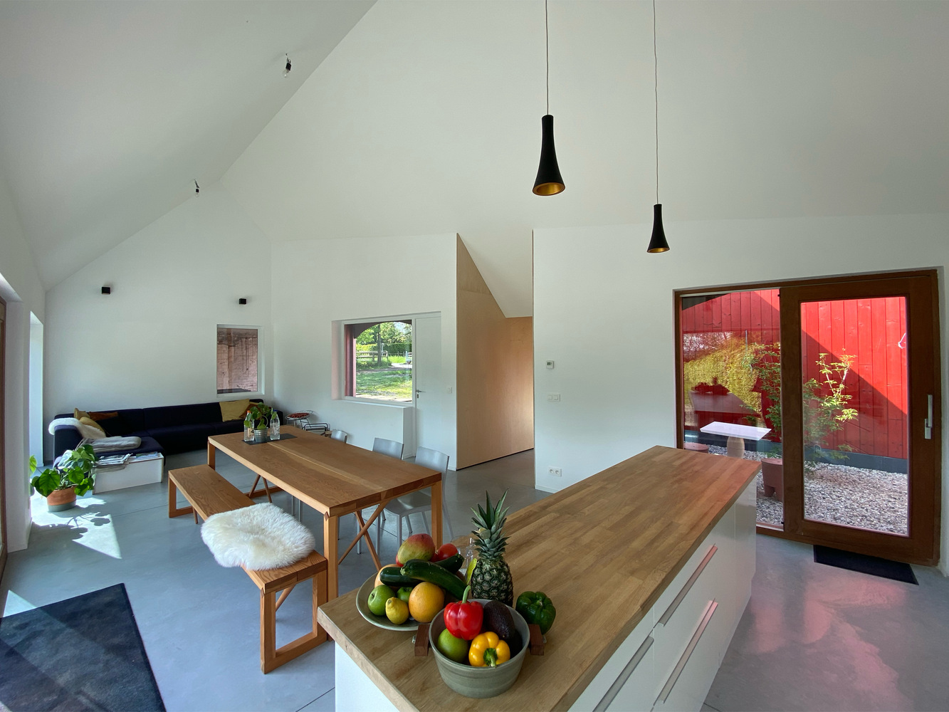 Abstrakcyjna rekonstrukcja zniszczonej stodoły stanowi fundament rozbudowy wewnątrz głównego budynku. Nowe przestrzenie mieszkalne płynnie łączą się z stodołą, otwierając główny dom na ogród. W podobny sposób jak dawniej, łuki w projekcie nadają rytm abstrakcyjnej bryle, a zadaszony taras łączy wewnętrzny dziedziniec z tylnym ogrodem. Stajnia została odnowiona z widocznymi elementami betonowymi i pełni funkcję magazynu, ale z perspektywą przyszłej rozbudowy o pokój gościnny.