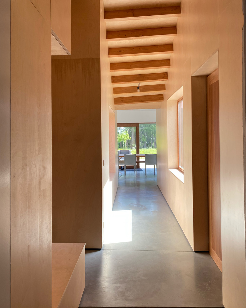 Stalowa ocynkowana konstrukcja umożliwia stworzenie przestronnej przestrzeni mieszkalnej, pozbawionej widocznych elementów konstrukcyjnych. Przestrzeń życiowa oferuje maksymalną elastyczność, umożliwiając przyszłe zmiany w układzie wnętrz. Objętość przestrzeni płynnie podąża za stalową ramą, ale częściowo się od niej dystansuje, tworząc zadaszoną przestrzeń mieszkalną na świeżym powietrzu. Ta przestronność umożliwia łatwy dostęp do tylnego ogrodu z dziedzińca.