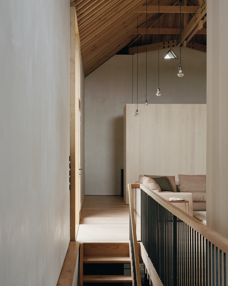 Na parterze znajdują się sypialnie i kuchnia, które korzystają z łukowych drzwi, podczas gdy górne piętro pełni funkcję otwartej przestrzeni dziennej i roboczej. Materiały podkreślają historię i hierarchię budynku – drewno sykomorowe w modułach, oryginalne mury kamienne i tynk wapienny w pozostałych elementach.