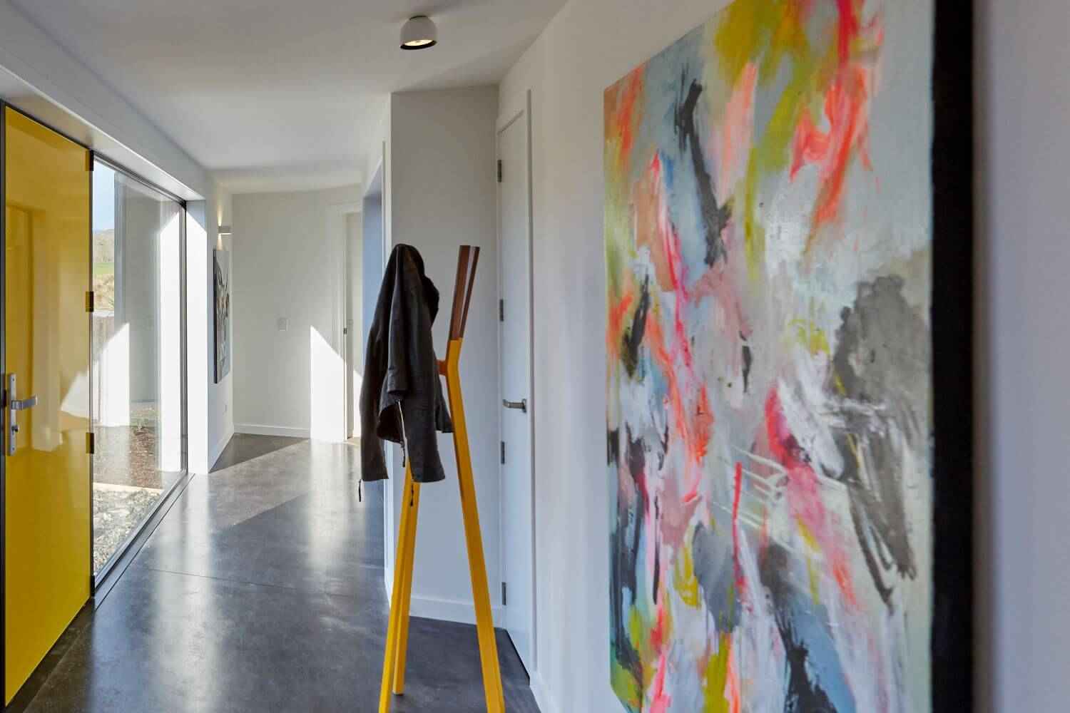 Wnętrze odzwierciedla artystyczną duszę właściciela – to przestrzeń, w której styl loftowy, rustykalny i nowoczesny minimalizm przenikają się, tworząc niepowtarzalny klimat. Połączenie czerni, bieli i naturalnych materiałów z kolorowymi akcentami podkreśla indywidualny charakter domu. Reflections House to przykład, jak architektura w stylu nowoczesnej stodoły może łączyć komfort, funkcjonalność i zachwycający kontakt z naturą, oferując idealne miejsce do odpoczynku z widokiem na jezioro i góry.