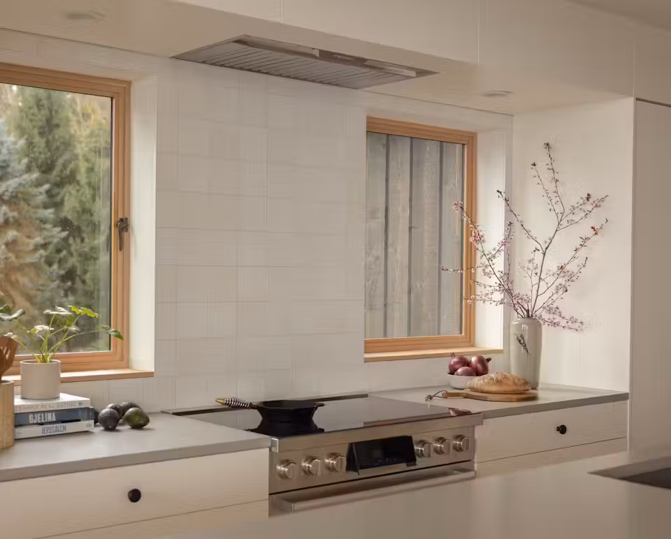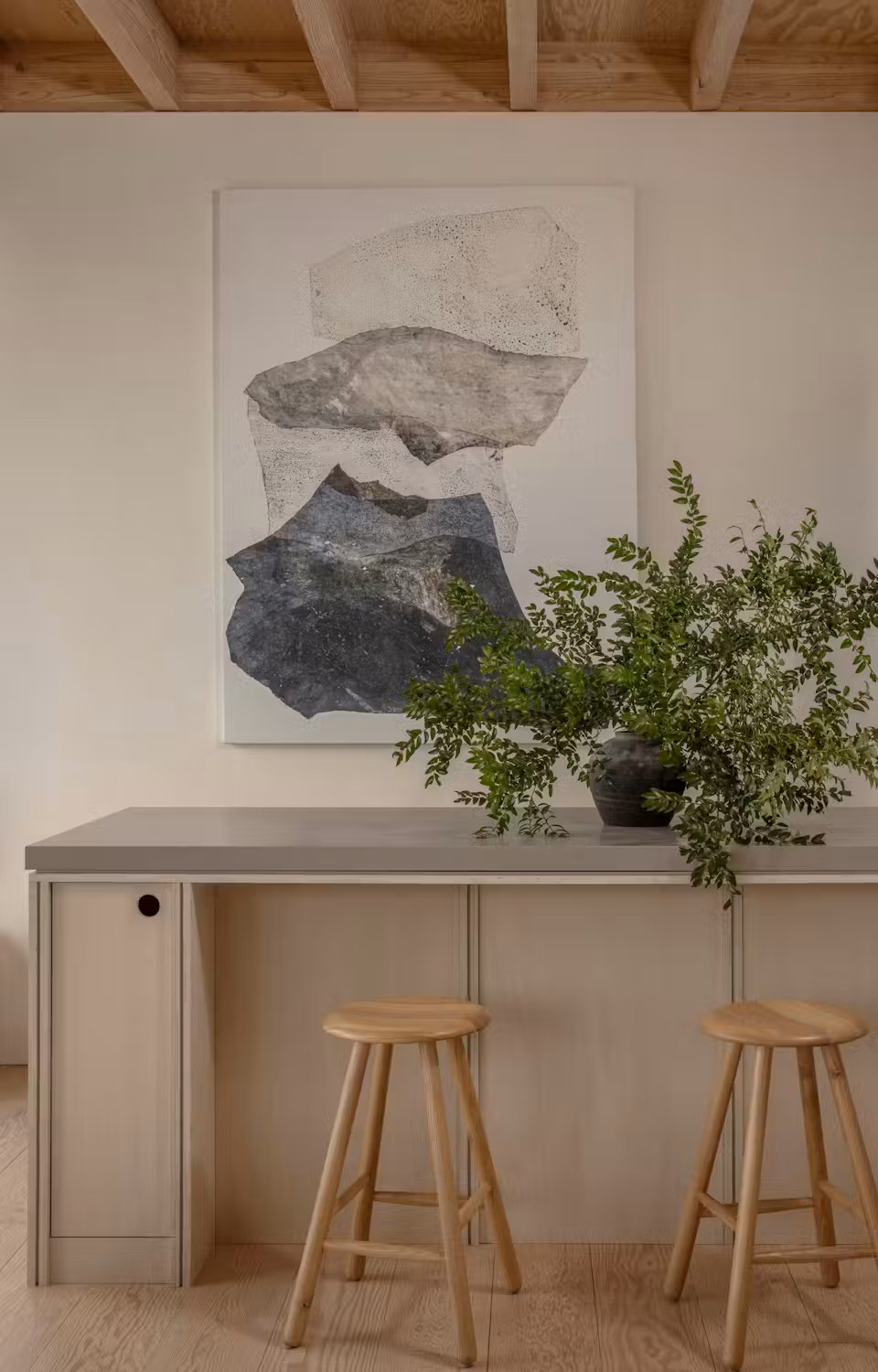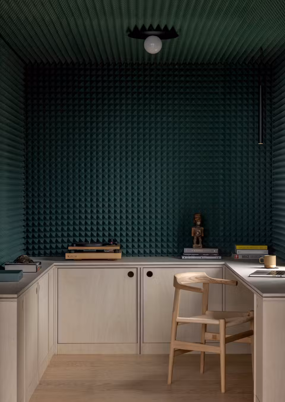 W kontraście do rozległego krajobrazu i otwartej przestrzeni, wewnątrz domu znalazły się trzy strategiczne wnęki, które pełnią funkcję kameralnych stref prywatnych. Każda z nich została zaprojektowana z myślą o innym aspekcie codziennego życia – gotowaniu, pracy i słuchaniu.