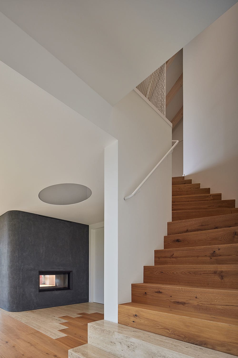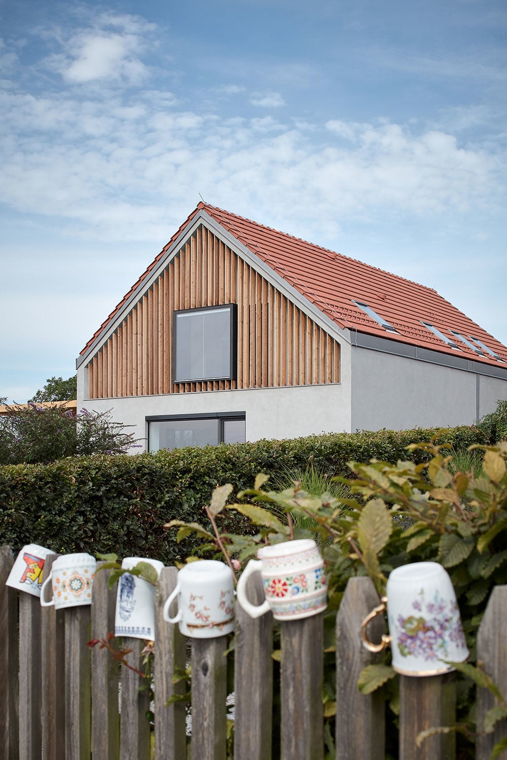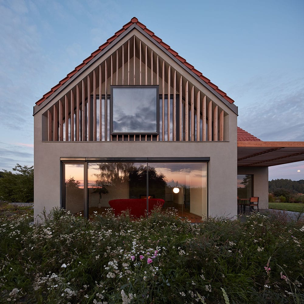 Przebudowa była nie tylko estetyczna, ale i technologiczna – ujawniono błędy w konstrukcji i zastosowanie słabej jakości materiałów. Dzięki własnej firmie budowlanej MY76, Atelier SAD mogło sprawnie przeprowadzić wszystkie prace. Przeprojektowany dach zyskał prostą, dwuspadową formę, a modrzewiowe listwy umieszczone przy oknach tworzą ciekawy efekt optyczny – przypominają drewnianą okładzinę, jednocześnie przepuszczając światło i nie zasłaniając widoku. Całość harmonijnie wpisuje się w wiejski krajobraz, przypominając współczesną interpretację tradycyjnego domu – nowoczesną stodołę inspirowaną czeską kulturą.