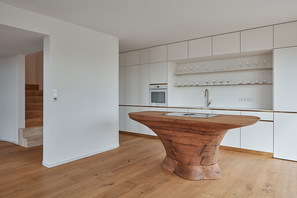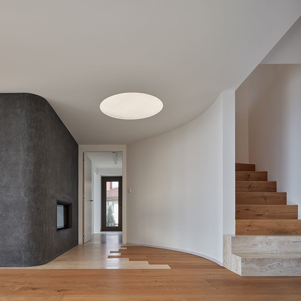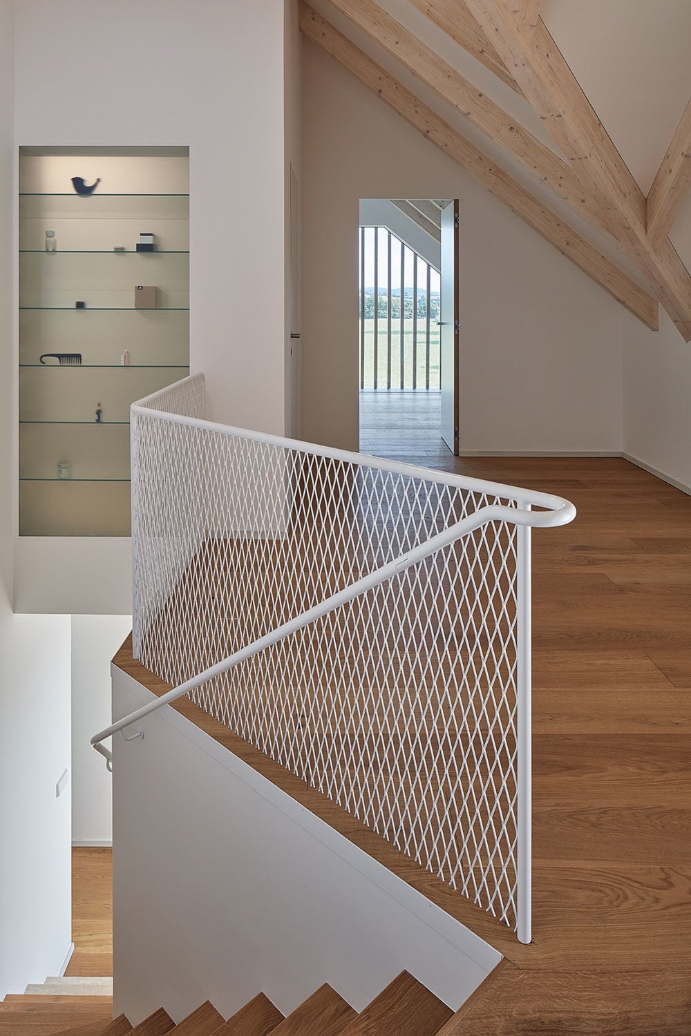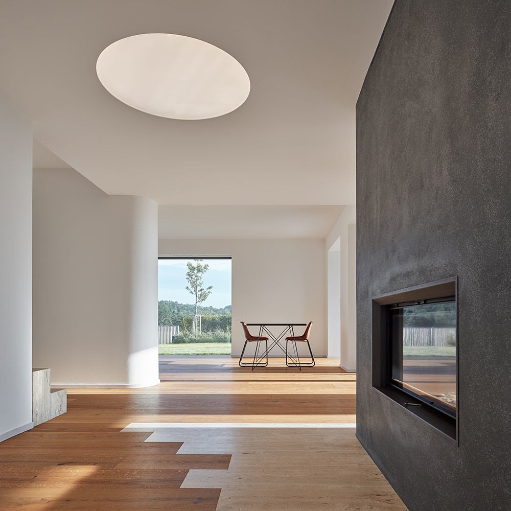 Przebudowa była nie tylko estetyczna, ale i technologiczna – ujawniono błędy w konstrukcji i zastosowanie słabej jakości materiałów. Dzięki własnej firmie budowlanej MY76, Atelier SAD mogło sprawnie przeprowadzić wszystkie prace. Przeprojektowany dach zyskał prostą, dwuspadową formę, a modrzewiowe listwy umieszczone przy oknach tworzą ciekawy efekt optyczny – przypominają drewnianą okładzinę, jednocześnie przepuszczając światło i nie zasłaniając widoku. Całość harmonijnie wpisuje się w wiejski krajobraz, przypominając współczesną interpretację tradycyjnego domu – nowoczesną stodołę inspirowaną czeską kulturą.