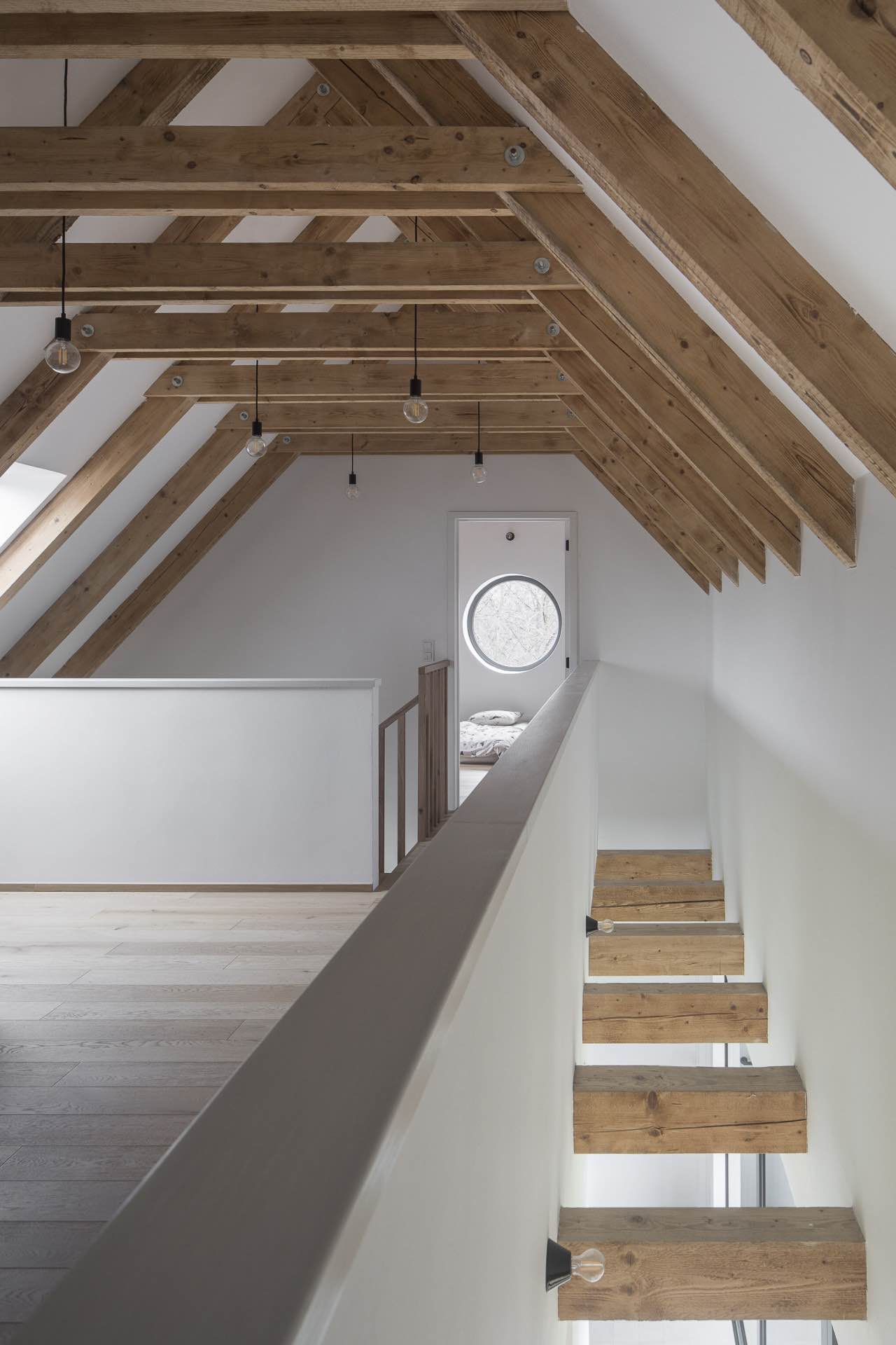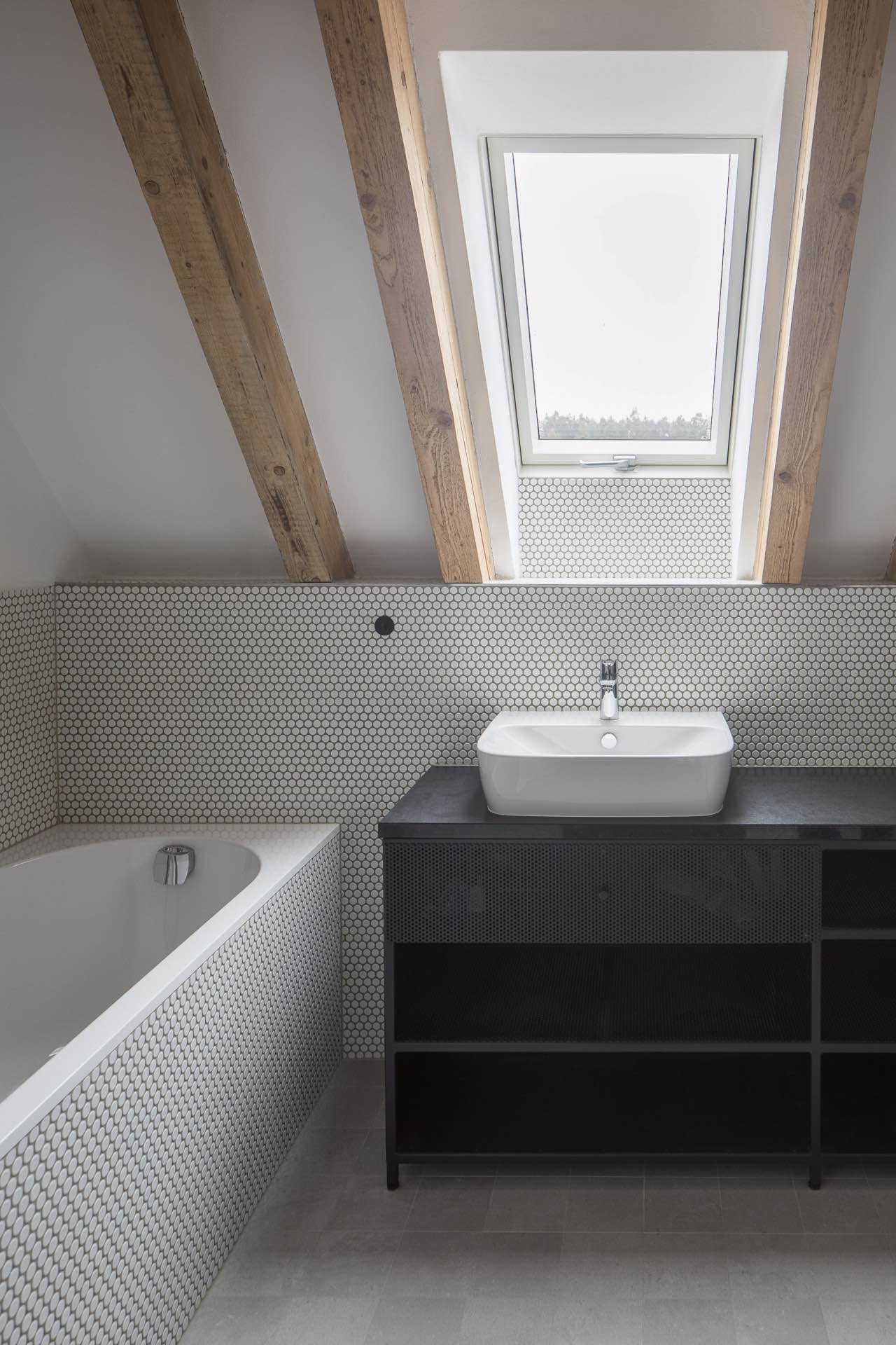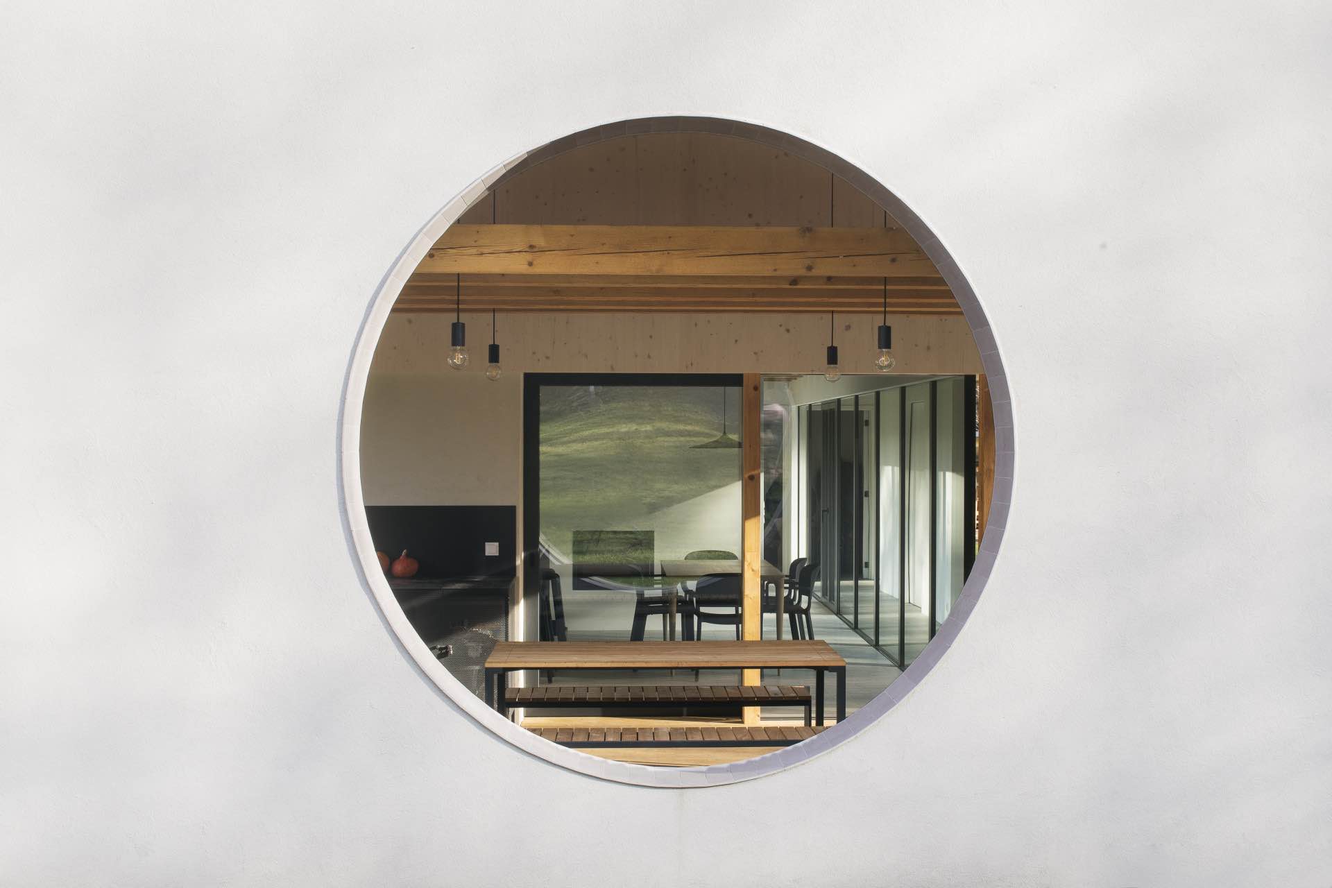 Jednym z kluczowych zabiegów projektowych było zintegrowanie krytej terasy w obrębie głównego wolumenu domu. Z zewnątrz sedlová střecha przebiega nieprzerwanie, nie zdradzając zmian w organizacji przestrzeni. Dopiero od strony ściany szczytowej ujawnia się wycięty w elewacji okrągły otwór, który zdradza obecność półotwartej strefy wypoczynkowej. Ten detal nadaje budynkowi lekkości i wprowadza element zaskoczenia w pozornie bardzo zdyscyplinowanej formie.
