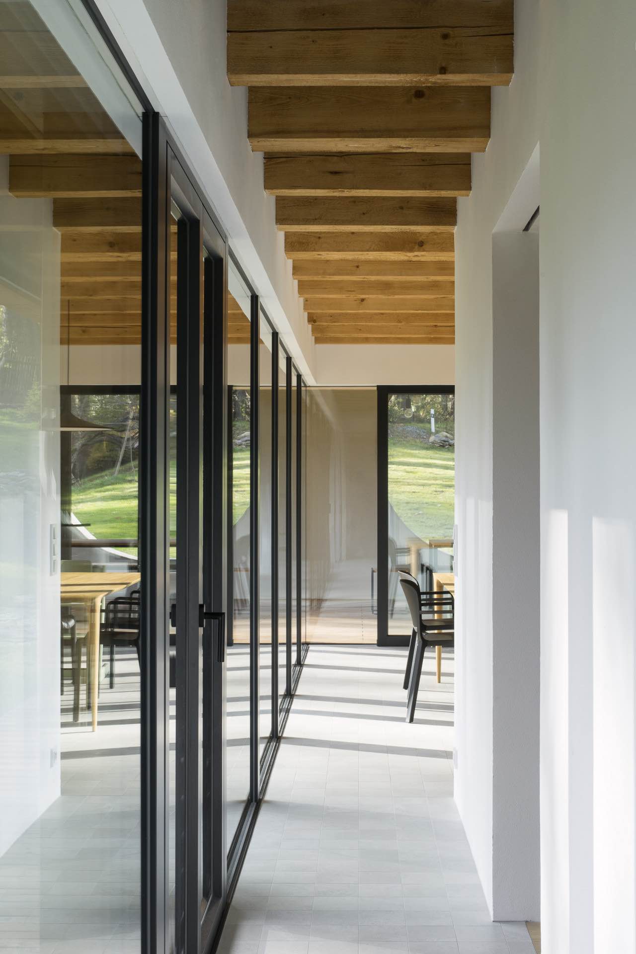 Architekci dążyli do możliwie naturalnego i intensywnego powiązania wnętrza z ogrodem oraz zadaszoną terasą. Główna przestrzeń dzienna otwiera się na zewnątrz poprzez duże przeszklenia, które obejmują również narożnik budynku. Dzięki temu granica między domem a krajobrazem ulega zatarciu, a światło dzienne swobodnie penetruje wnętrze przez cały dzień.