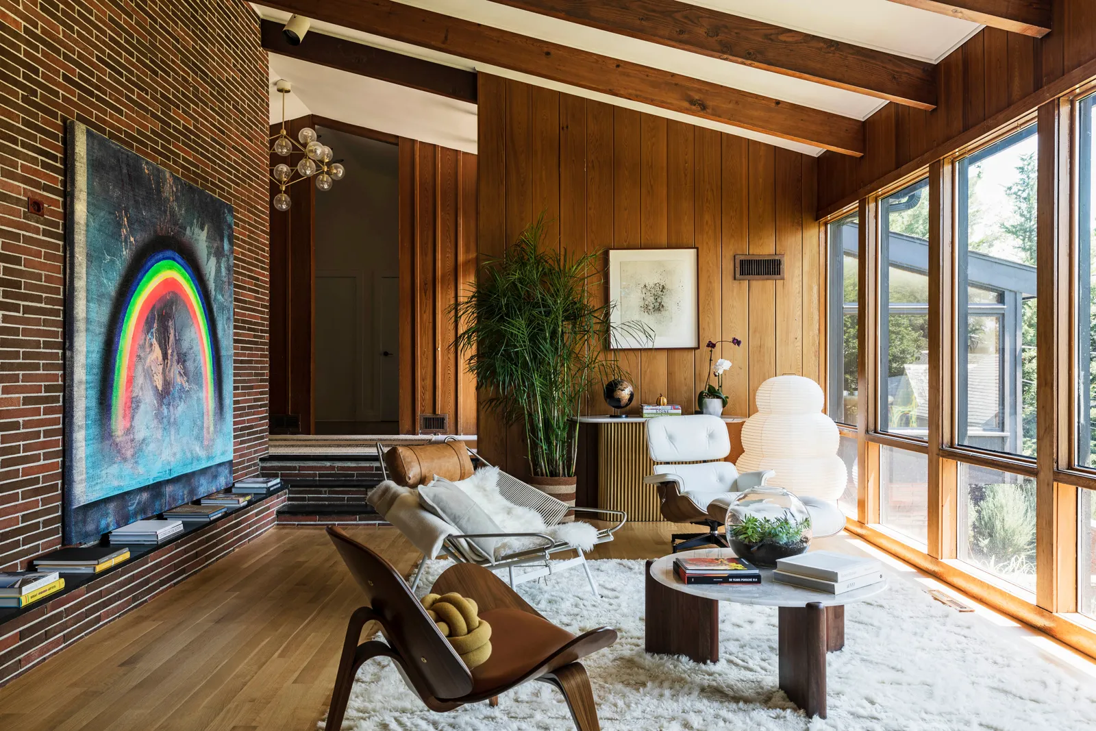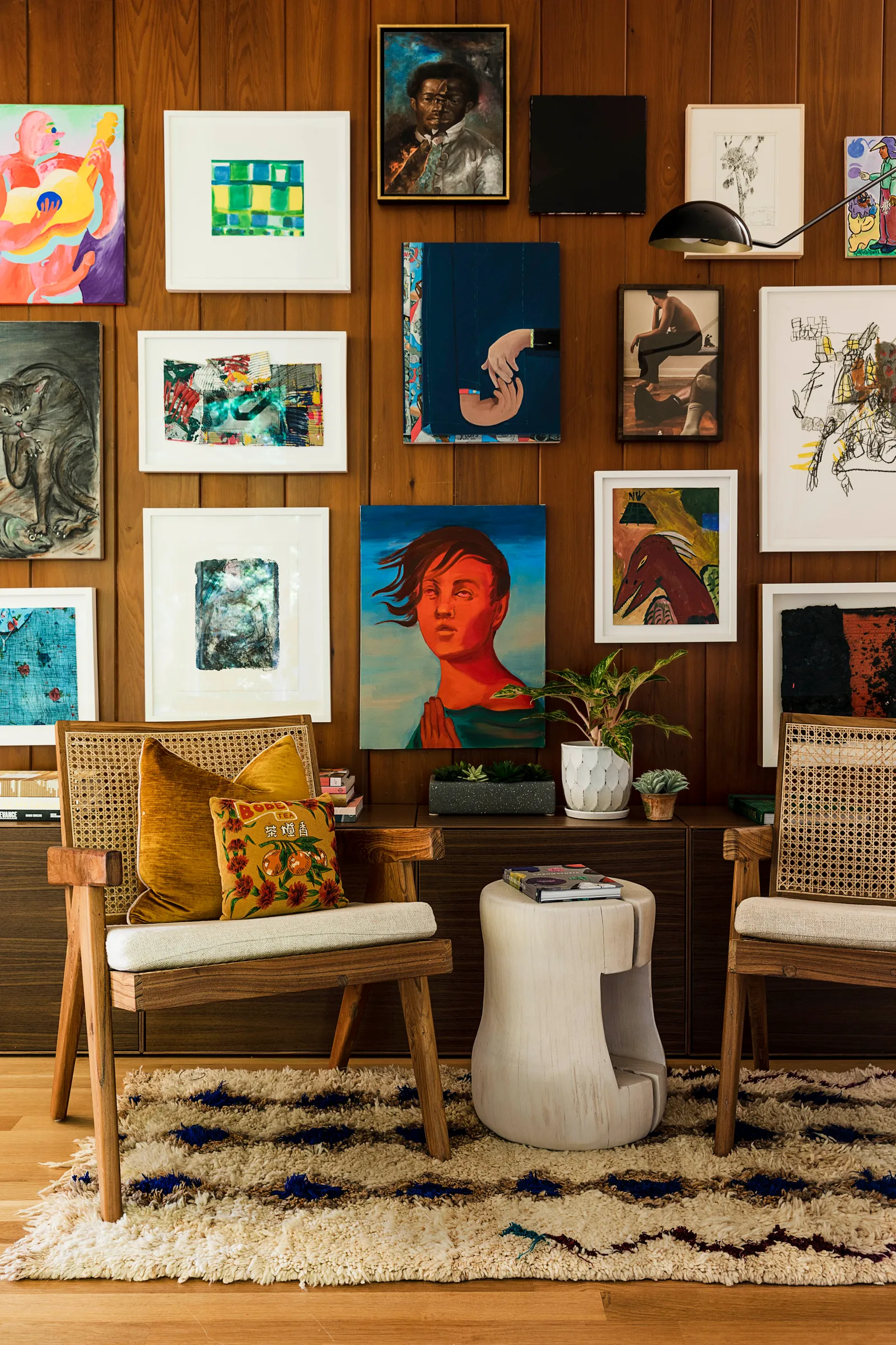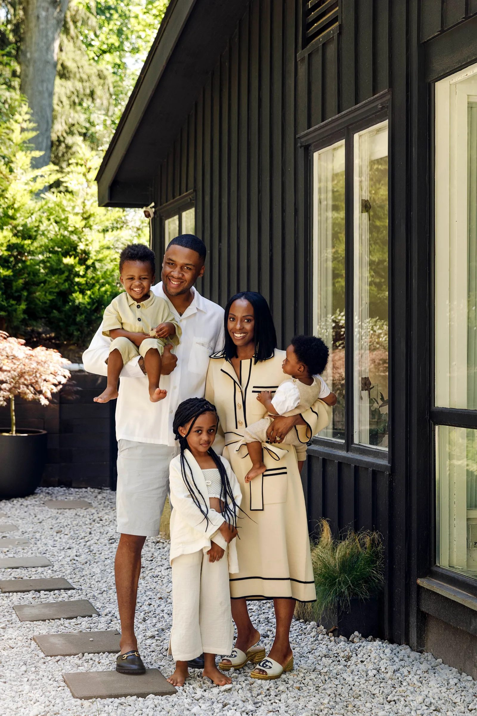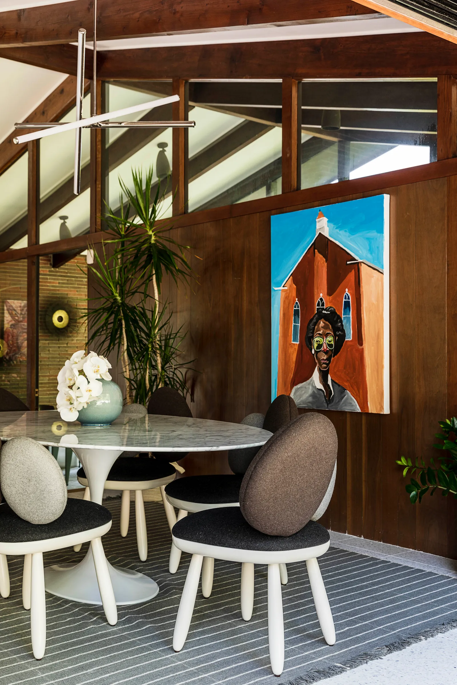 Elewacja, która była chłodnego brązu, została przemalowana na głęboki grafit, a drzwi frontowe zmieniono z pomarańczowych na różowe. Spann i jego rodzina dodali wiele osobistych akcentów, aby nowy dom stał się wygodny i funkcjonalny. W każdym pomieszczeniu można znaleźć dzieła z rosnącej kolekcji sztuki artysty. „Uwielbiam książki o designie i architekturze” – mówi Spann. „Inspirują mnie organiczne kształty, okręgi, krągłości. To takie rodzicielskie – brak ostrych krawędzi, wszystko wygodne i bezpieczne.”