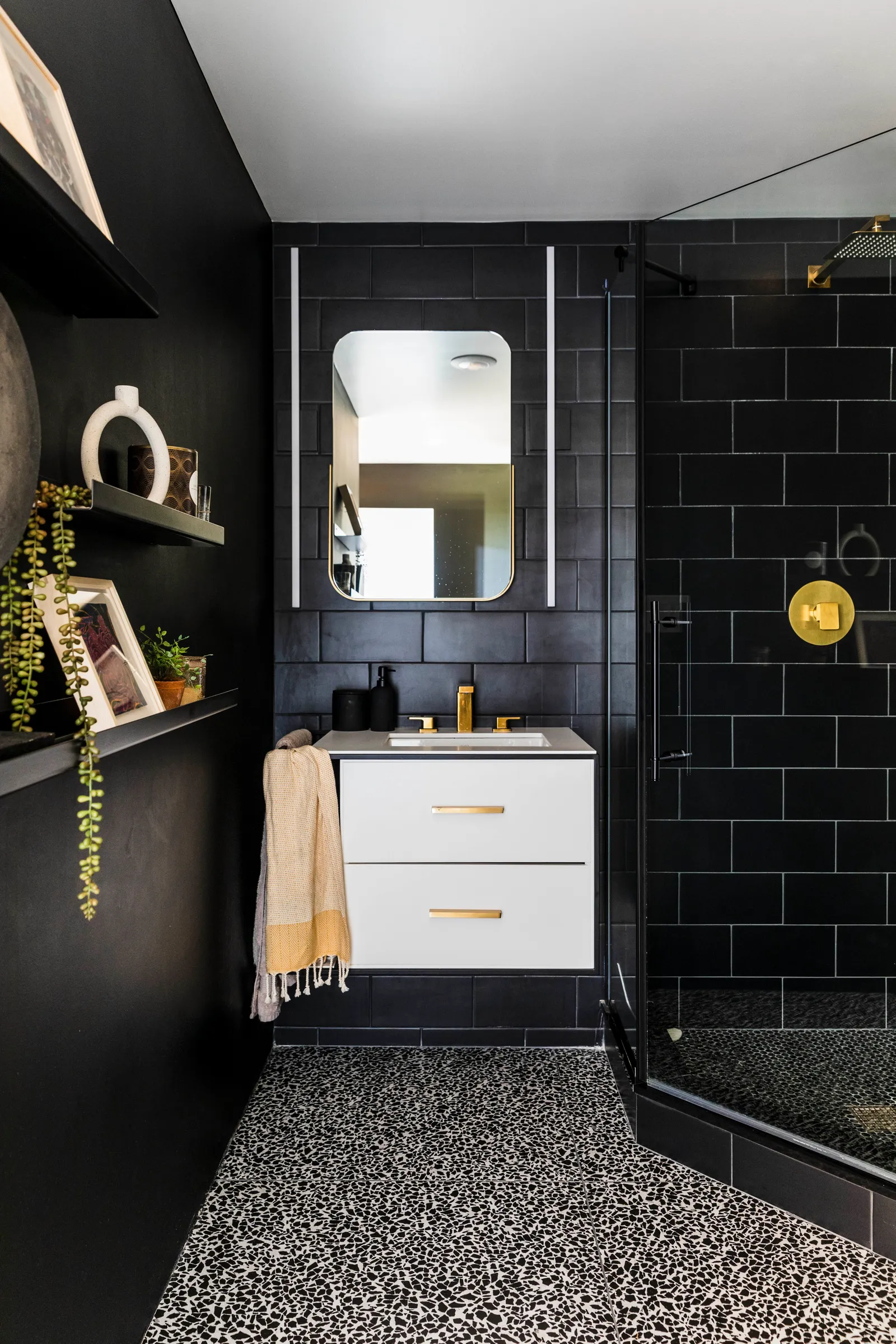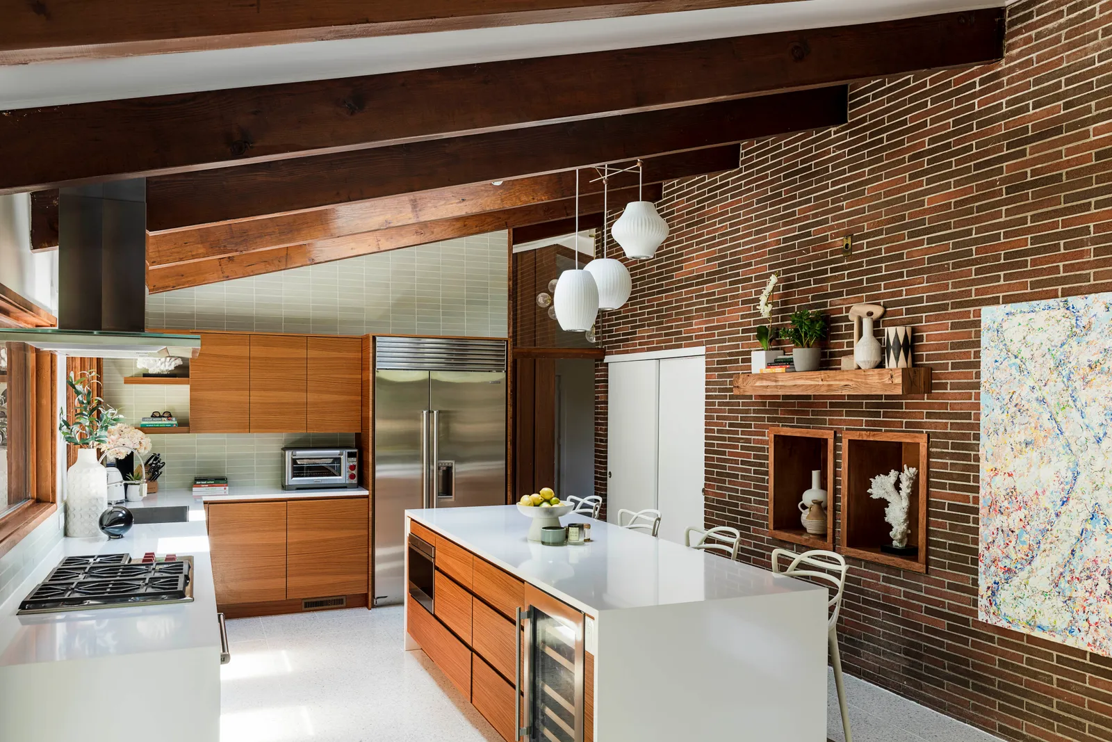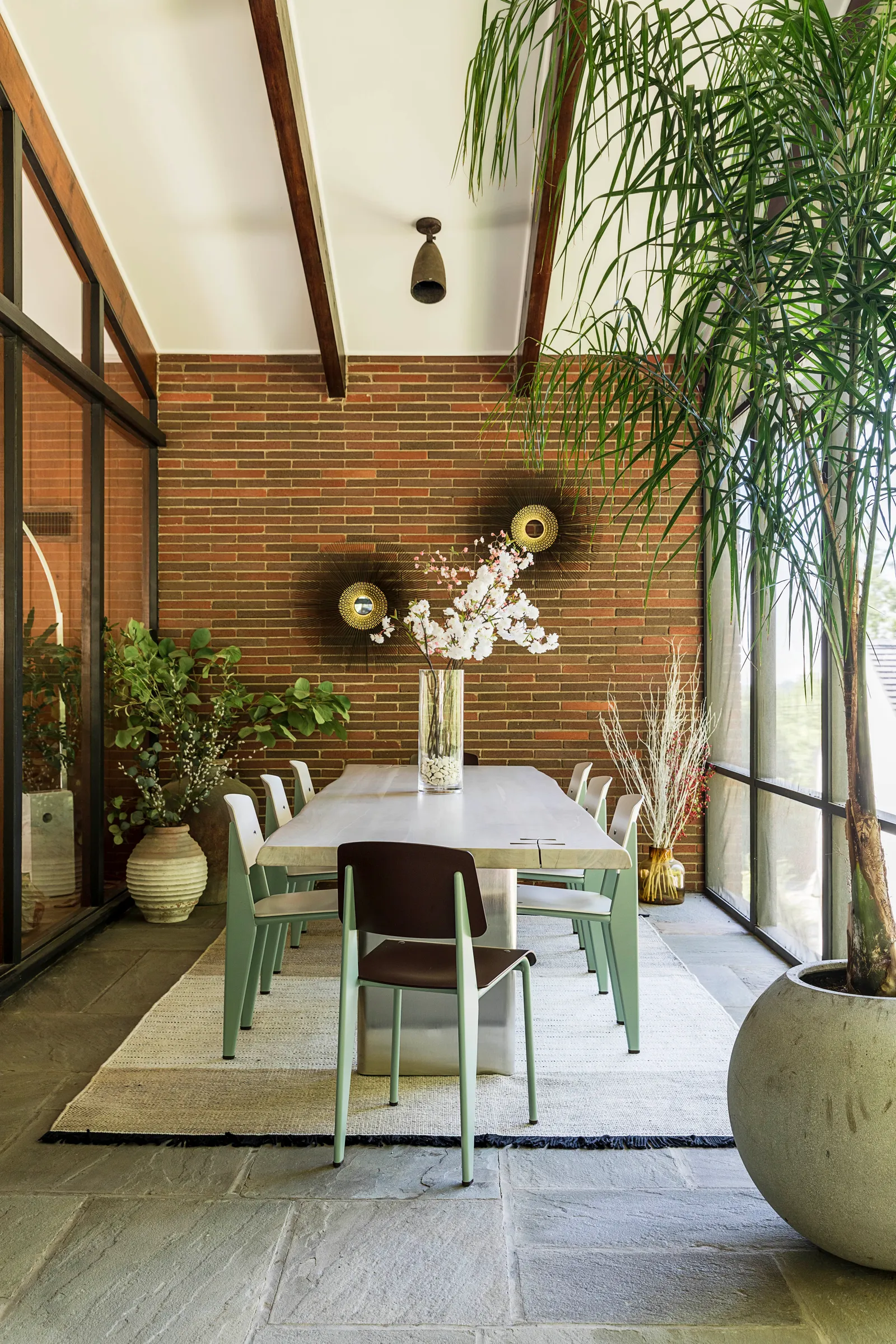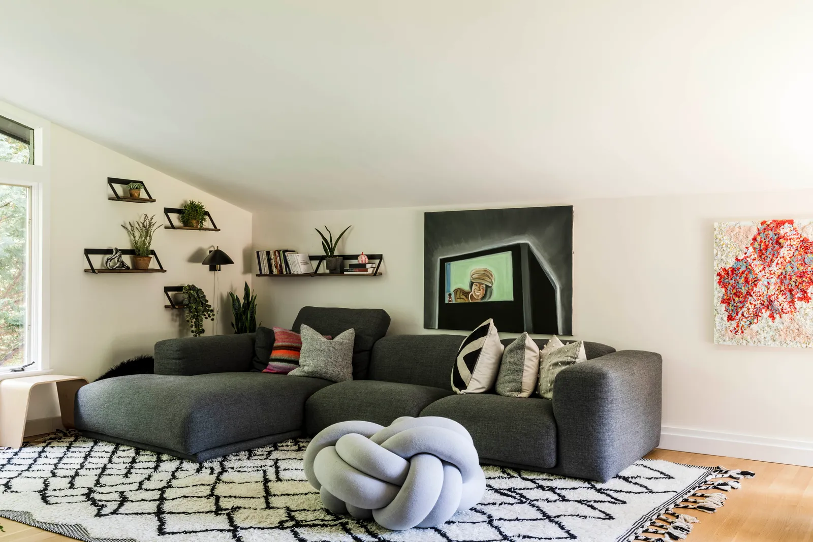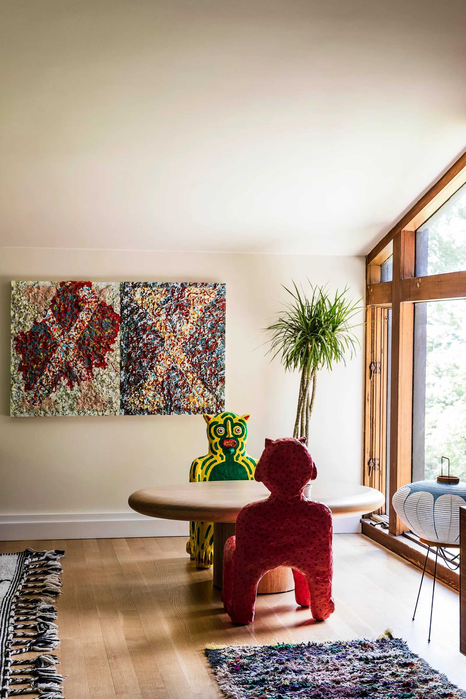 Elewacja, która była chłodnego brązu, została przemalowana na głęboki grafit, a drzwi frontowe zmieniono z pomarańczowych na różowe. Spann i jego rodzina dodali wiele osobistych akcentów, aby nowy dom stał się wygodny i funkcjonalny. W każdym pomieszczeniu można znaleźć dzieła z rosnącej kolekcji sztuki artysty. „Uwielbiam książki o designie i architekturze” – mówi Spann. „Inspirują mnie organiczne kształty, okręgi, krągłości. To takie rodzicielskie – brak ostrych krawędzi, wszystko wygodne i bezpieczne.”