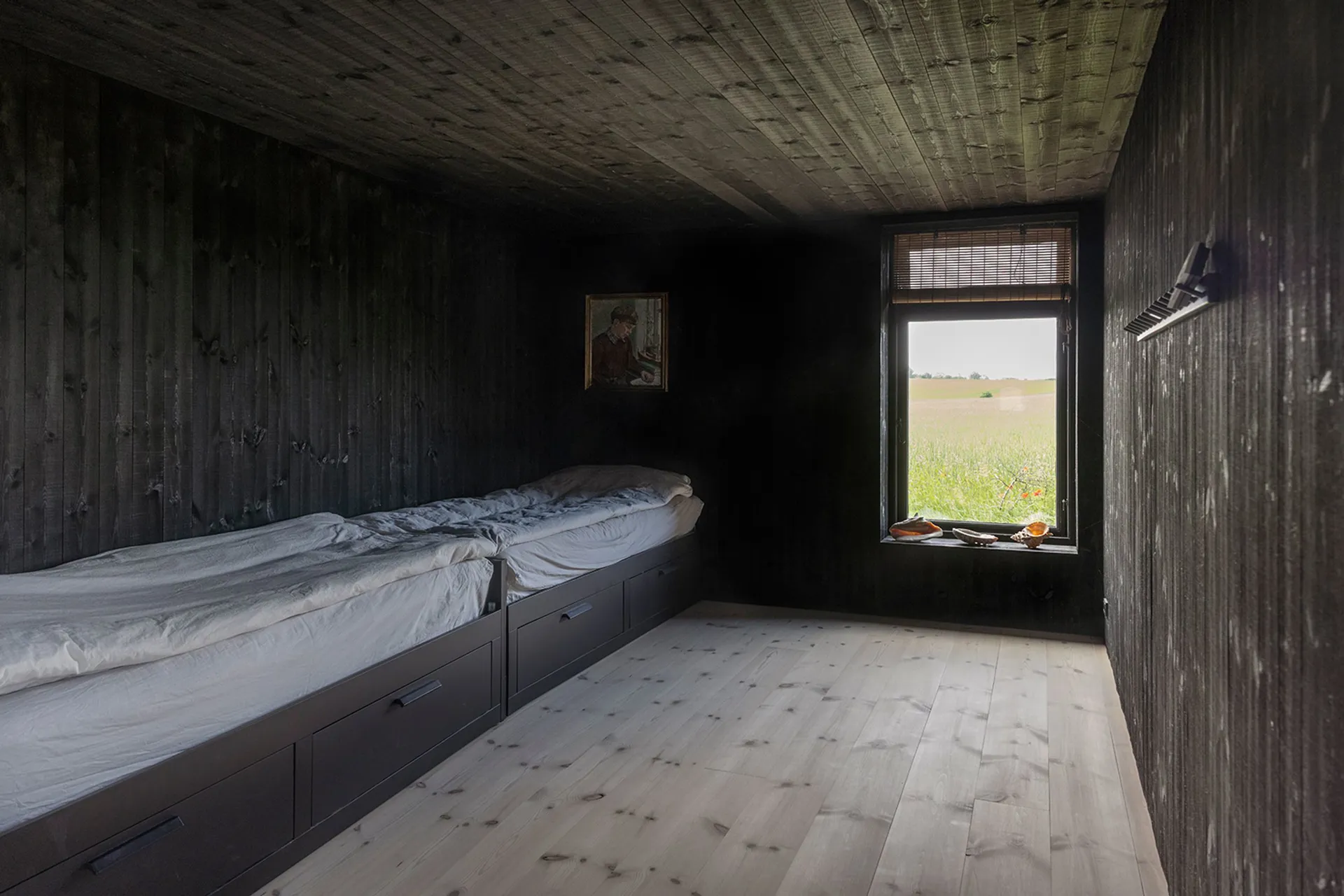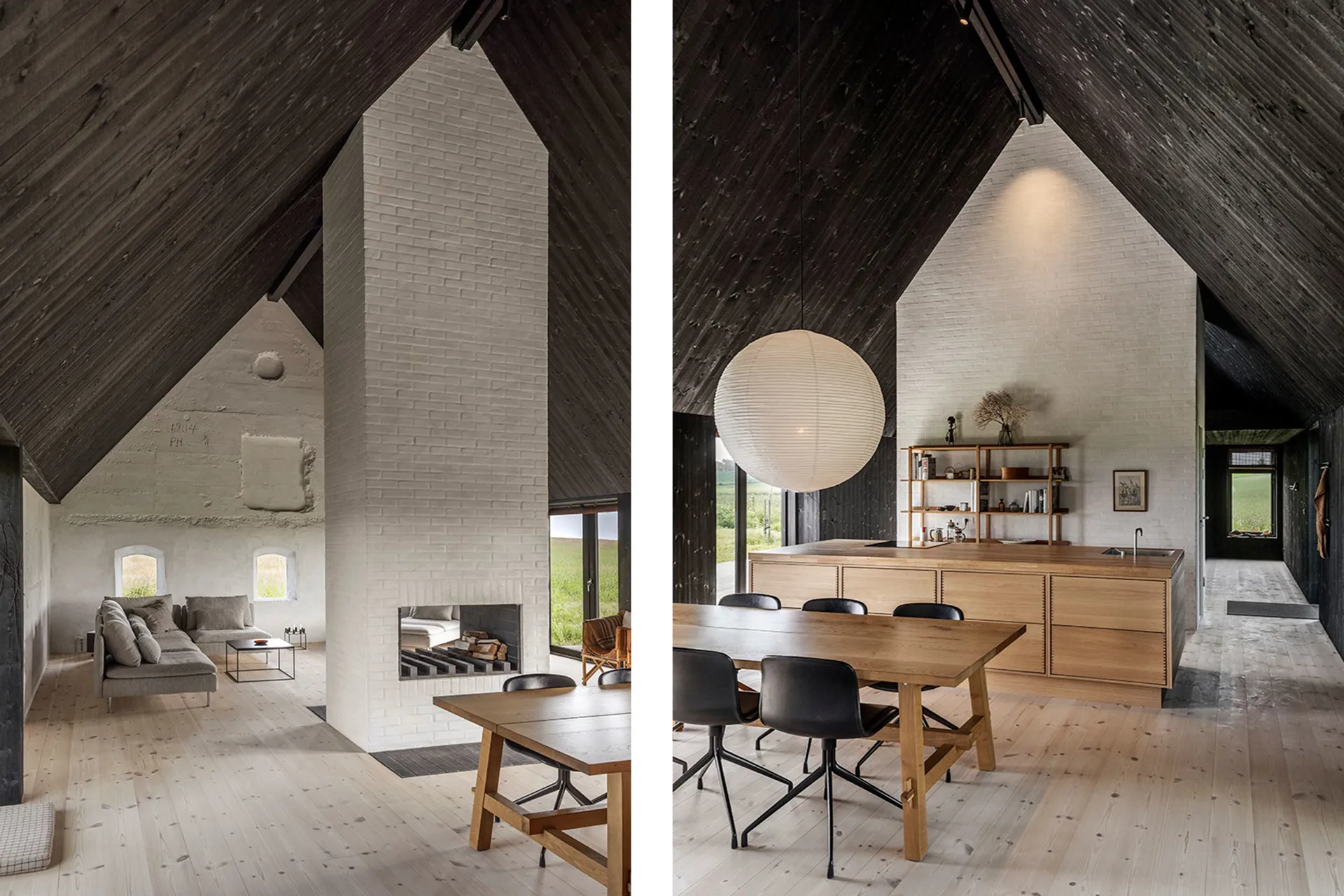Elewacje wykonane w technice Shou Sugi Ban, czyli japońskiego opalania drewna, dodają budynkowi głębi i trwałości. Wnętrza różnicują poziom światła i kolorystyki – prywatne przestrzenie są ciemniejsze i bardziej intymne, podczas gdy strefa dzienna otwiera się na krajobraz, niczym kamera wpuszczająca obraz przez obiektyw. W sercu domu znajduje się kominek – motyw znany zarówno z tradycyjnych duńskich domów, jak i z modernistycznych willi.