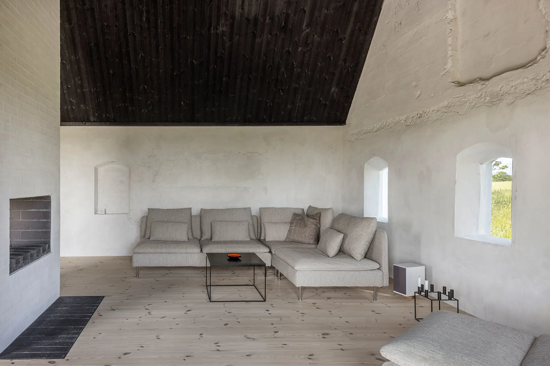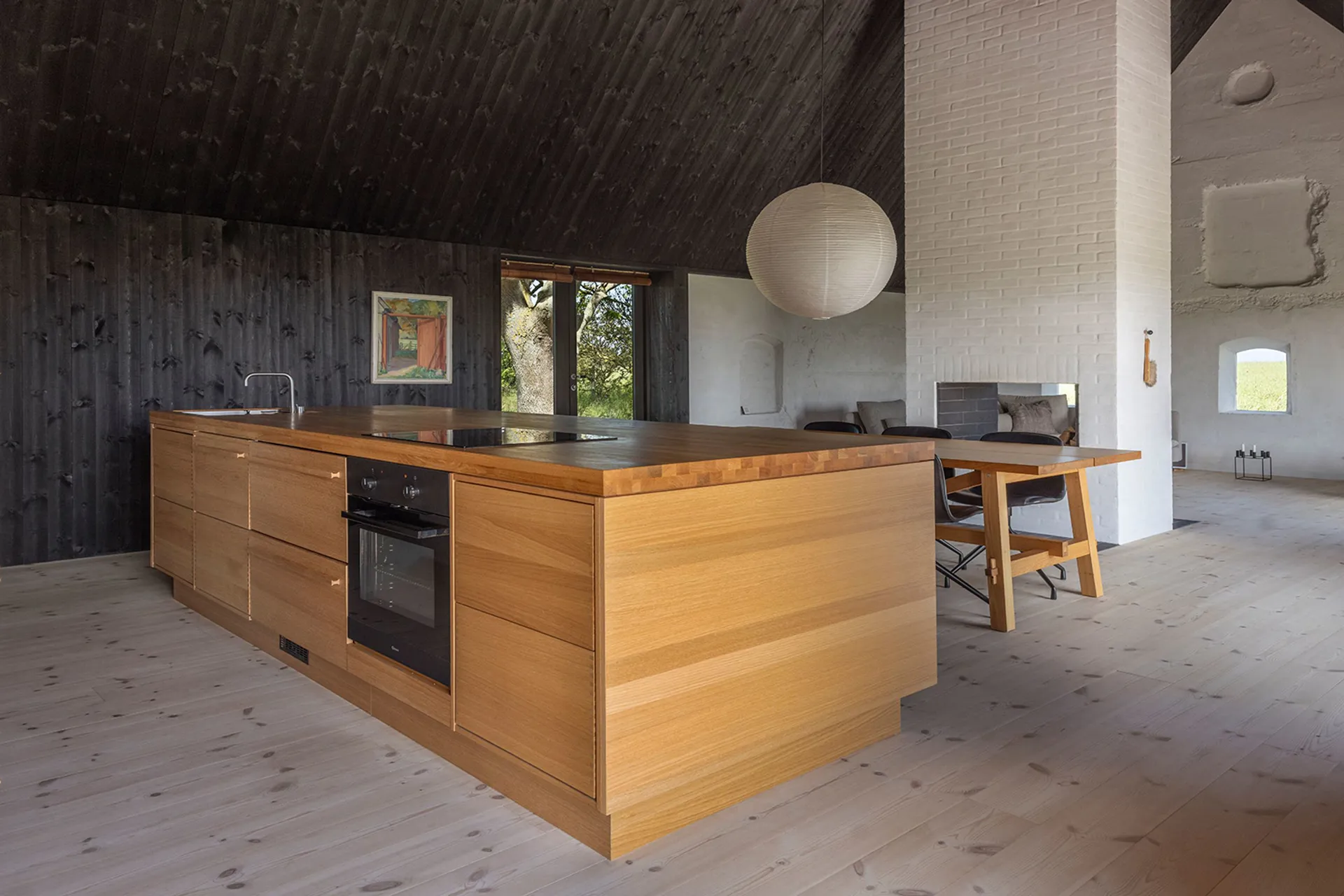 Choć obiekt był w stanie daleko posuniętej degradacji, renowacja nie polegała na jego wyburzeniu. Wręcz przeciwnie – możliwie wiele elementów konstrukcji i materiałów zostało ponownie wykorzystanych. Dzięki temu dom wciąż „leży” w krajobrazie dokładnie tak, jak czynił to od ponad 120 lat. Białe, wapnowane ściany, charakterystyczne strzechy o wysokiej kalenicy oraz kontrastujące czarne detale stolarki nawiązują do duńskiej tradycji wiejskiego budownictwa, ale w nowoczesnym ujęciu.