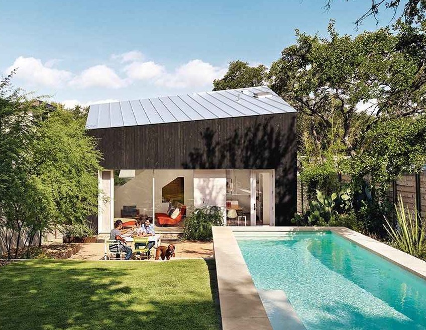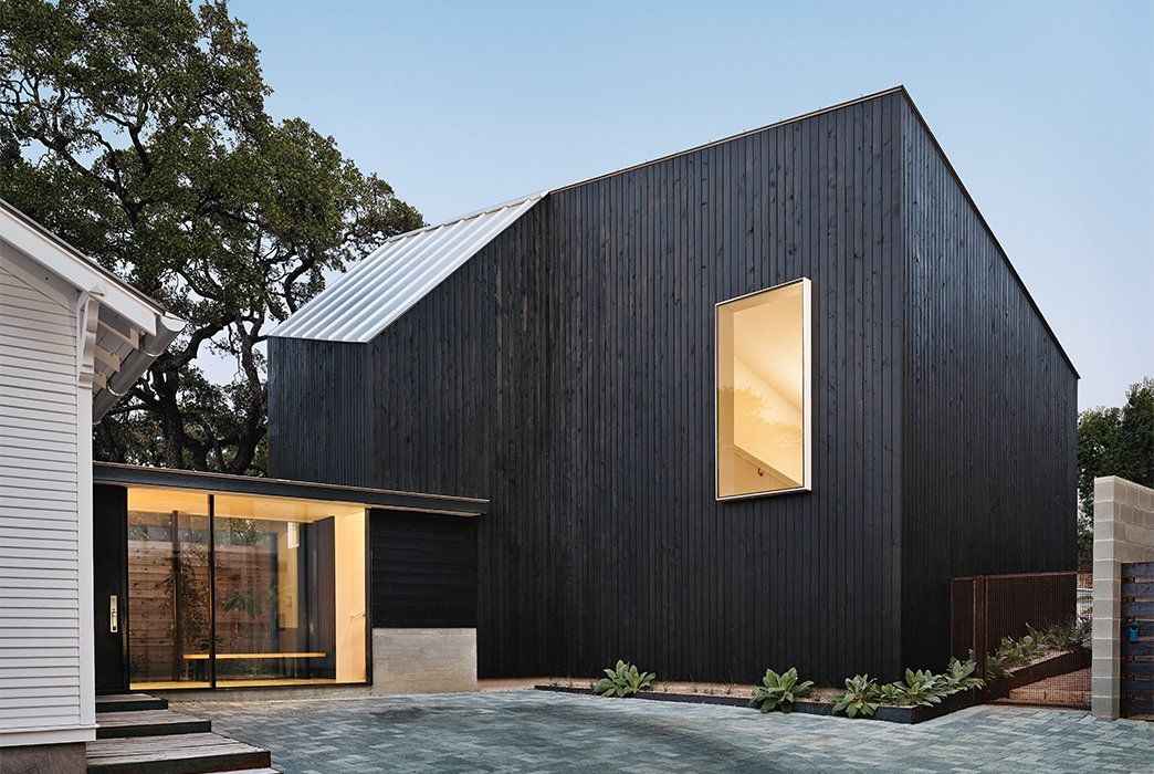 Muzyk Sam Shah i projektantka multimediów Anne Suttles poznali się w Austin, a ich wspólna fascynacja duńską i holenderską architekturą szybko przerodziła się w pasję do tworzenia własnych, świadomych ekologicznie przestrzeni. Para rozpoczęła współpracę z uznanym architektem Kevinem Alterem z Alterstudio, aby stworzyć swój pierwszy, ultra ekologiczny dom z materiałów z recyklingu, wypełniony nowoczesnymi rozwiązaniami proekologicznymi. Sukces projektu sprawił, że Shah, Suttles i Alter ponownie połączyli siły, by odnowić drugi dom pary – inwestycję na przyszłość, która miała łączyć modernistyczną estetykę, zrównoważoną architekturę i funkcjonalność na miarę współczesnej rodziny. Forma nowego założenia w kilku detalach dyskretnie przywodzi nawet na myśl ducha nowoczesnej stodoły.