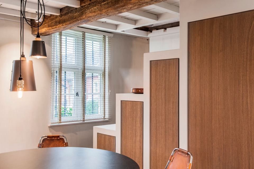 W salonie powstała dopasowana do wnętrza zabudowa meblowa, która mieści książki i osobiste pamiątki mieszkańców. To detale, które nadają wnętrzu charakter i osobowość. Imponujący, zabytkowy kominek został zachowany jako serce przestrzeni dziennej. Drewniane stropy, które zyskały nowe życie dzięki piaskowaniu i impregnacji, kontrastują z białym sufitem oraz nowoczesną ciemną podłogą z systemem ogrzewania podłogowego. Taki zabieg wizualny sprawia, że przestrzeń emanuje spokojem, równowagą i ciepłem.