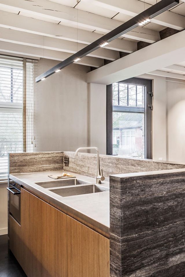 W piwnicy przeprowadzono poważne zmiany – część ścian została usunięta, by uzyskać otwartą i przestronną kuchnię z centralnie ustawioną wyspą kuchenną wykonaną z litego bloku kamienia. Naturalne materiały, takie jak dębowe fornirowane fronty szafek, tworzą przytulny klimat i idealnie wpisują się w estetykę wiejskiej rezydencji. Tradycyjny piec wprowadza nostalgiczny, domowy akcent, a całkowicie odrestaurowane schody prowadzą do dalszych części domu.