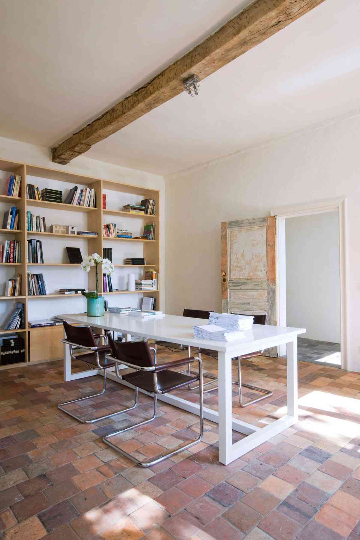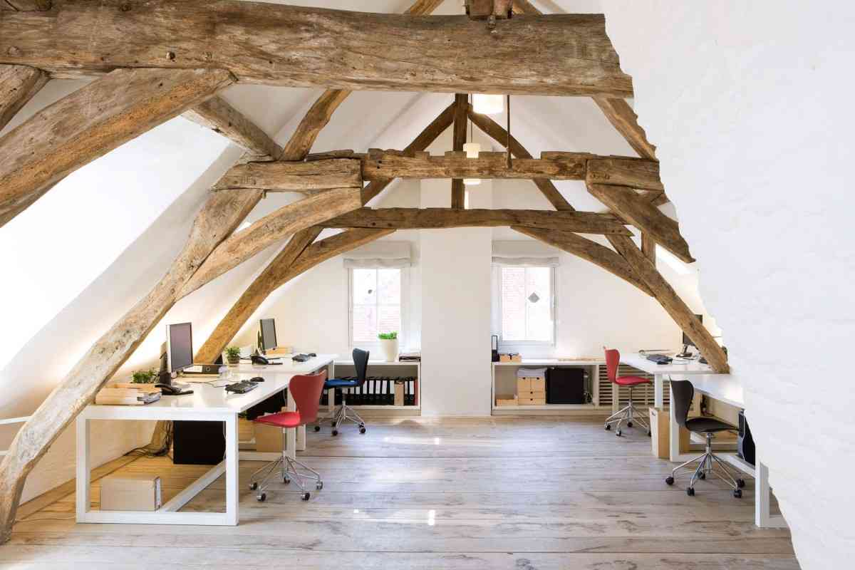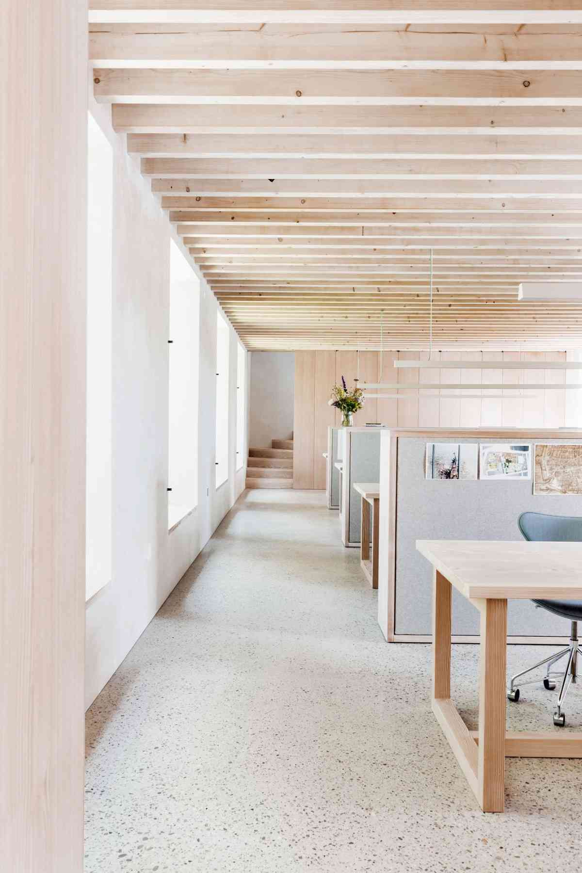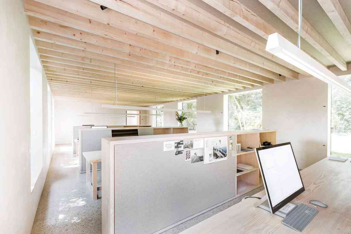 We wnętrzu nowego skrzydła królują gliniane płyty z włóknami naturalnymi, które zapewniają komfort akustyczny, regulację wilgoci i naturalne ciepło. Ściany pokryto drobnoziarnistym tynkiem, a sufity wykonano z filcu wełnianego wplecionego między drewniane belki, poprawiając właściwości akustyczne przestrzeni. Betonowa podłoga w ciepłym odcieniu nadaje wnętrzu równowagi. Meble wykonane na zamówienie z drewna sosnowego wpisują się w minimalistyczny, ale przyjazny klimat. Otwarte przestrzenie robocze oddzielone są regałami – wystarczająco wysokimi, by zapewnić prywatność, a jednocześnie niskimi, by sprzyjać interakcjom. To harmonijne połączenie zabytku i współczesnej architektury, w którym nowoczesna stodoła staje się symbolem odpowiedzialnego projektowania i funkcjonalności.