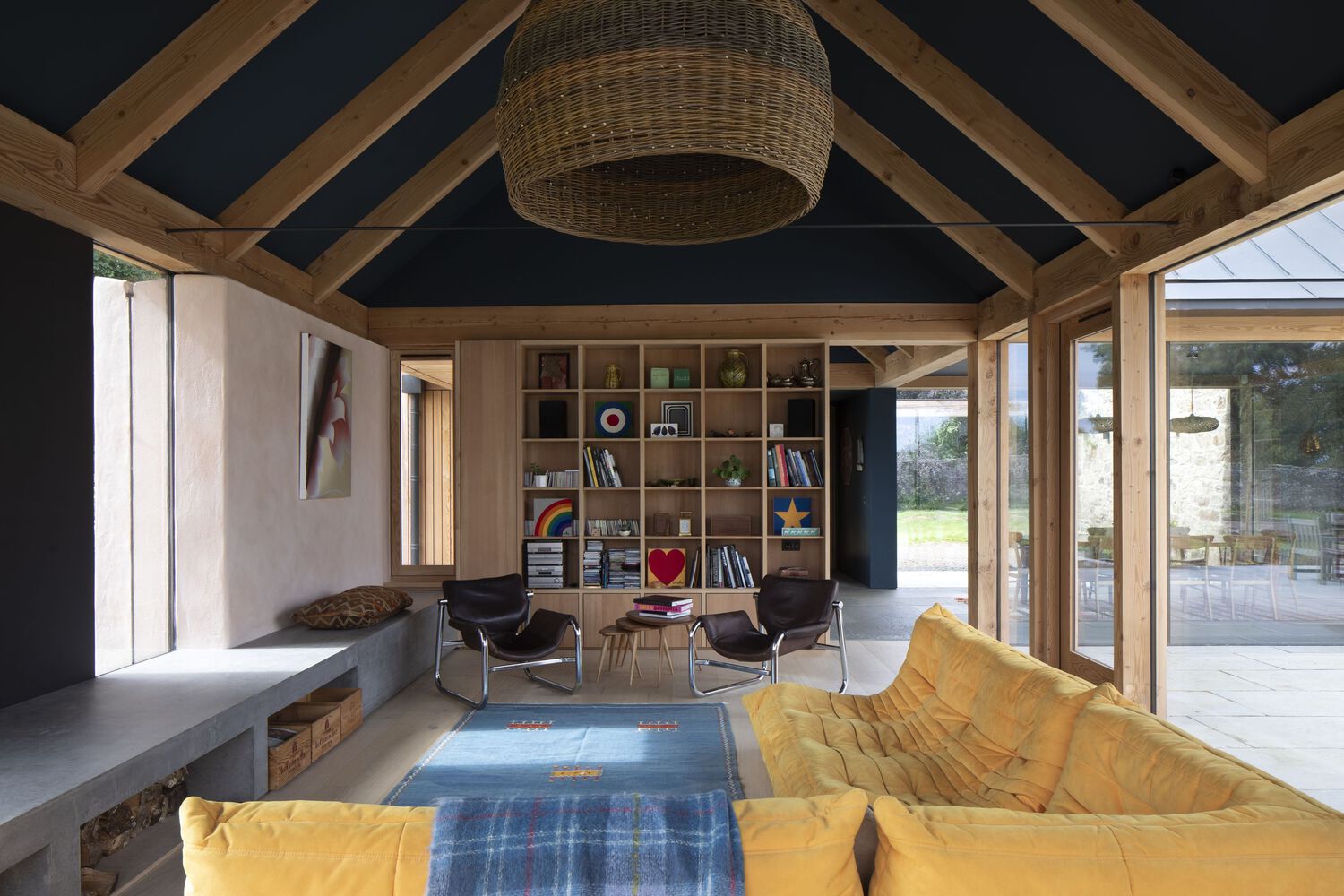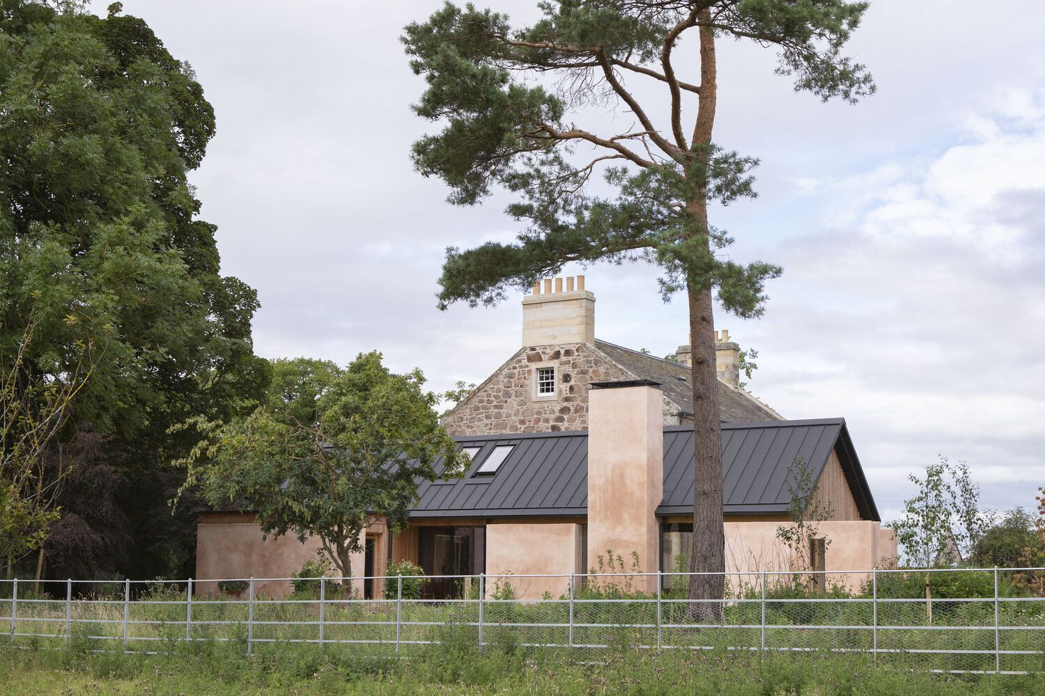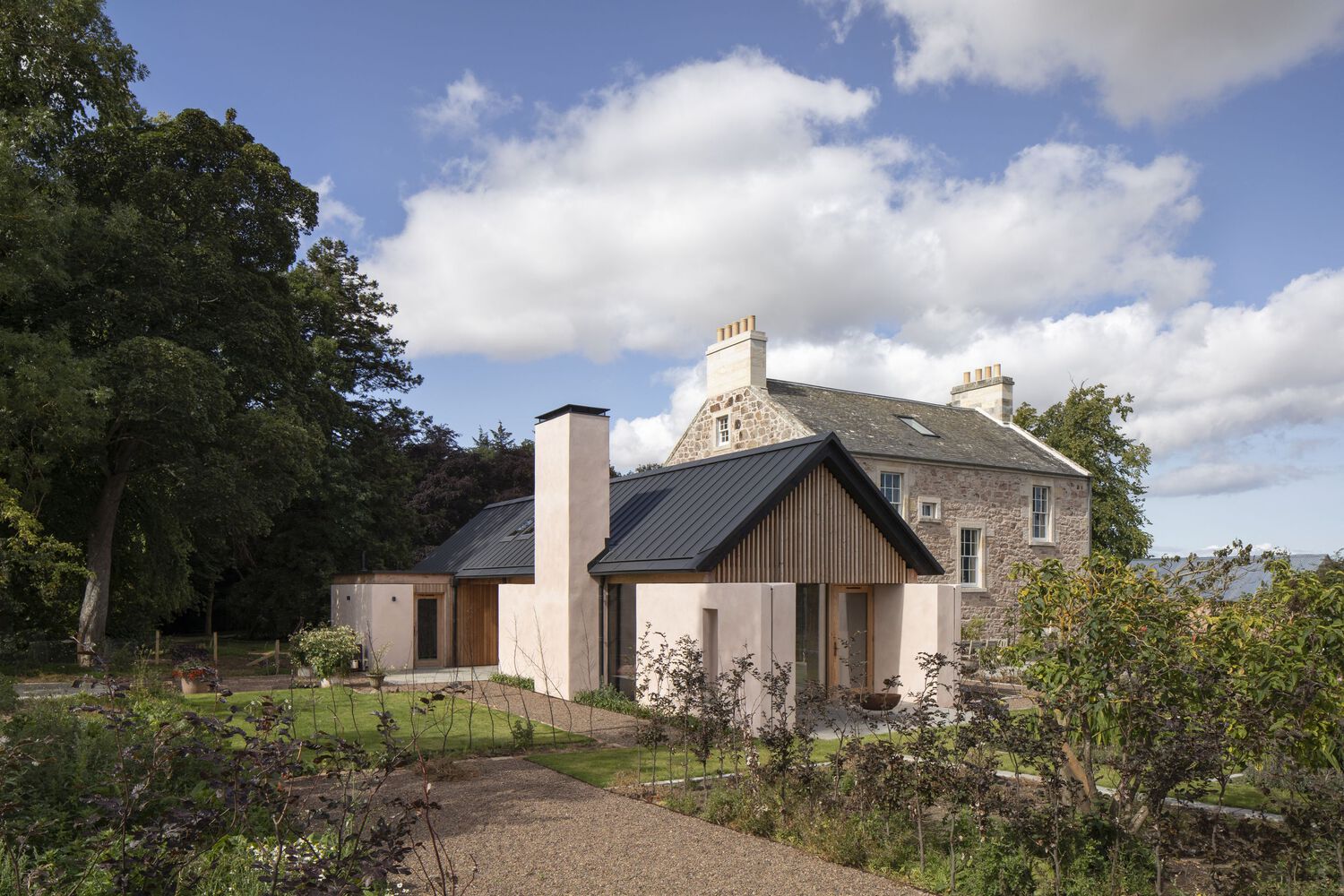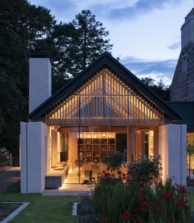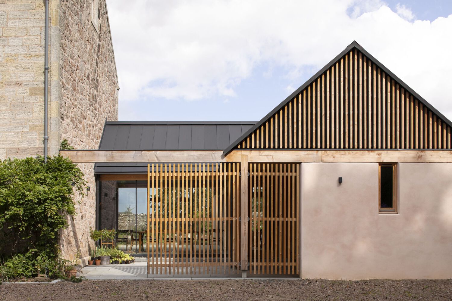 Oprócz tych ścian, większość konstrukcji rozszerzenia jest wyciosana z pozyskiwanej w zrównoważony sposób jodły brytyjskiej Douglasa, co znajduje odzwierciedlenie w drzwiach i dużych przeszkleniach, a także uzupełnia zewnętrzna okładzina i ekrany z modrzewia. Bezramowe detale przeszkleń zostały opracowane skrupulatnie, aby wyrazić lekkość kontrastującą z masą nowych wapiennych ścian. Nowy dach z ręcznie tłoczonego cynku unosi się nad rozszerzeniem.