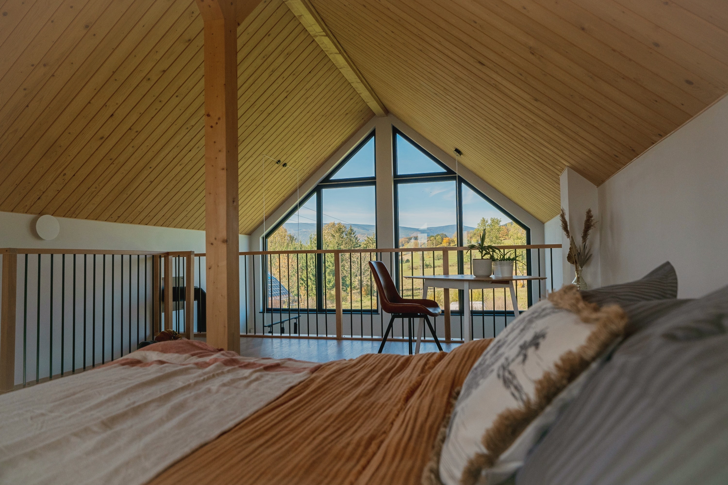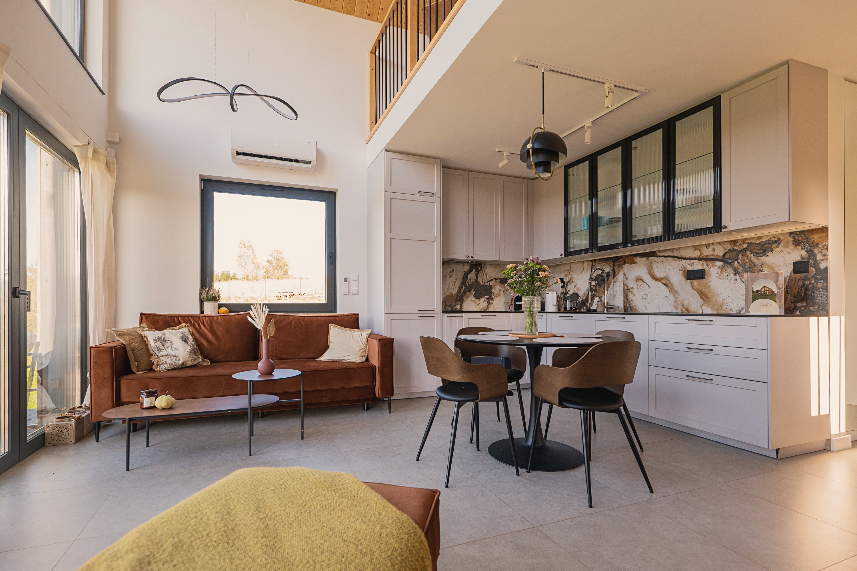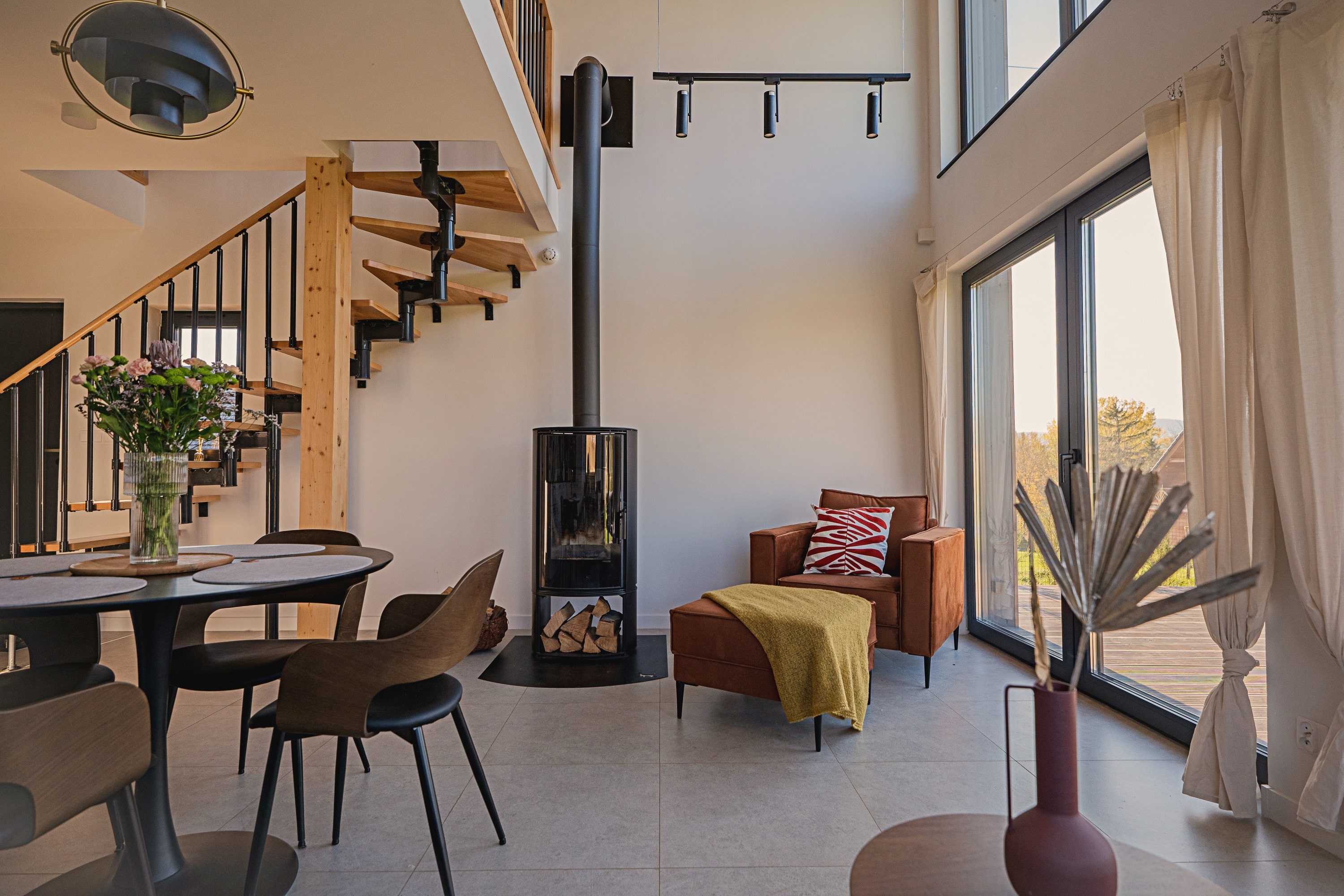 Drewniane akcenty, duże przeszklenia, kominek w sercu salonu i jacuzzi na tarasie – wszystko to tworzy atmosferę idealną zarówno do odpoczynku, jak i pracy zdalnej w otoczeniu natury. Ten dom z jacuzzi łączy nowoczesny komfort z naturalnym urokiem miejsca. Inteligentne rozwiązania smart home dopełniają całości, czyniąc z Kasztanowej 14 przestrzeń, w której technologia staje się niewidzialnym wsparciem codzienności.