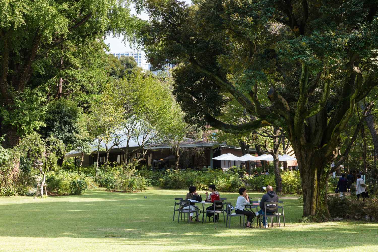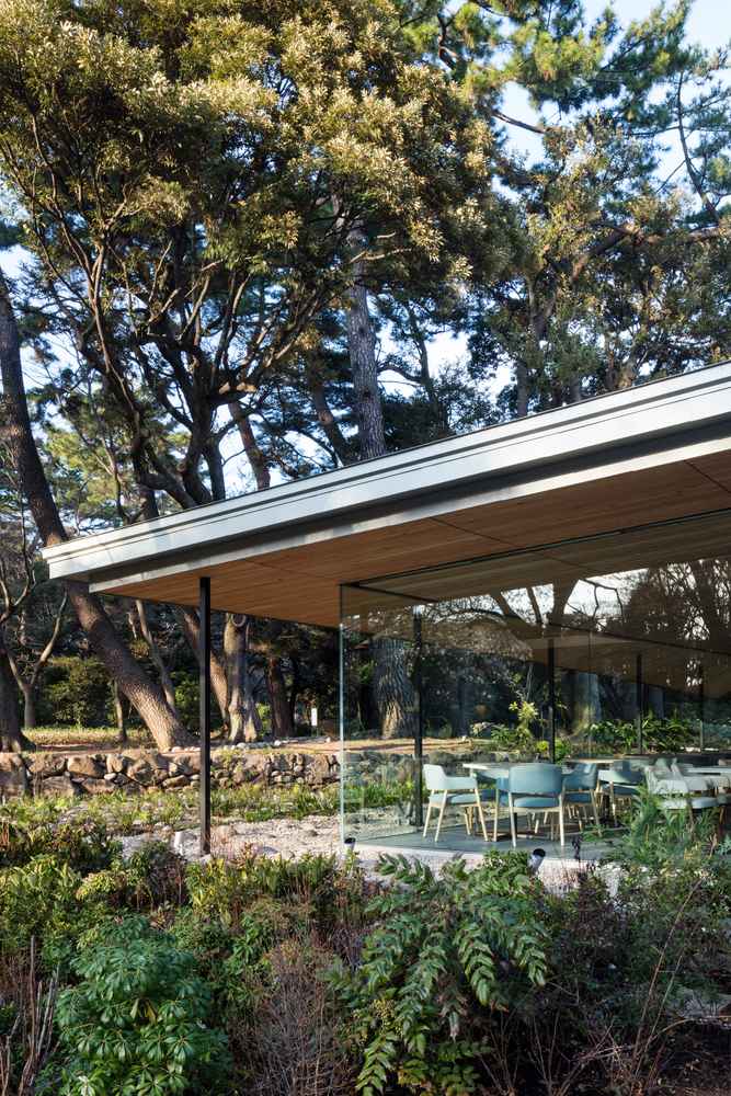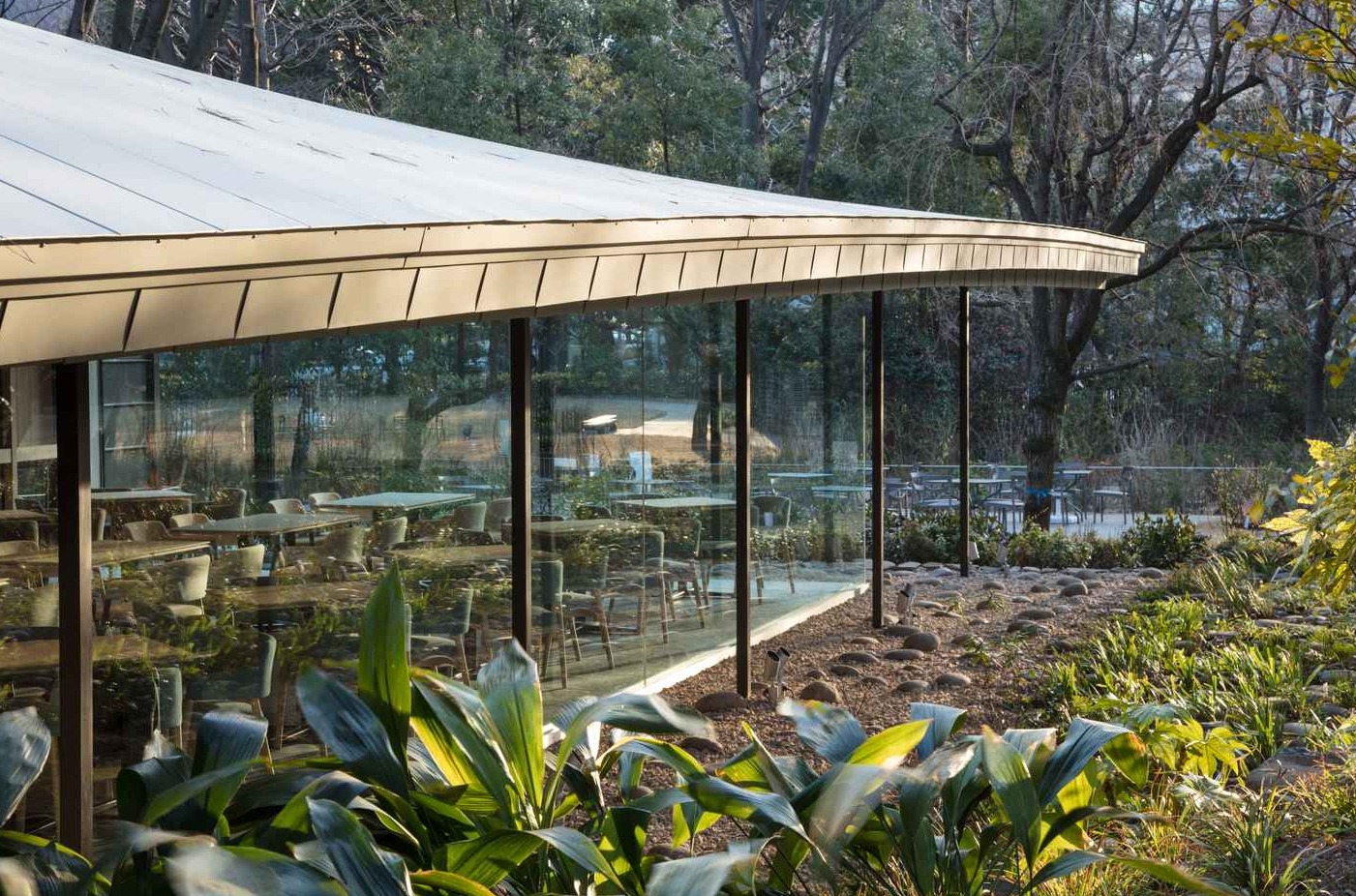 Władze Tokio przeprowadziły kompleksową renowację Teien Art Museum, obejmując przebudowę głównego budynku oraz wzmocnienie zabytkowej herbaciarni na wypadek wstrząsów sejsmicznych. Najważniejszym elementem inwestycji stała się nowa restauracja o powierzchni 253 m², zaprojektowana przez KUME SEKKEI. Obiekt powstał w południowej części działki, gdzie utworzono przestronny ogród, otoczony zabytkowymi budynkami i bujną zielenią—rzadko spotykaną w centrum Tokio. Projekt od początku zakładał maksymalne powiązanie architektury z naturą, wykorzystanie naturalnego światła oraz ochronę unikatowego krajobrazu.