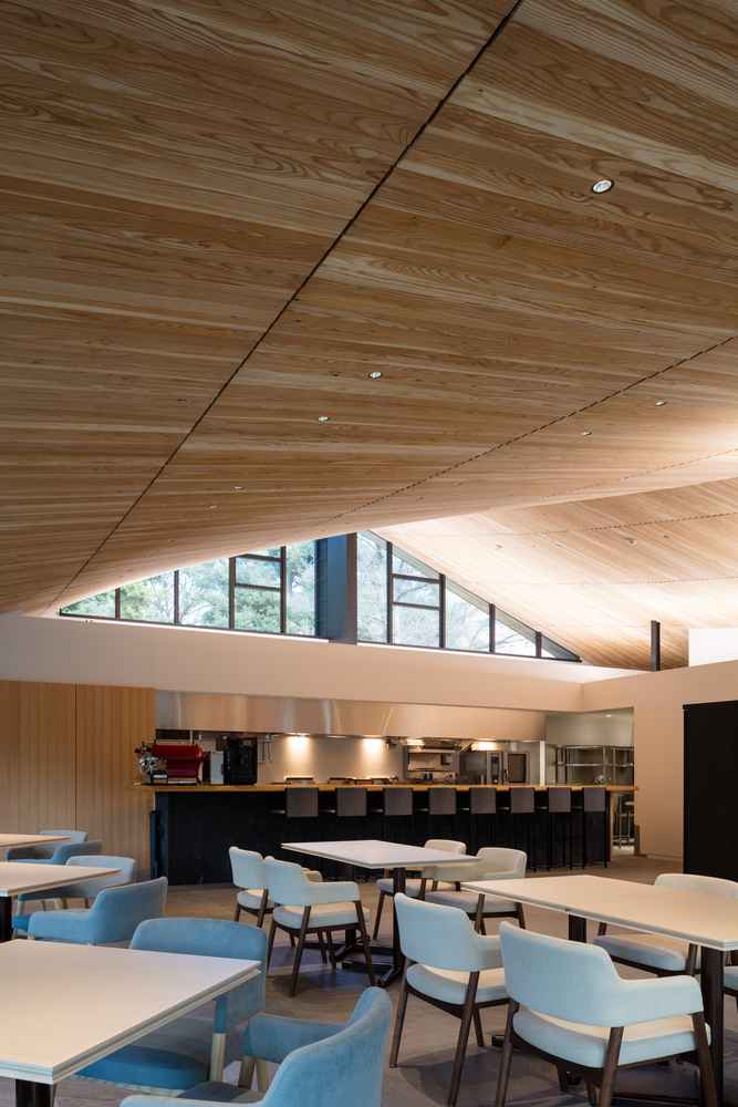 Architekci skupili się na trzech kluczowych aspektach: widokach, terenie oraz otaczających drzewach. Restauracja została otwarta na zachodnie i północne widoki dzięki dużym przeszkleniom pozbawionym pionowych ram, co pozwala na pełne zanurzenie w otoczeniu. Wydłużone, niskie okapy dachowe blokują intensywne światło zachodzącego słońca, a od wschodu zastosowano przeszklone partie wpuszczające miękkie, naturalne światło. Kształt budynku odwzorowuje linię grzbietową terenu, a dach o zakrzywionej formie umożliwia zsuwanie się liści i naturalne oczyszczanie połaci deszczem, jednocześnie nadając wnętrzu ciekawą dynamikę i optymalne doświetlenie.