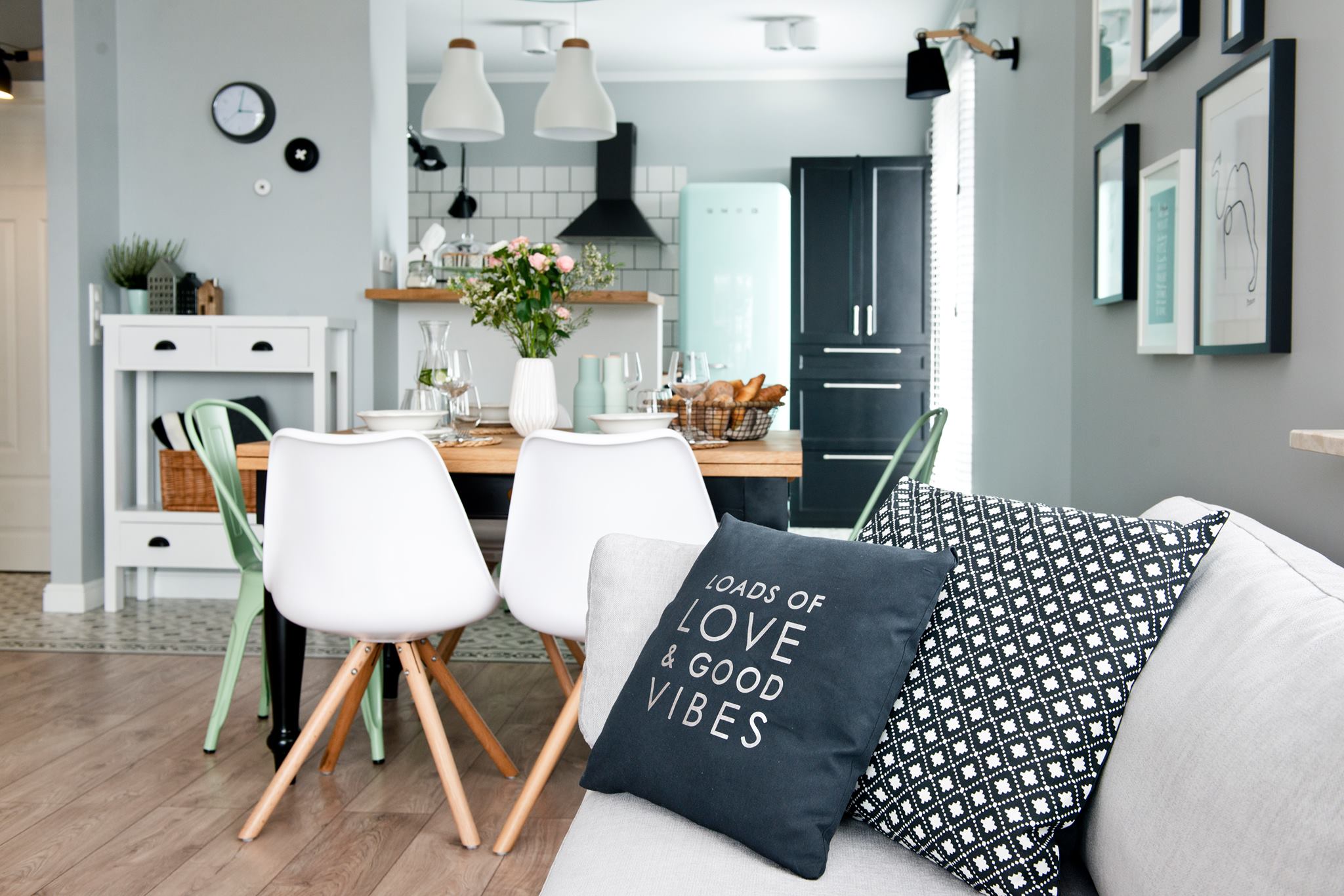 Genialnie zaprojektowane mieszkanie w stylu retro zachwyca spójnym połączeniem industrialnych sprzętów, bielonych mebli z wiklinowymi koszami oraz kultowych elementów designu, takich jak lodówka Smeg. Charakter wnętrza podkreśla mozaikowa podłoga w kuchni oraz subtelne, miętowe odcienie pojawiające się na meblach, dodatkach i dekoracjach. To wnętrze idealnie balansuje pomiędzy estetyką retro, industrialnym stylem oraz nowoczesnymi rozwiązaniami, nawiązując do trendów takich jak nowoczesna stodoła, gdzie liczy się autentyczność materiałów i funkcjonalność przestrzeni.