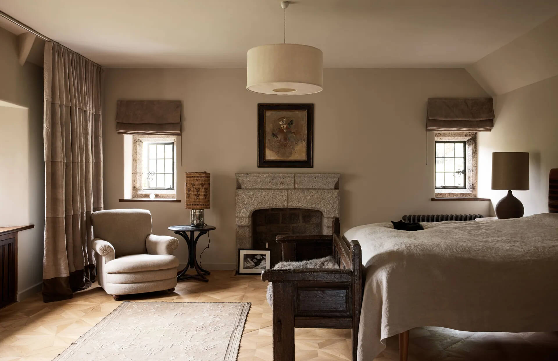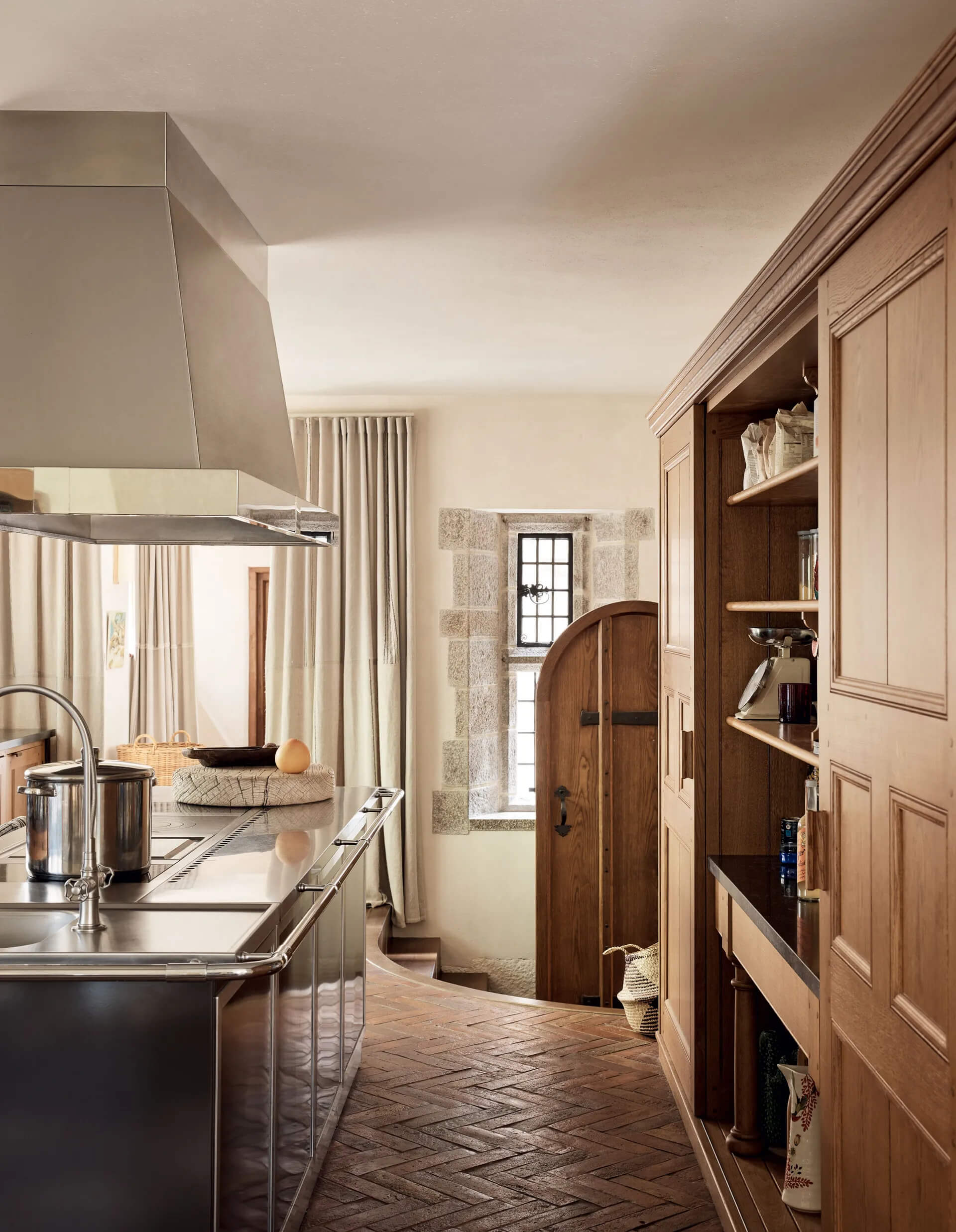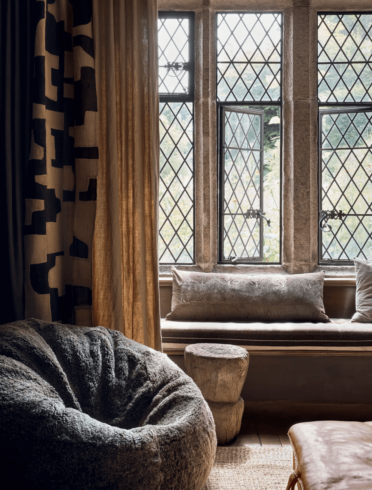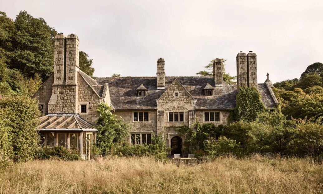 Kiedy cztery lata temu właścicielka po raz pierwszy zobaczyła ten dom, najbardziej urzekł ją ogród oraz otaczający go teren. „Mieszkałam w Londynie, ale pragnęłam odrobiny dzikości” – mówi. Miękkość ogrodu równoważy ciężar domu, którego granitowe ściany przepruto oknami z kamiennymi słupkami, a dach zwieńczono szczytami i usiano wysokimi, kwadratowymi kominami. Budynek, który posiada elementy stylu Tudorów i gotyku, przeszedł przebudowę XVII-wiecznego obiektu z początku XX wieku. Nie tylko powiększono go o pomieszczenia na poddaszu, hol wejściowy oraz kaplicę na pierwszym piętrze, ale także rozbudowano stajnie i stodoły.