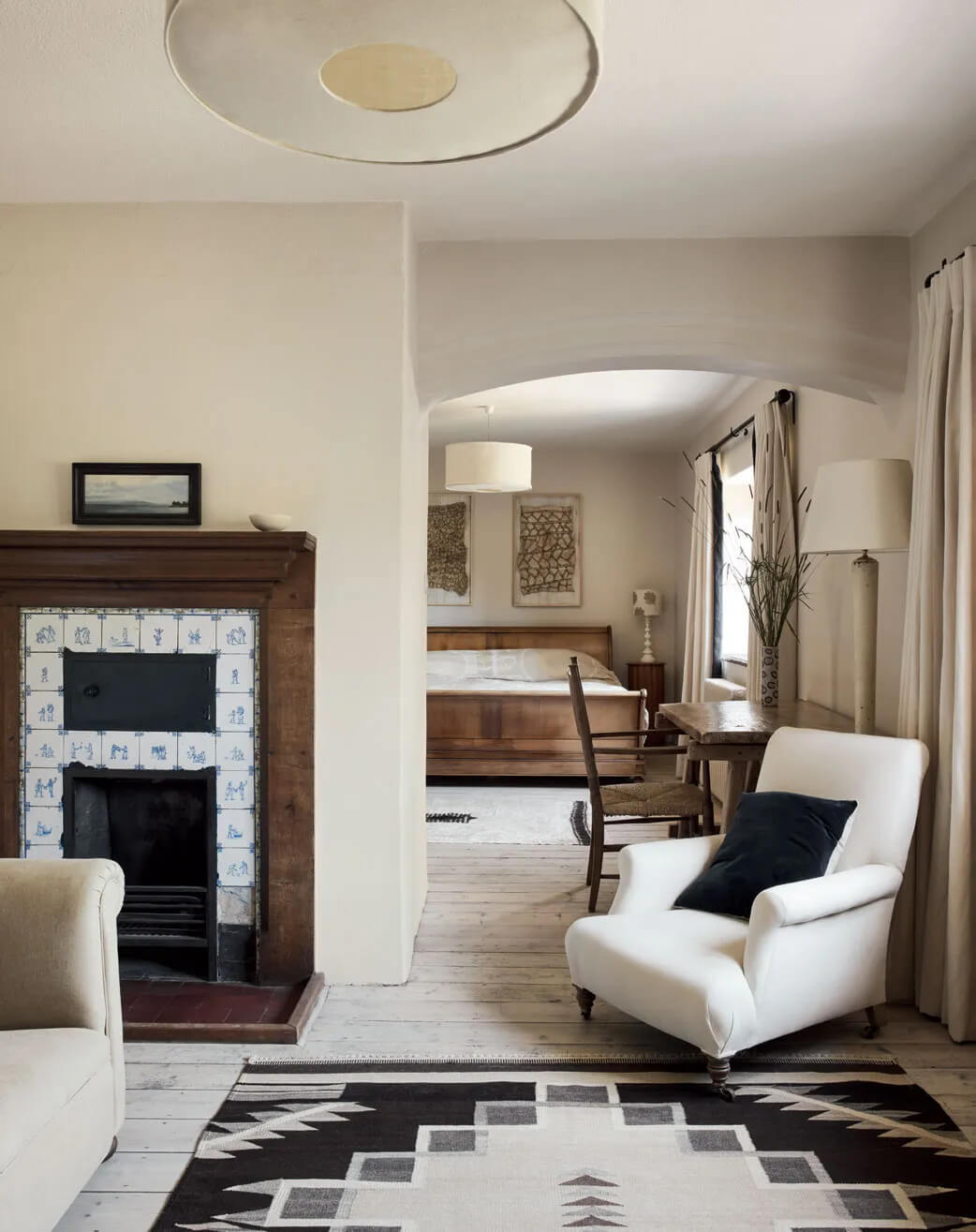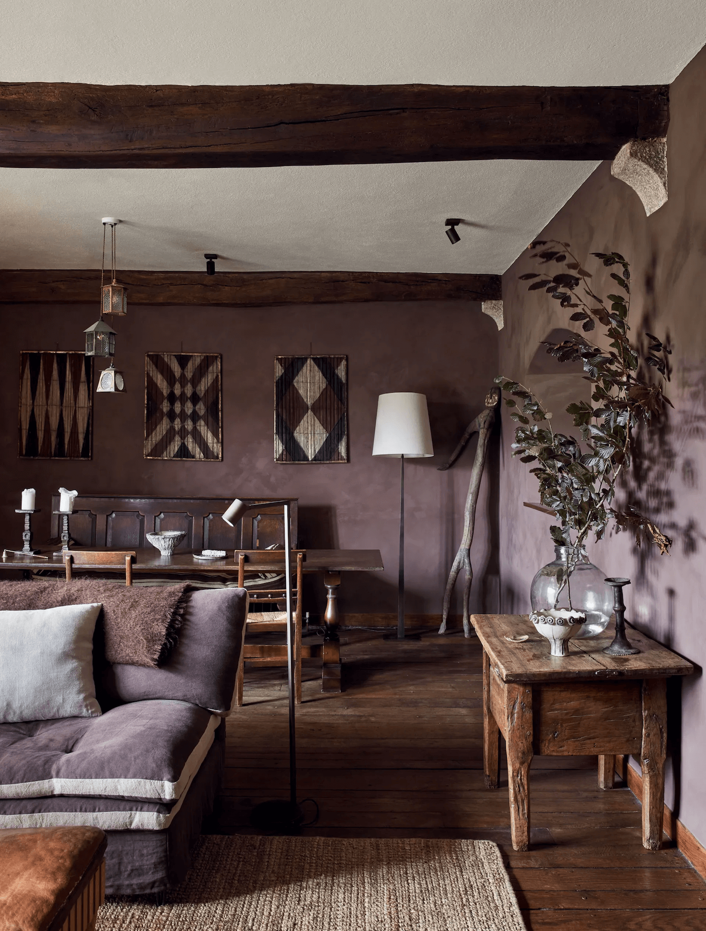 „To niezwykły dom, mający swój mocny charakter” – mówi Maria, właścicielka firmy Retrovius. Pracując wokół odziedziczonych, dużych łóżek, Maria wprowadziła kolor, wzór i fakturę do sześciu sypialni na pierwszym piętrze, mieszając dywaniki, pościel i antyczne tkaniny. Na parterze, komfort zapewniają kudłate runa owiec gotlandzkich, które udekorowały krzesła, ławy przy stole w kuchni oraz długie stołki pod ścianą w przedpokoju. „Chcieliśmy wprowadzić kolor i ciepło” – wyjaśnia Maria. „Czułam się trochę, jakbyśmy upierzali lekko kłujące gniazdo”.