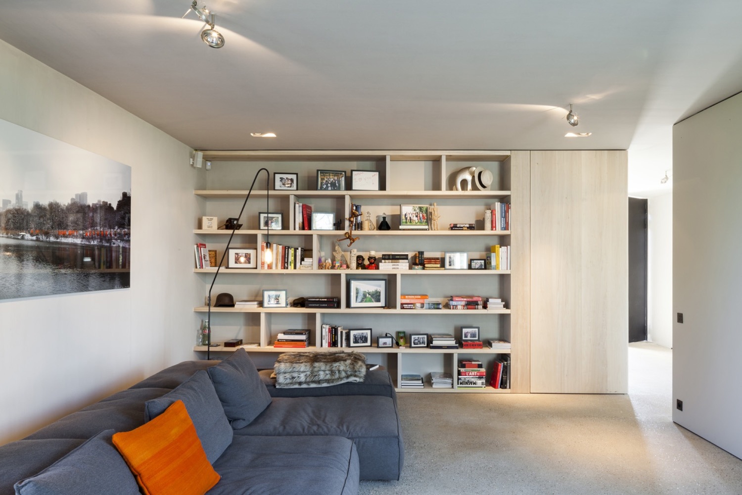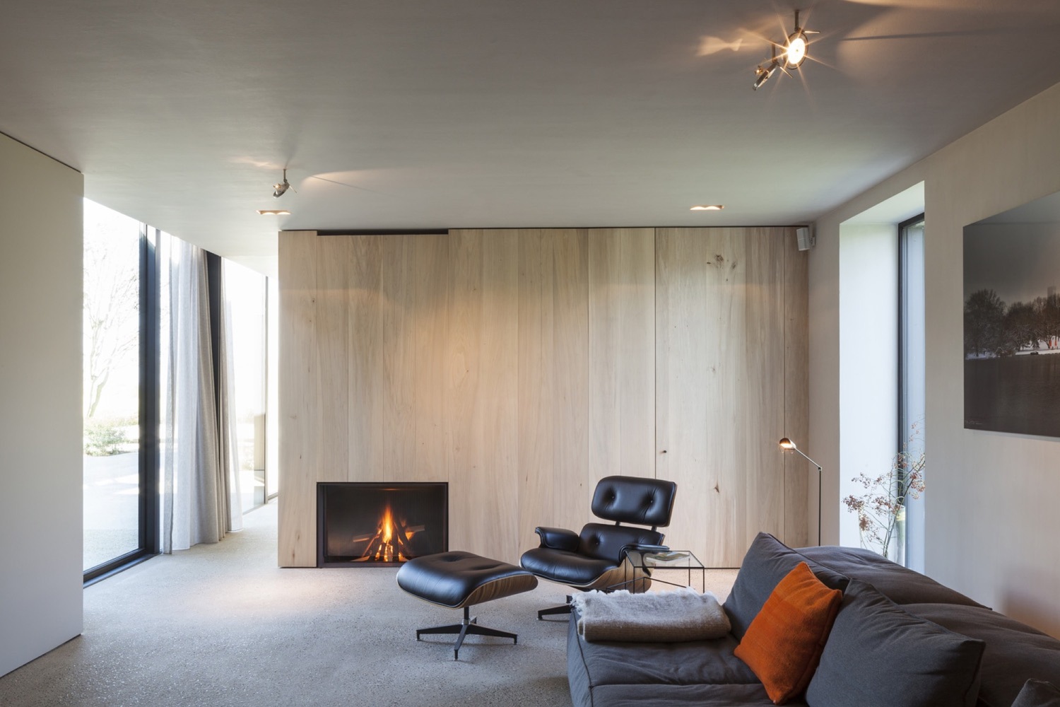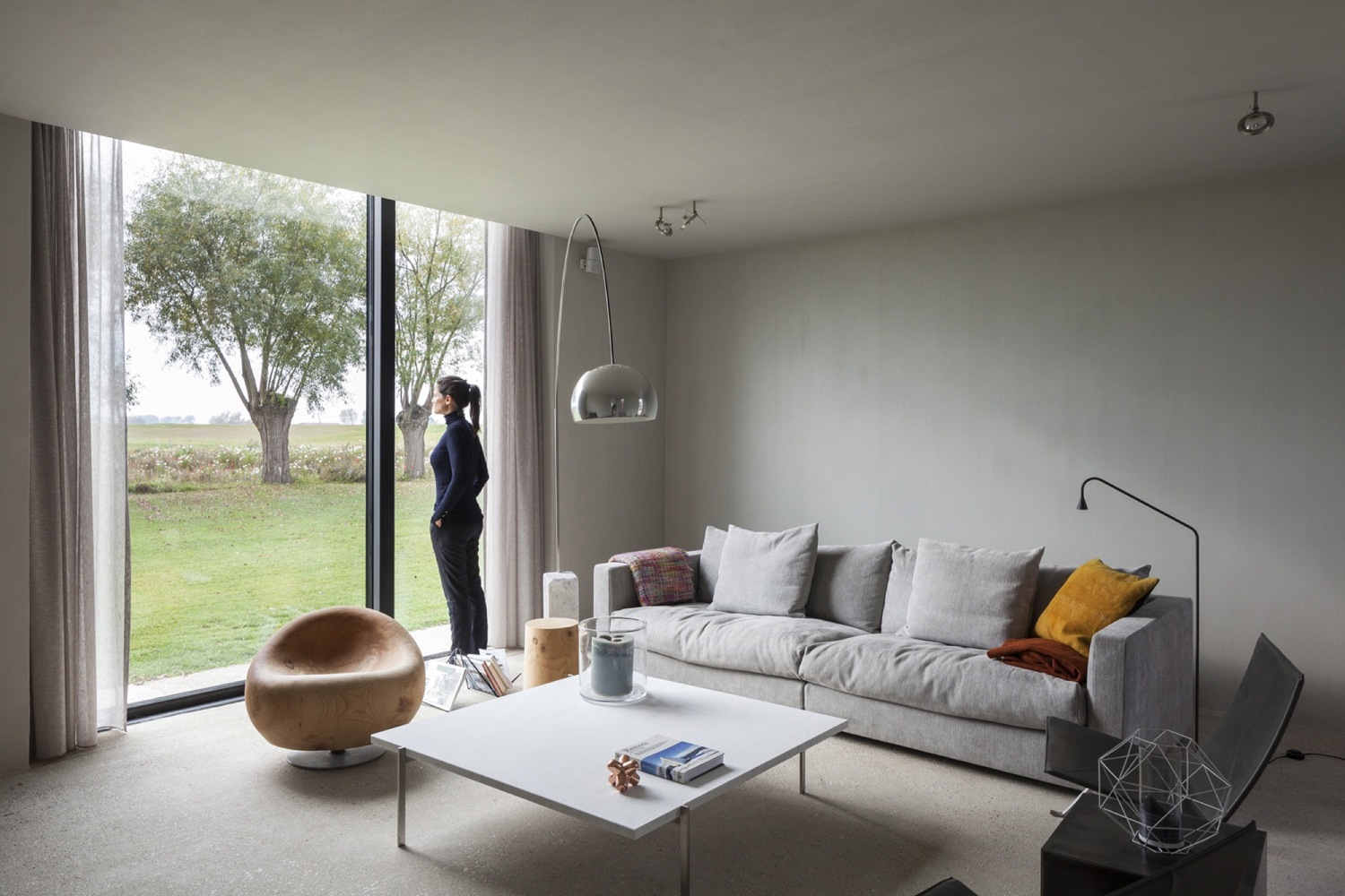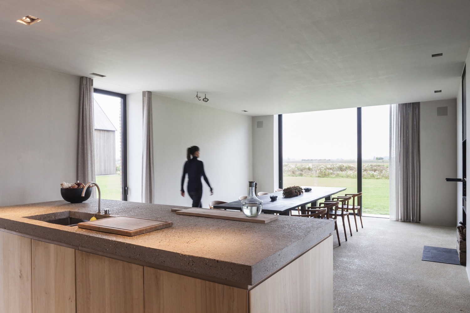 Nowo zaprojektowana przestrzeń nawiązuje do charakterystycznego układu wiejskich domostw, gdzie pomieszczenia rozmieszczone są w enfiladzie. Połączenie chropowatego betonu, delikatnie zaokrąglonych tynków oraz odsłoniętych, odrestaurowanych drewnianych belek stropowych wzbogaca wnętrze o wyjątkowy klimat. Podobnie jak dawna twierdza, dom jest skierowany do wewnątrz – strefy pracy i czytania otwierają się na dziedziniec, a betonowe posadzki płynnie łączą wnętrze z przestrzenią zewnętrzną, przywołując skojarzenia z dawnymi platformami dla dział. W przeciwieństwie do zamkniętej, fortecznej struktury, przestrzeń mieszkalna została szeroko otwarta na krajobraz polderów.