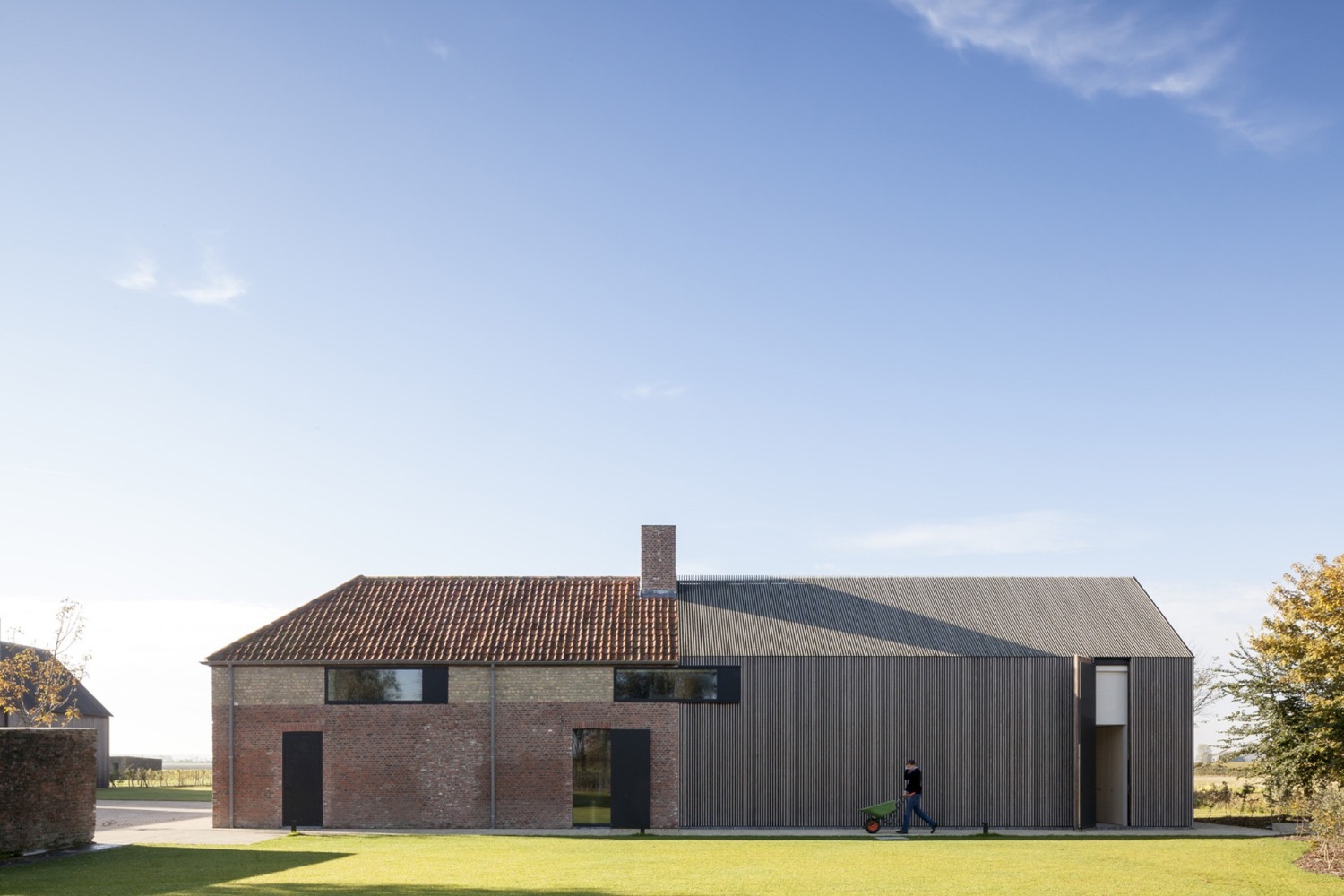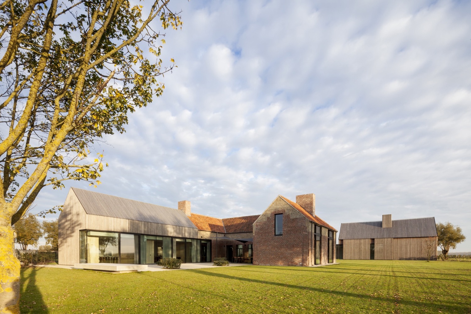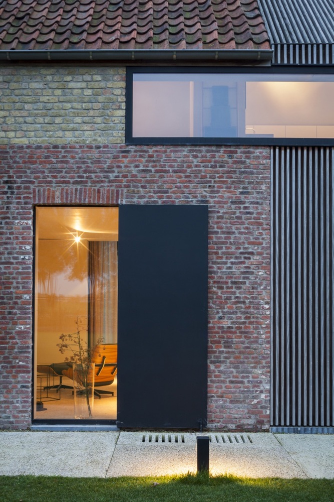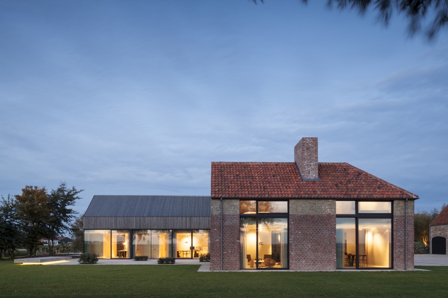 Aby zachować spójność funkcjonalną kompleksu, nowo powstały podziemny korytarz łączy odrestaurowane gospodarstwo z rozbudowaną stodołą. W tej części projektu konsekwentnie zachowano te same proporcje i materiały, jednak obiekty przeznaczone na pokoje gościnne zostały nieco przesunięte względem siebie, co nadaje całości subtelnej dynamiki. Przeszklona część wokół basenu i kuchni dla gości łączy ceglane i drewniane struktury w spójną kompozycję. Tak jak w dawnych stodołach znajdowały się okiennice, tak i w nowej zabudowie zastosowano przesuwne fasady, które umożliwiają całkowite zamknięcie przestrzeni gościnnej.