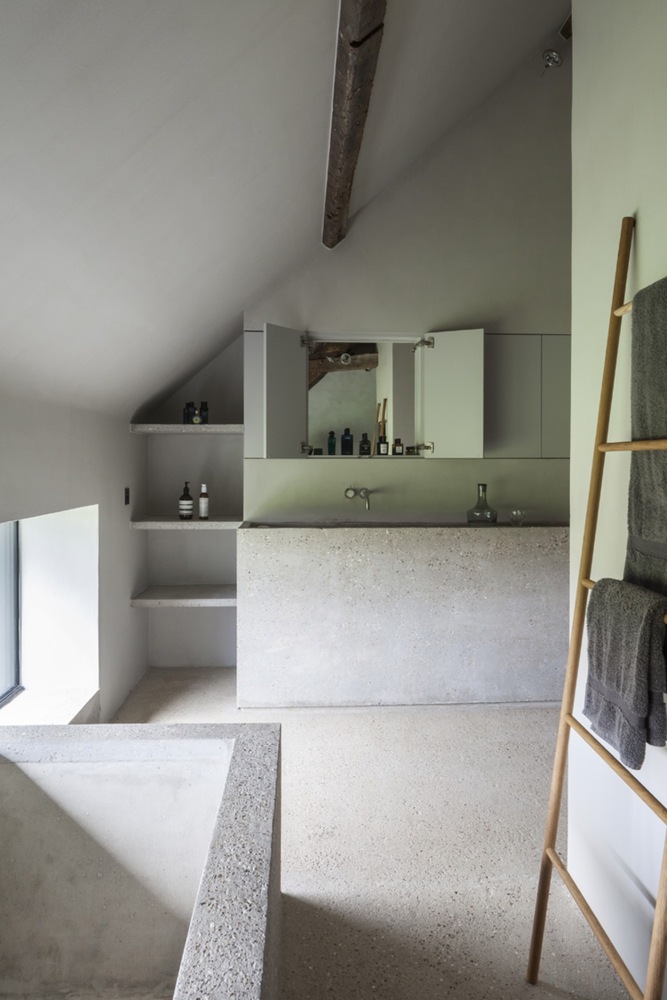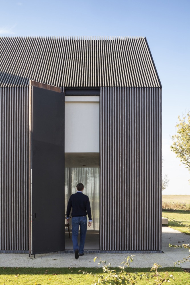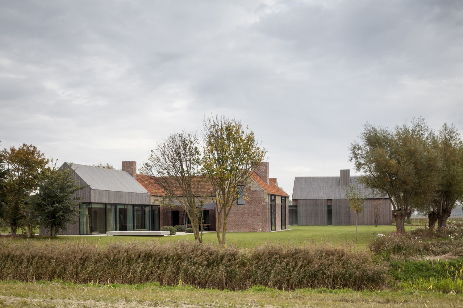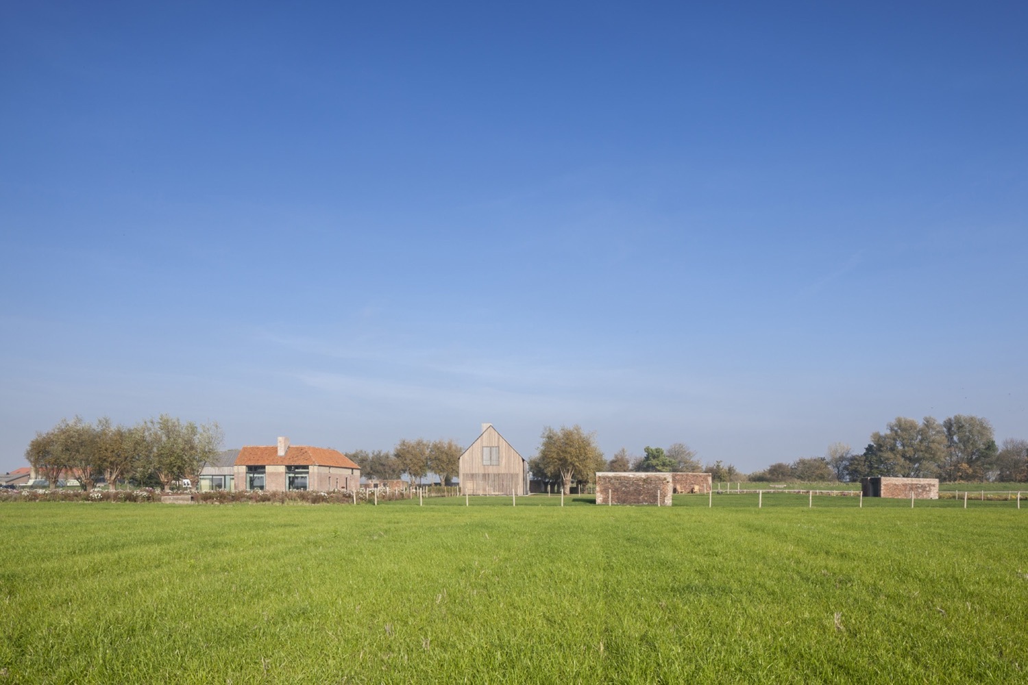 Aby zachować spójność funkcjonalną kompleksu, nowo powstały podziemny korytarz łączy odrestaurowane gospodarstwo z rozbudowaną stodołą. W tej części projektu konsekwentnie zachowano te same proporcje i materiały, jednak obiekty przeznaczone na pokoje gościnne zostały nieco przesunięte względem siebie, co nadaje całości subtelnej dynamiki. Przeszklona część wokół basenu i kuchni dla gości łączy ceglane i drewniane struktury w spójną kompozycję. Tak jak w dawnych stodołach znajdowały się okiennice, tak i w nowej zabudowie zastosowano przesuwne fasady, które umożliwiają całkowite zamknięcie przestrzeni gościnnej.