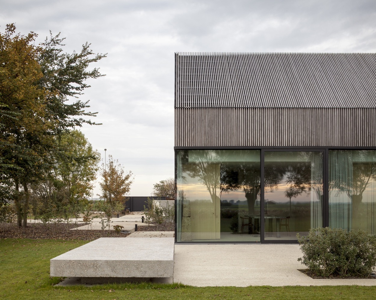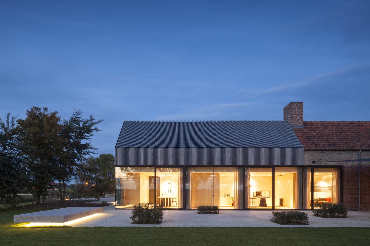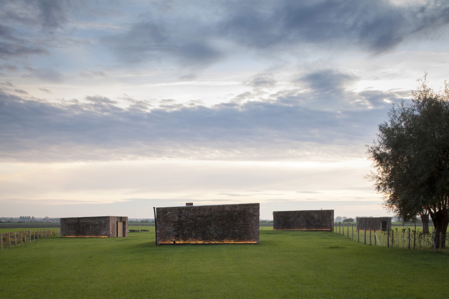 Cały projekt nie tylko przywraca gospodarstwu i stodole nową funkcję, ale również podkreśla historię fortyfikacji, tworząc spójną narrację łączącą przeszłość i teraźniejszość. Światło odgrywa w tym kluczową rolę – subtelne iluminacje podkreślają dawne betonowo-ceglane bunkry z czasów I wojny światowej, nadając im wymiar niemal monumentalny.