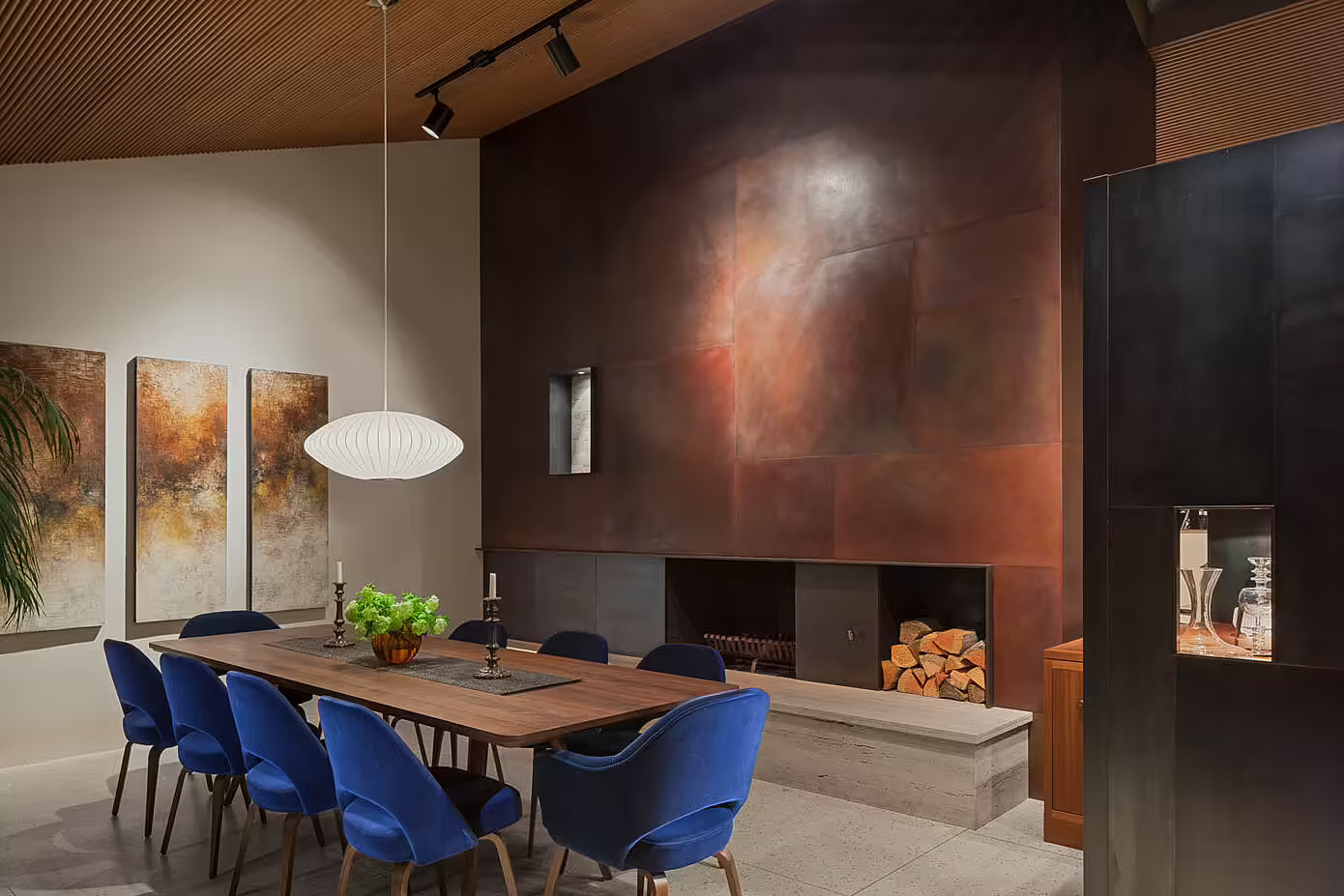 Kuchnia została przeniesiona do centralnej części domu, obok wejścia. Otwartą przestrzeń stworzono z wykorzystaniem oryginalnych drewnianych szafek, uzupełnionych o niestandardowe szafki ze stali nierdzewnej, które pełnią również funkcję estetycznego zakończenia korytarza. Dawne pomieszczenie kuchenne zamieniono w funkcjonalną spiżarnię, idealną do obsługi większych przyjęć.