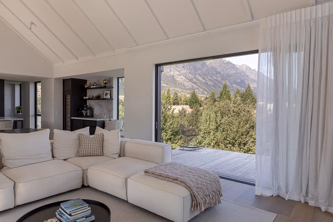 Wejście do domu prowadzi przez przestronny hol z podłogą z klasycznego parkietu, który płynnie przechodzi w centralnie usytuowaną kuchnię oraz imponujący salon z wysokim sklepieniem. Duże przeszklenia otwierająwnętrza na panoramiczne widoki gór, jednocześnie zapewniając dopływ naturalnego światła przez cały dzień. Całość aranżacji cechuje prostota, elegancja i subtelne nawiązania do szkockiego dziedzictwa właścicieli oraz ich podróży po Europie.