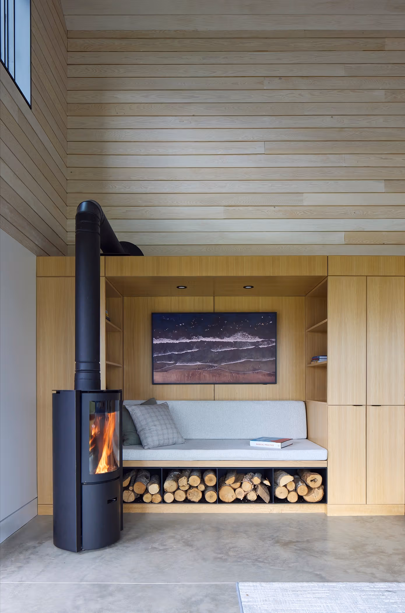 Wnętrza otwierają się na krajobraz poprzez szerokie przeszklenia sięgające od podłogi do sufitu. Przestrzenie wspólne – salon, jadalnia i kuchnia – wypełnia światło, które wędruje po strukturze drewna i odbija się od linii plaży. Część prywatna, z sypialniami ukrytymi w głębi bryły, zachowuje ciszę i poczucie bezpieczeństwa.