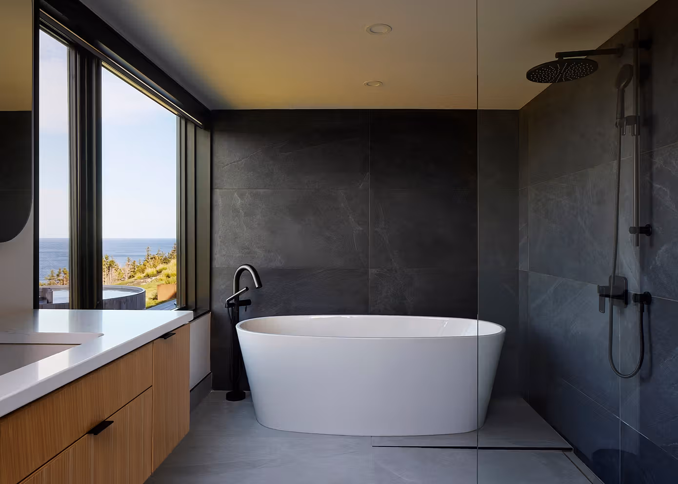 Domy ustawiono wzdłuż naturalnego grzbietu, który opada ku cieśninie Northumberland Strait. Od zachodu rozciąga się widok na otwarte morze, od wschodu – na niskie góry porośnięte lasem. Każdy z budynków został precyzyjnie ustawiony tak, by maksymalnie wykorzystać widoki i naturalne osłony przed wiatrem, tworząc równowagę między ekspozycją a intymnością.