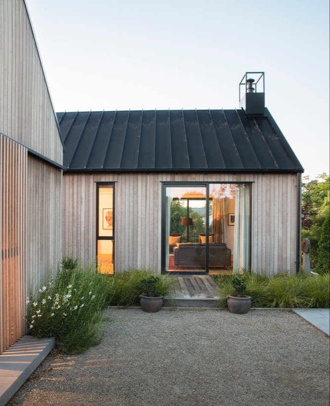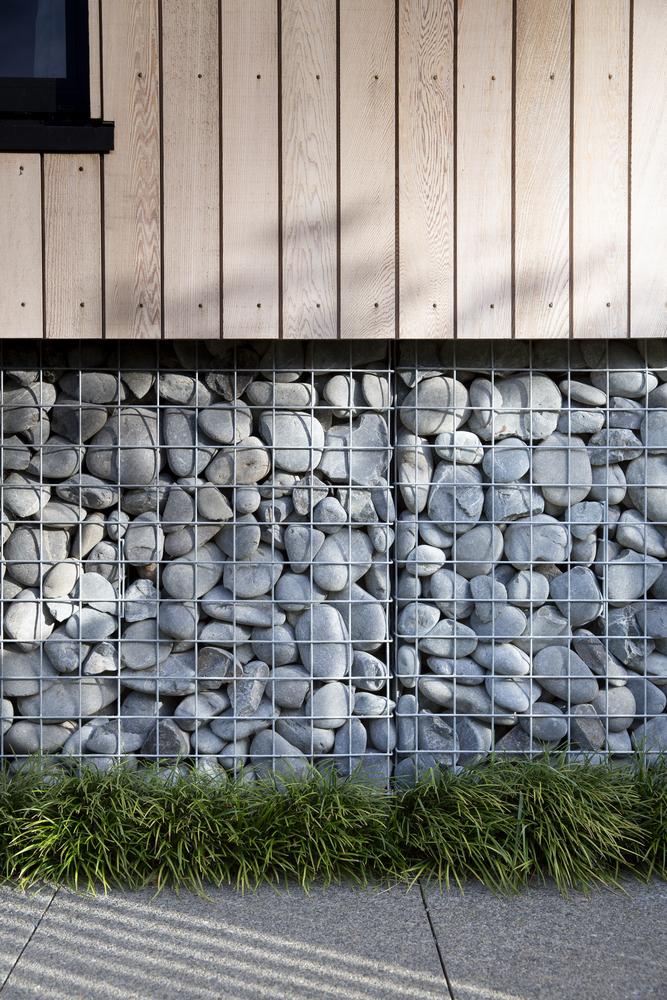 Wykończenie budynku to naturalna cedr i kosze gabionowe wypełnione kamieniami rzecznymi, które współgrają z otoczeniem. Dach pokryty czarną stalą kontrastuje z ciepłem drewna, a betonowe skrzydło mieści przestrzenie techniczne. Duże przeszklenia wpuszczają do wnętrza światło i otwierają widoki na otaczającą zieleń, a przesuwne żaluzje z drewna zapewniają prywatność i ochronę przed słońcem.