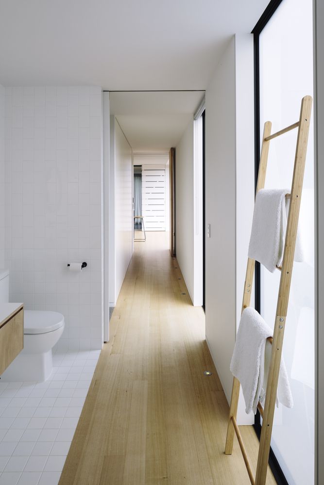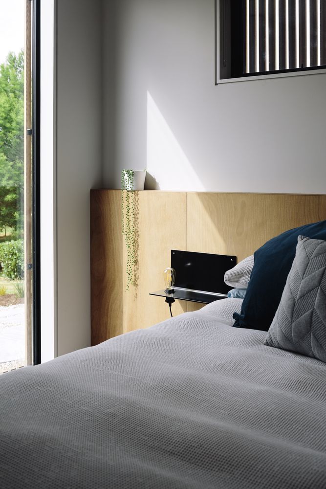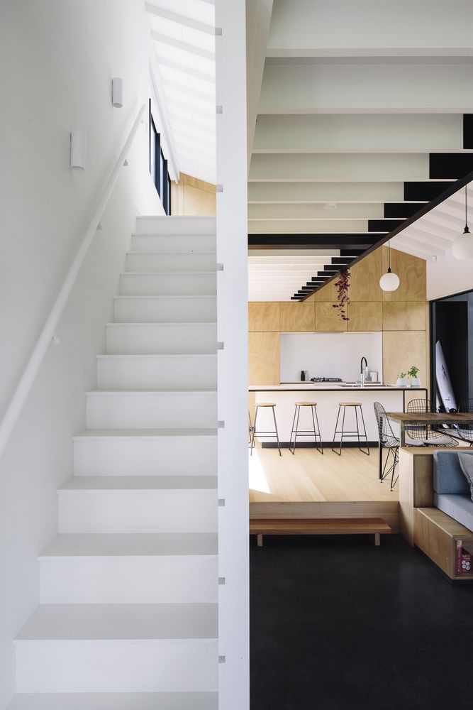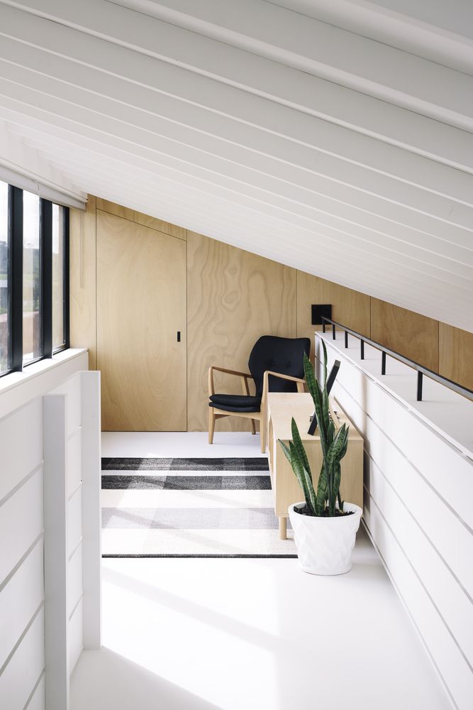 Wnętrze domu to otwarta przestrzeń dzienna z kuchnią wykończoną podłogą z dębu tasmańskiego i jadalnią, która płynnie łączy się z salonem pełnym światła. Antresola, przestrzeń na książki i starannie dobrane detale stalowe oraz ramy okienne tworzą przytulną, a zarazem nowoczesną atmosferę. Naturalne materiały, brak progów i płynne przejścia między strefami pozwalają w pełni korzystać z widoków i światła, podkreślając minimalistyczny charakter domu i jego inspirację rozwiązaniami znanymi z nowoczesnej stodoły.