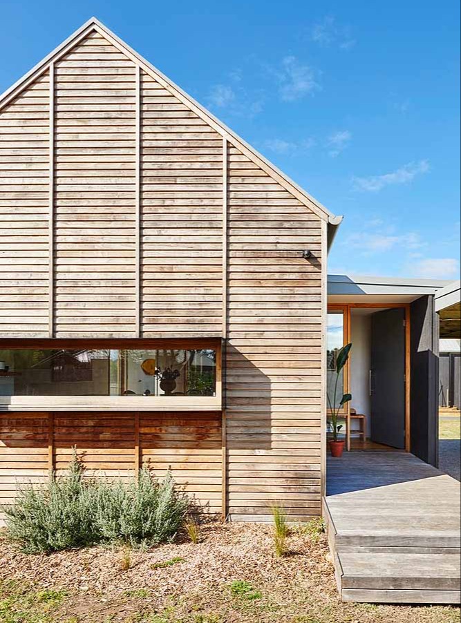Projektem wyróżniają się dwa pawilony, które zostały połączone zastosowaniem szkła. Okna na całej wysokości oraz dwu-spadowy dach wprowadzają do wnętrza mnóstwo naturalnego światła, tworząc przyjazną atmosferę do życia. Pawilon frontowy jest pokryty lokalnym drewnem eukaliptusowym, co dodaje mu wyjątkowego charakteru, podczas gdy pawilon tylny w kształcie litery „L” ma czarną elewację, co pozwala na wyeksponowanie drewna eukaliptusowego i wysunięcie tej konstrukcji na pierwszy plan.