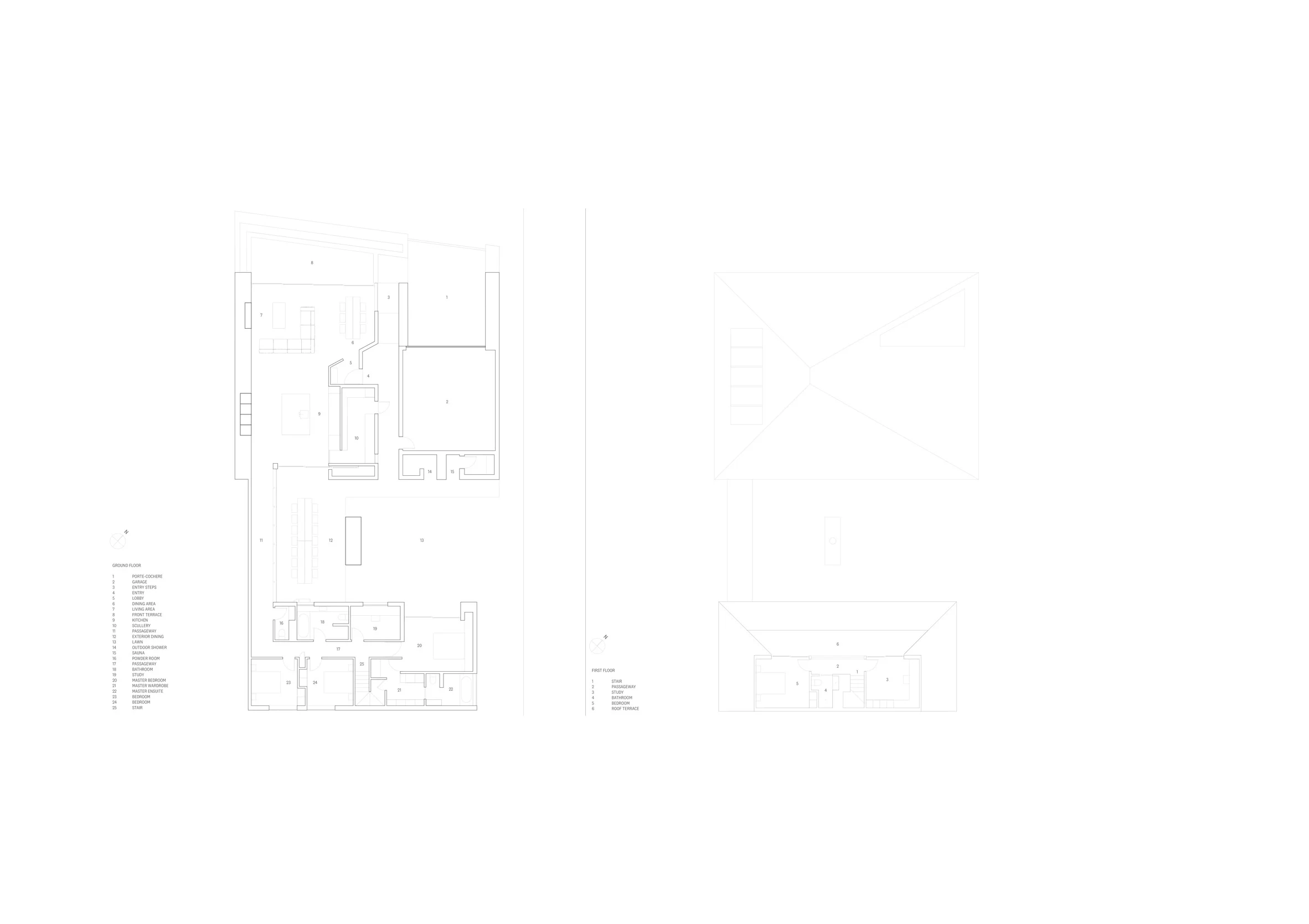 W północnej części bloku mieszkalnego znajduje się przestronna część dzienna z jadalnią i kuchnią, a także garaż. Blok sypialny na parterze mieści trzy sypialnie oraz gabinet, natomiast mniejszy, schowany pod dużym dachem, górny poziom oferuje dodatkową sypialnię, łazienkę, gabinet oraz taras, który stanowi doskonałą przestrzeń do relaksu na świeżym powietrzu.