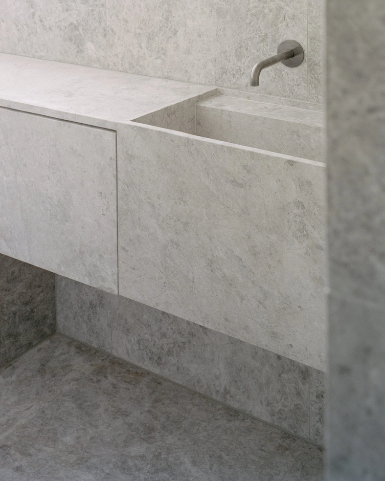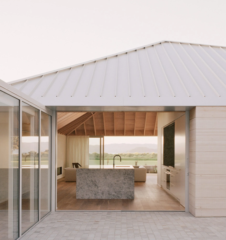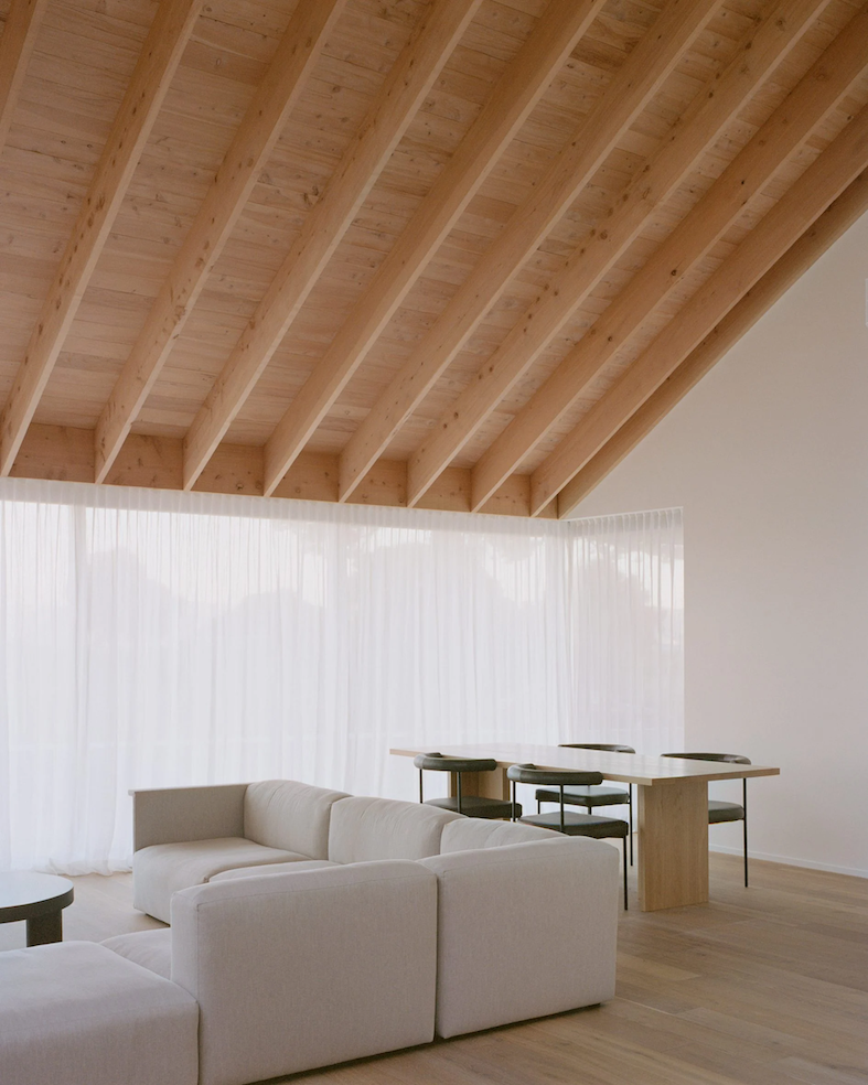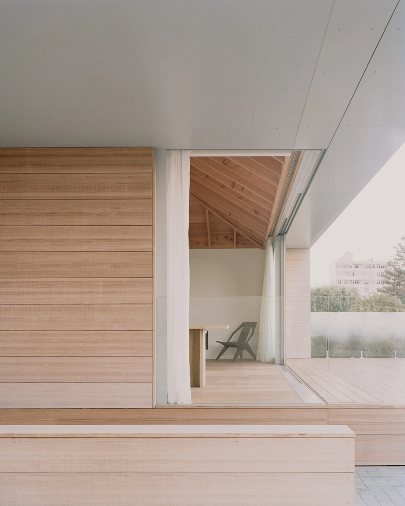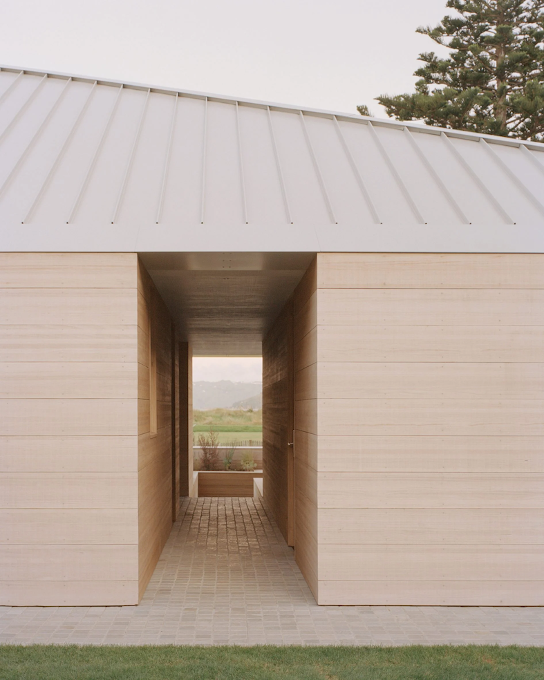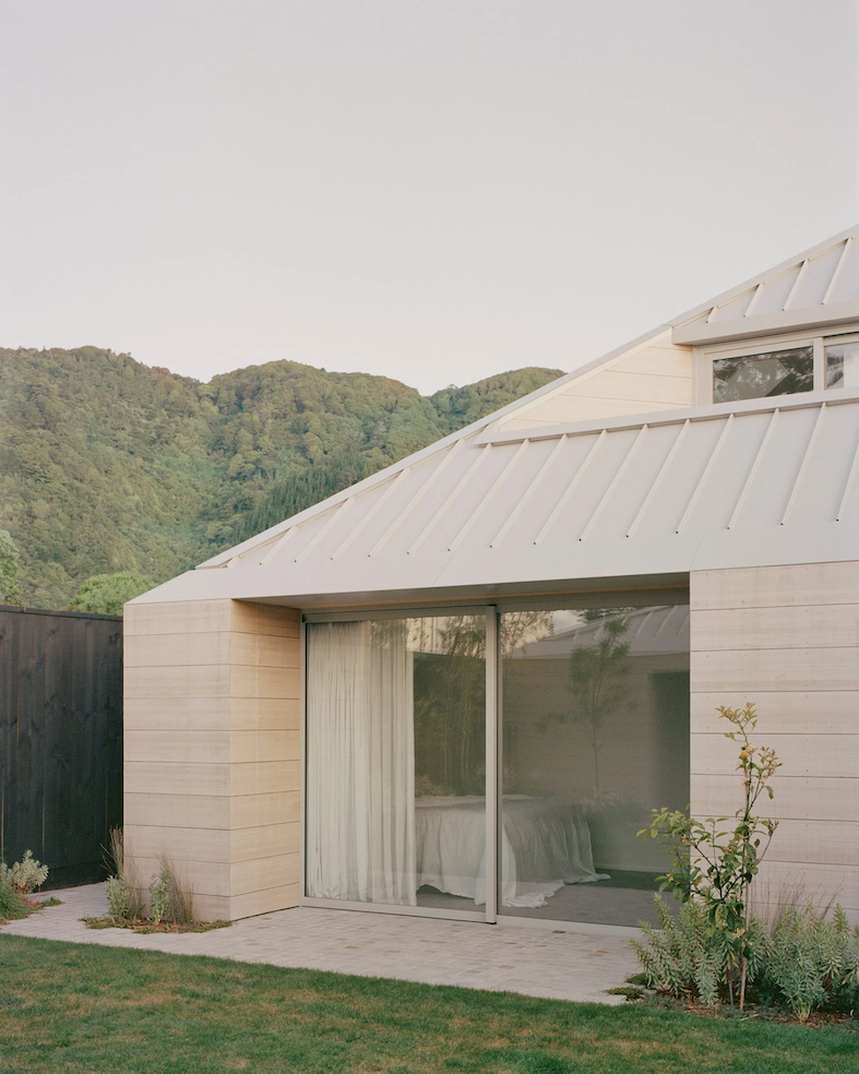 Obydwa bloki domów zostały zwieńczone płaskimi dachami czterospadowymi, pokrytymi metalowymi panelami, co dodaje budynkowi współczesnego, minimalistycznego charakteru. Zewnętrzna część domu została pokryta poziomymi deskami z jasnej sosny nowozelandzkiej, które nadają mu naturalny wygląd i doskonale komponują się z otaczającym krajobrazem. Wnętrze natomiast wyróżnia się ciemniejszym drewnem na podłogach i sufitach, a także eleganckim, szarym marmurem w łazienkach i kuchni. Kontrast między tymi materiałami i naturalnymi barwami wprowadza wyrafinowaną estetykę, która z jednej strony harmonizuje z naturą, a z drugiej wprowadza nowoczesny akcent.