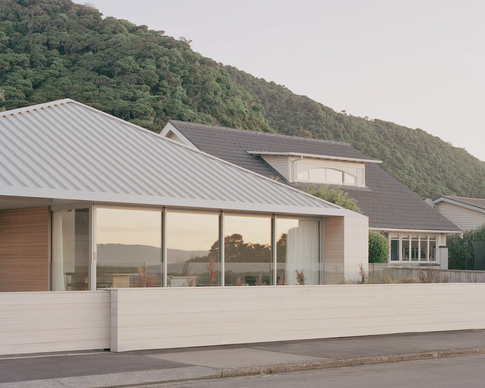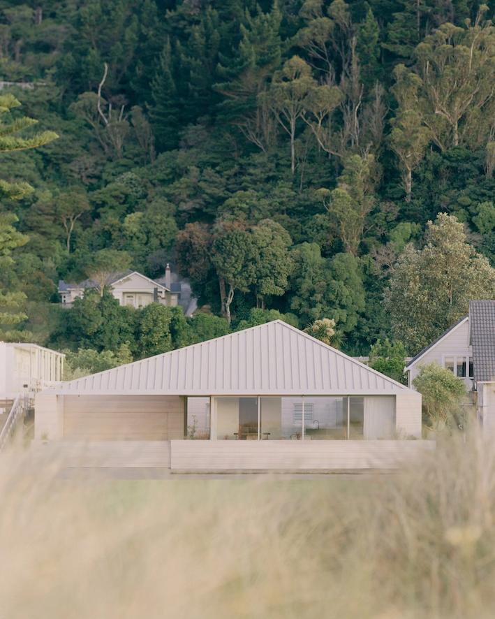 RK Residence, położony niedaleko wybrzeża w Nowej Zelandii, to projekt, który łączy minimalistyczny charakter z lokalną tradycją architektoniczną. Dzięki użyciu jasnej sosny na zewnętrznych okładzinach i białego metalu na dachu, dom harmonijnie wpisuje się w naturalny krajobraz i sąsiedztwo. Projekt nawiązuje do dwuspadowych, drewnianych form istniejących budynków w okolicy, tworząc spójną całość z otoczeniem.
