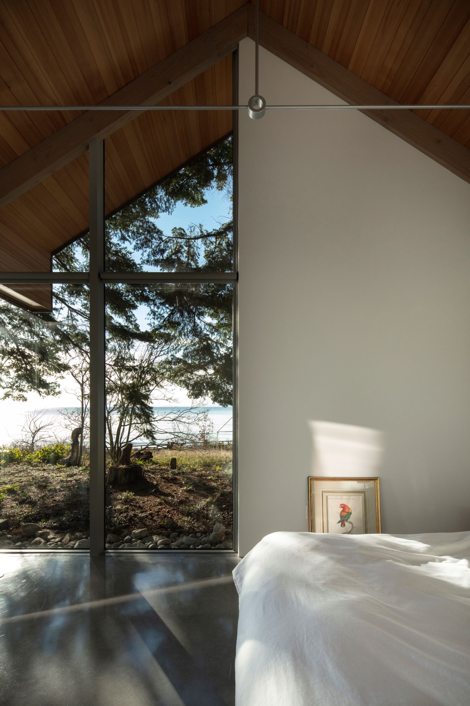 Materiały użyte w budowie – cedr, daglezja zielona, stal i polerowany beton – wpisują się w nadmorski charakter i zapewniają trwałość. Architekt zadbał o zachowanie istniejących drzew i naturalnych warunków terenu, a otwarta forma domu sprzyja życiu w bliskości z naturą.