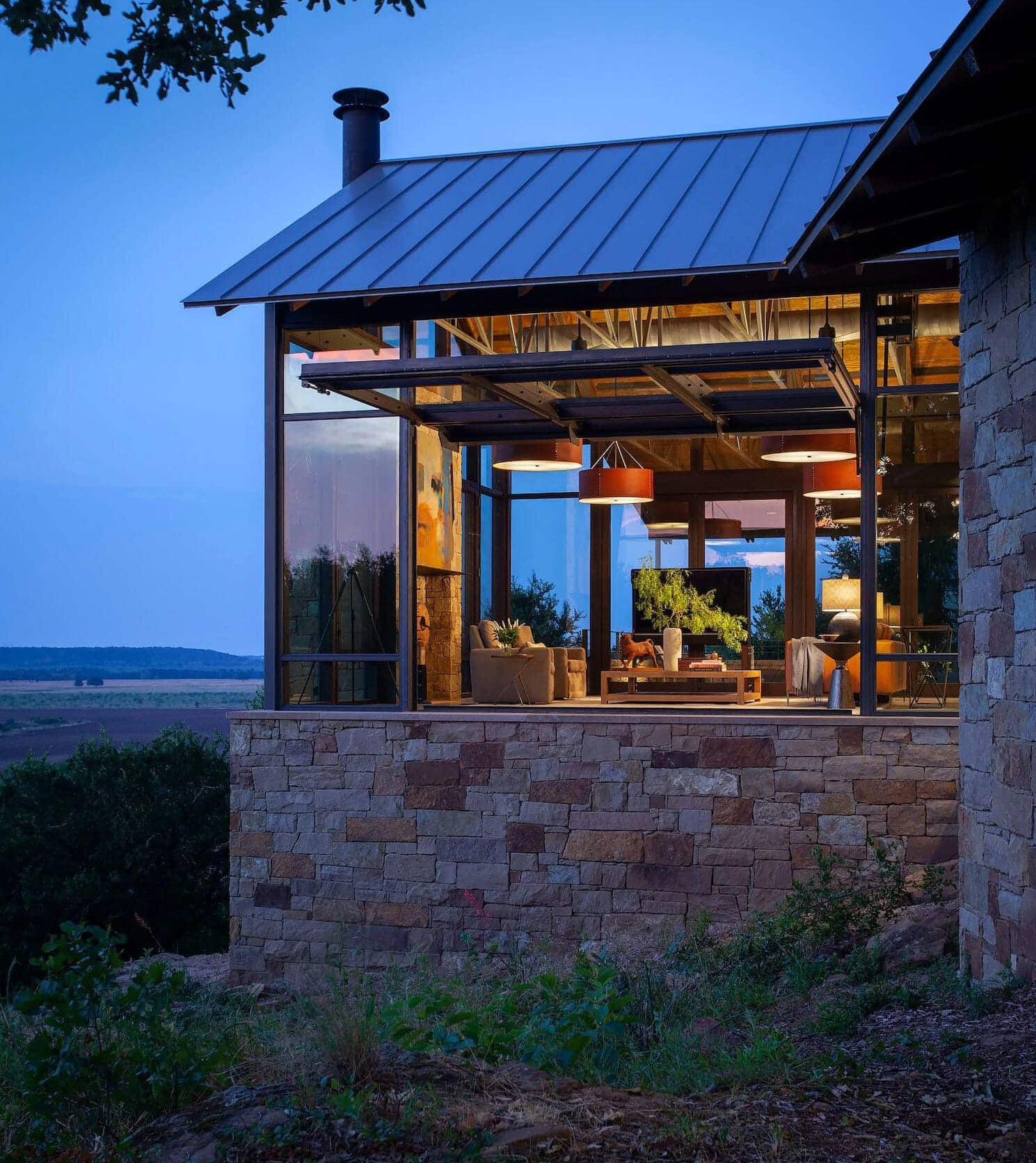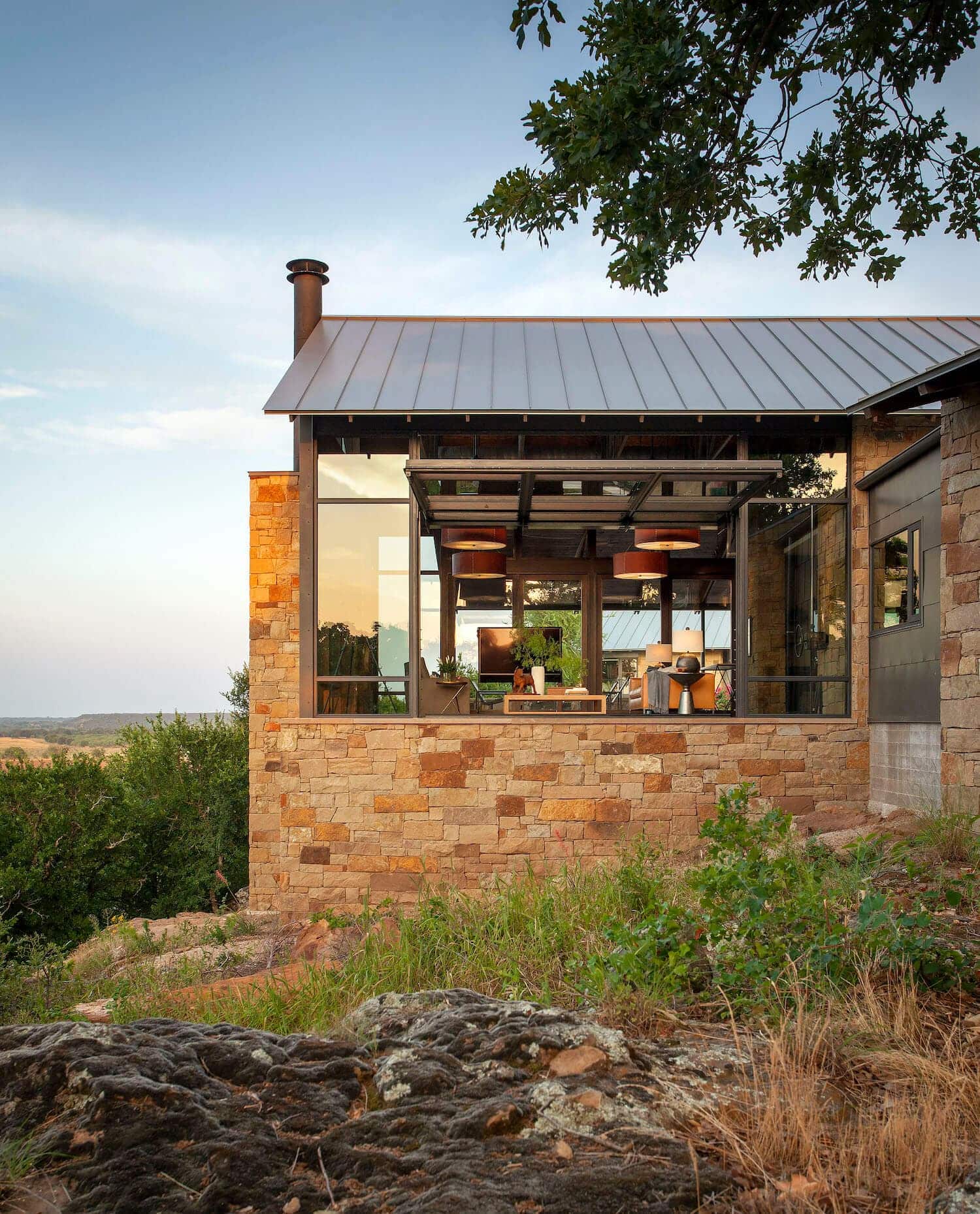 Projekt nazwany „Ranczo Rocking 8”, stworzony przez biura architektoniczne Sanders Architecture i Britt Design Group, to przykład harmonijnego połączenia nowoczesnej architektury z rustykalnymi elementami. Dom o powierzchni 464 m² powstał na terenie liczącego ponad 120 hektarów rancza w Teksasie, wśród naturalnych formacji skalnych i zapierających dech w piersiach widoków. Właściciele, Royce i Judy Mitchell, przez lata szukali idealnego miejsca na swój dom i ostatecznie wybrali malownicze wzgórze z widokiem na pola uprawne i falujący, wzgórzysty krajobraz. Lokalizacja nie tylko oferuje niesamowite panoramy, ale zapewnia też naturalną wentylację dzięki łagodnym, stale wiejącym bryzom.