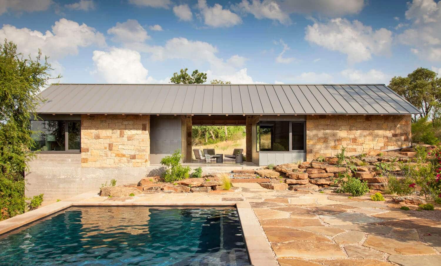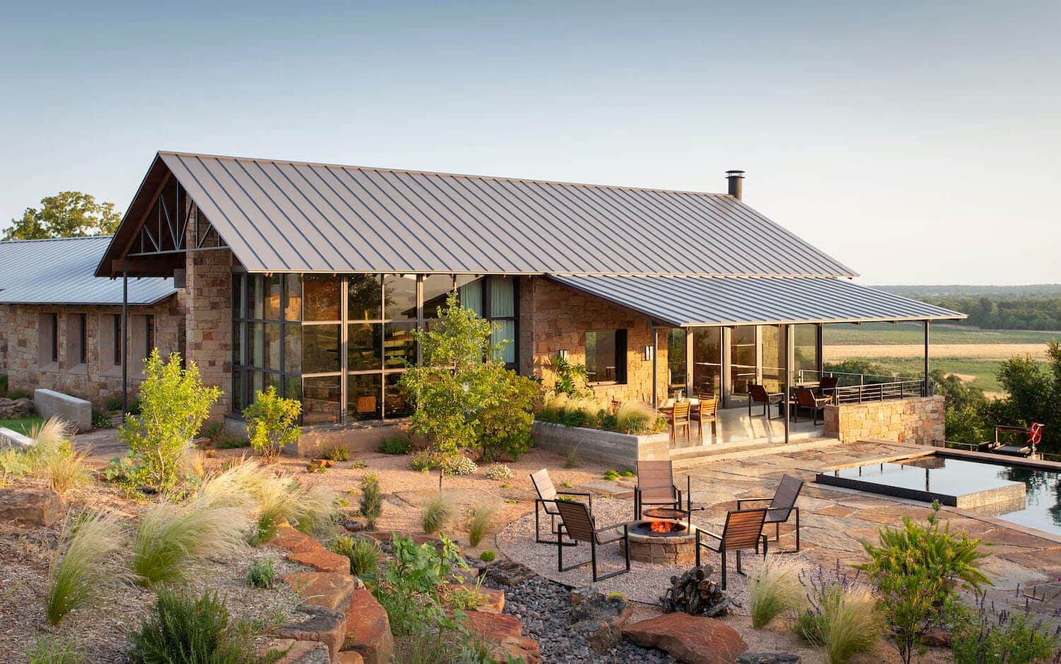 Architektura współczesnego rancza została podporządkowana ukształtowaniu terenu i obecności charakterystycznych głazów. Dom sprawia wrażenie, jakby wyrastał z ziemi – zintegrowany z przyrodą, posadowiony między skałami i niską roślinnością. Jedna z formacji skalnych, nazwana „Skałą Zen”, została wyeksponowana tuż obok sypialni głównej. Aby jak najlepiej wykorzystać widoki i światło dzienne, architekci zastosowali duże przeszklenia, szklane ściany oraz otwierane okna, które łączą wnętrze z krajobrazem. Projektując układ pomieszczeń, kierowano się dominującym kierunkiem wiatru, dzieląc dom na dwie główne części – główną chatę mieszkalną oraz strefę dla gości – co przypomina układ nowoczesnej stodoły z funkcjonalnym podziałem przestrzeni.