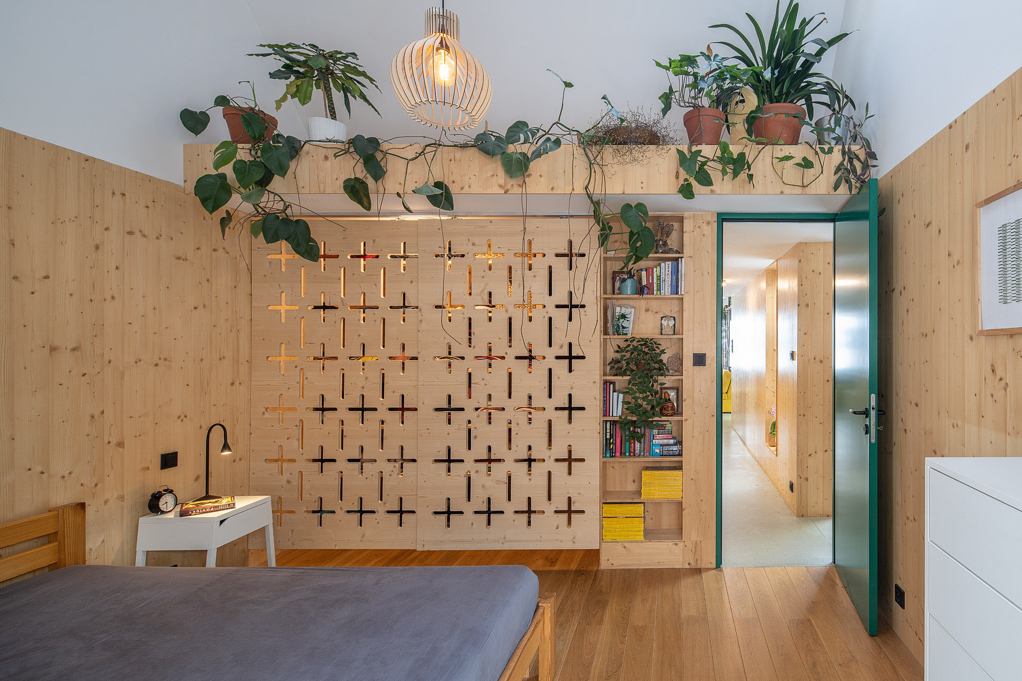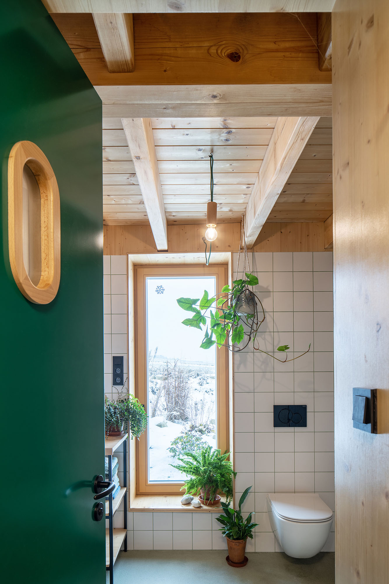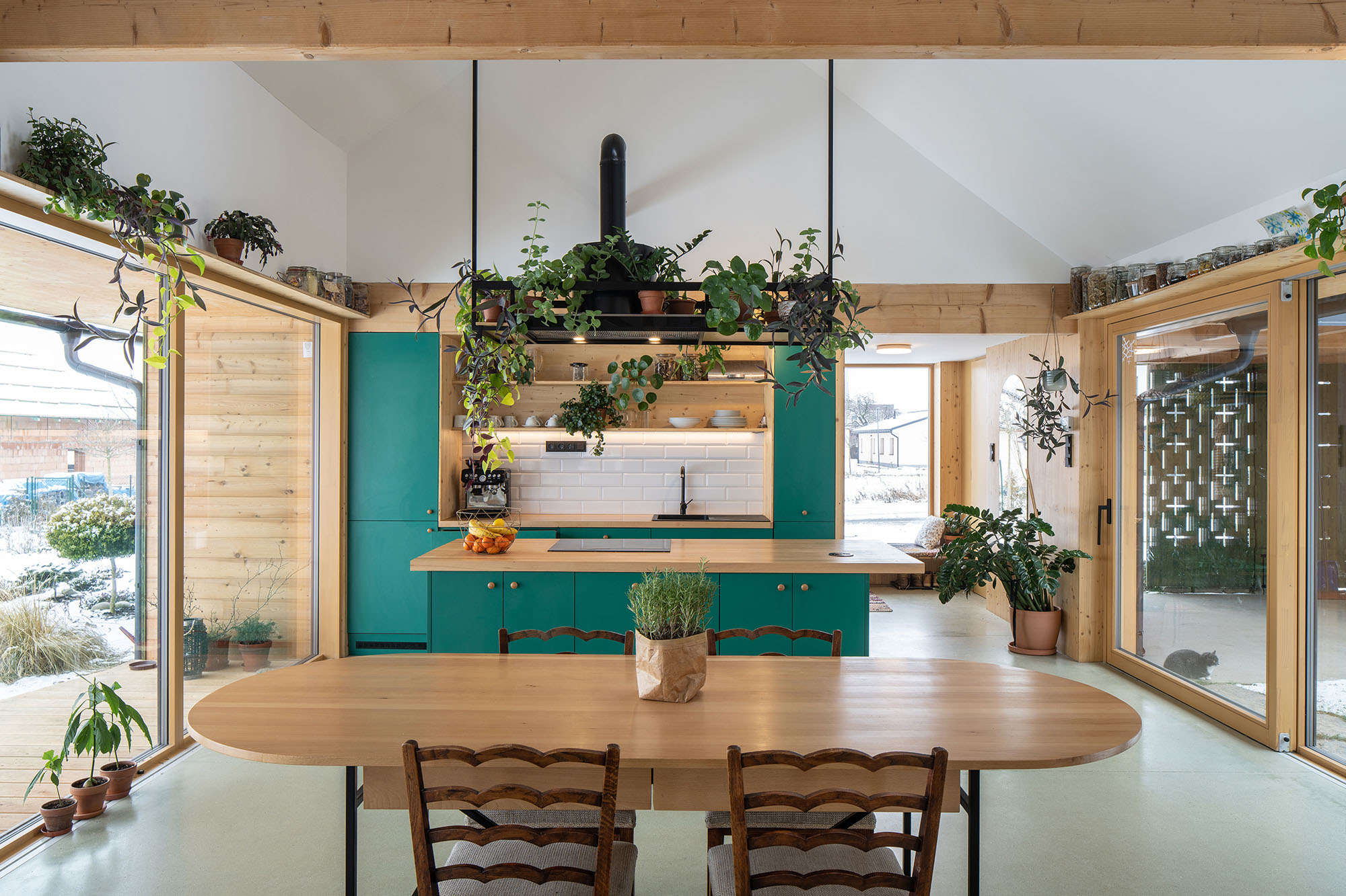 Dom skierowany jest otwartą częścią dzienną ku światłu dziennemu. Charakterystyczny „szklarniowy” wlot ganku prowadzi do przestrzeni salonowej, kuchni i jadalni wzbogaconych dużymi przeszkleniami. Przesuwne drzwi łączą wnętrze z ogrodem, zapewniając płynne przejście między strefami – od prywatnej strefy nocnej, przez część dzienną, aż po przestrzeń relaksu i wyciszenia.