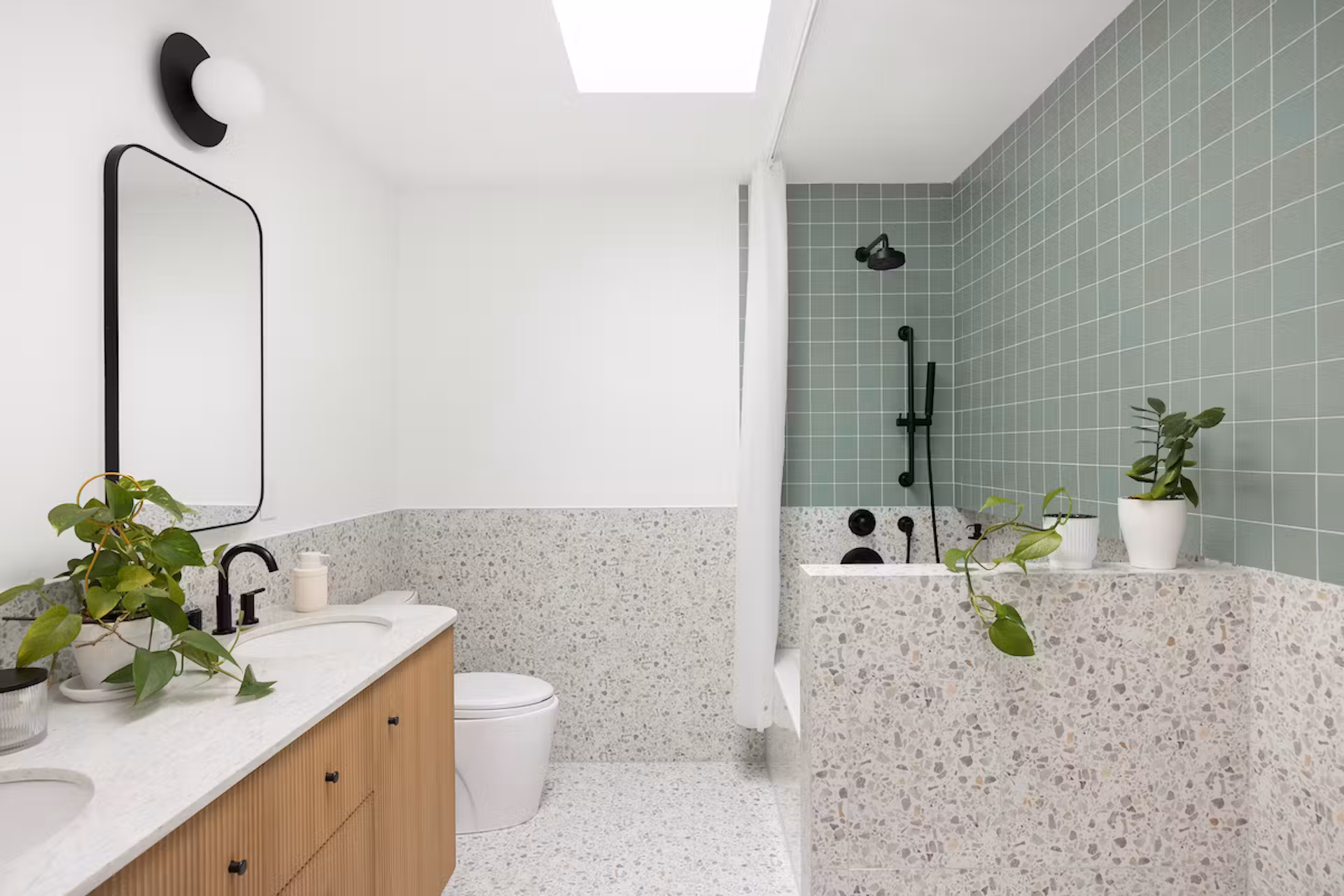 Sypialnie i łazienki otrzymały odświeżony wygląd, dopasowany do gustu mieszkańców. W łazience głównej pojawił się marmur i delikatne odcienie bieli, podczas gdy łazienka dla dzieci jest bardziej zabawna i kolorowa. Dla gości stworzono natomiast nastrojową, przytulną łazienkę w ciemniejszych barwach, która przypomina małe domowe spa.