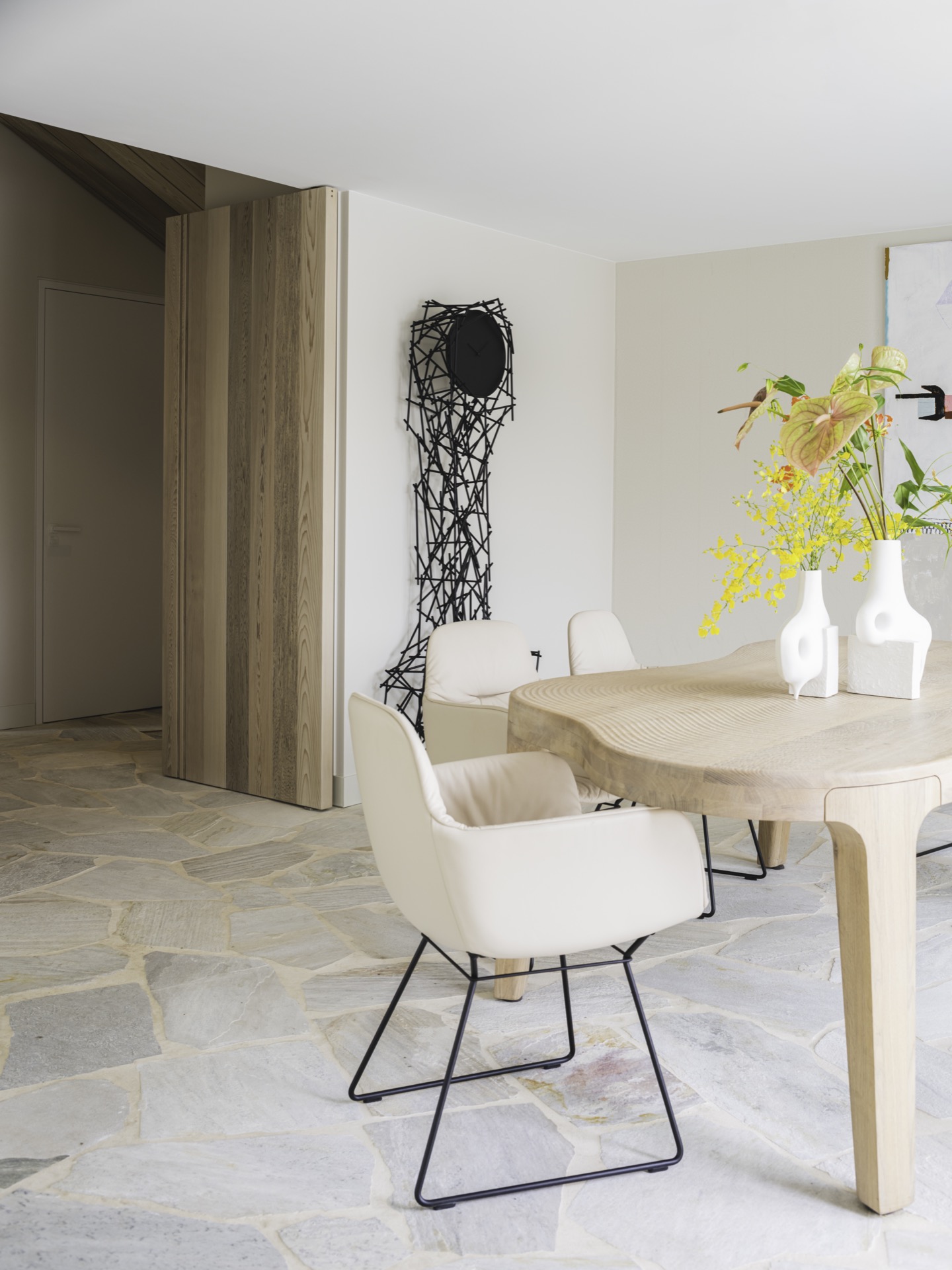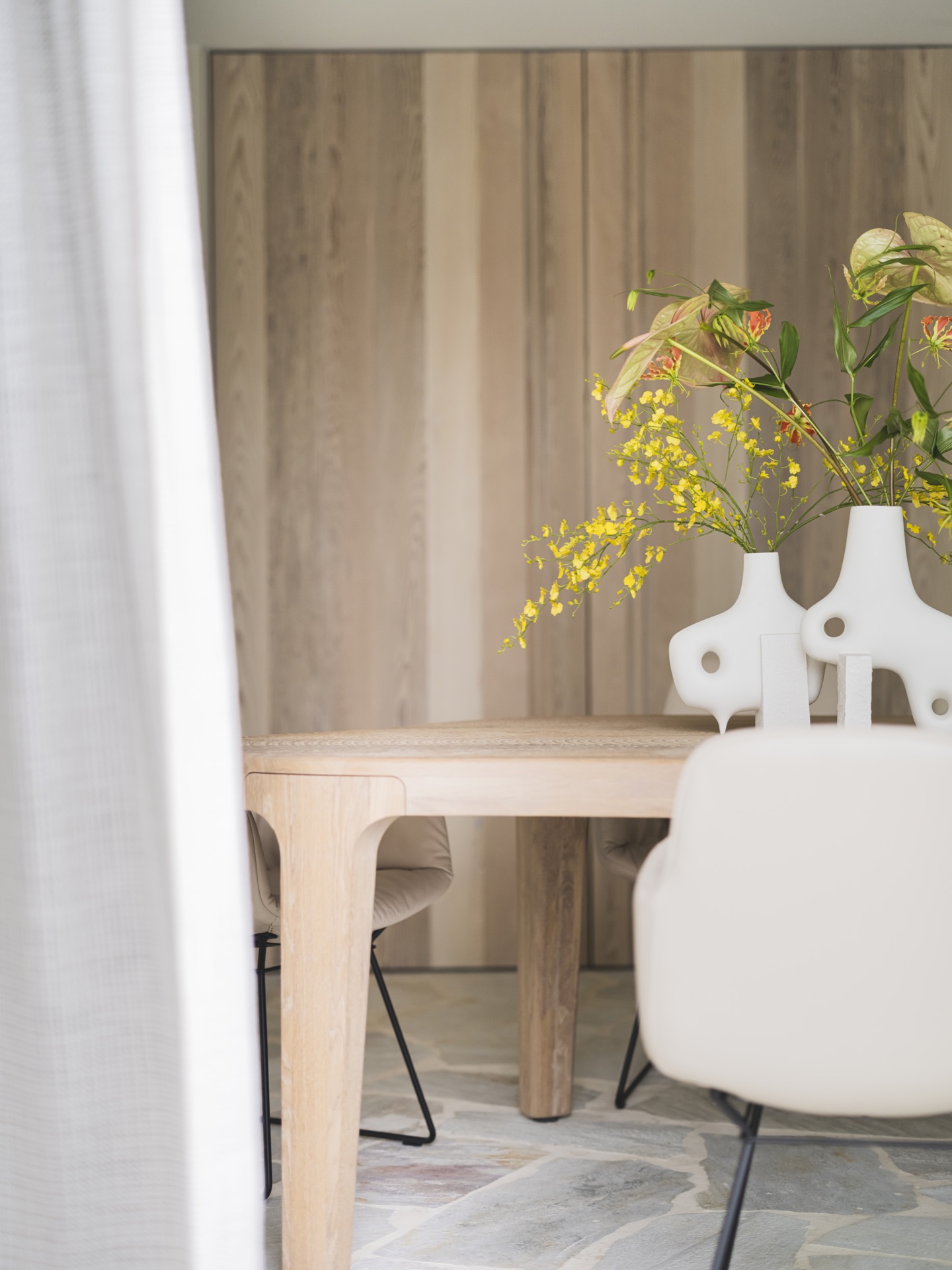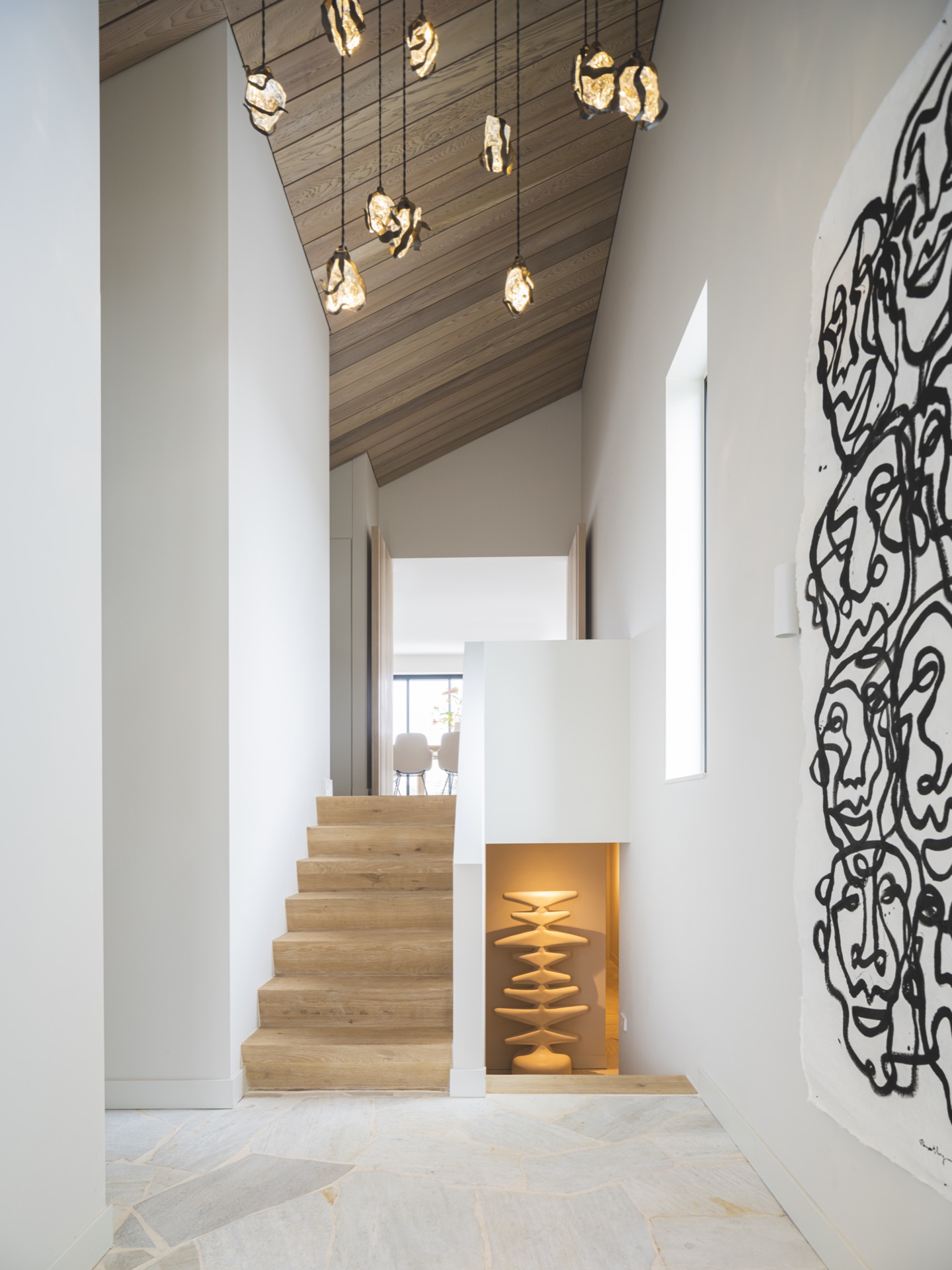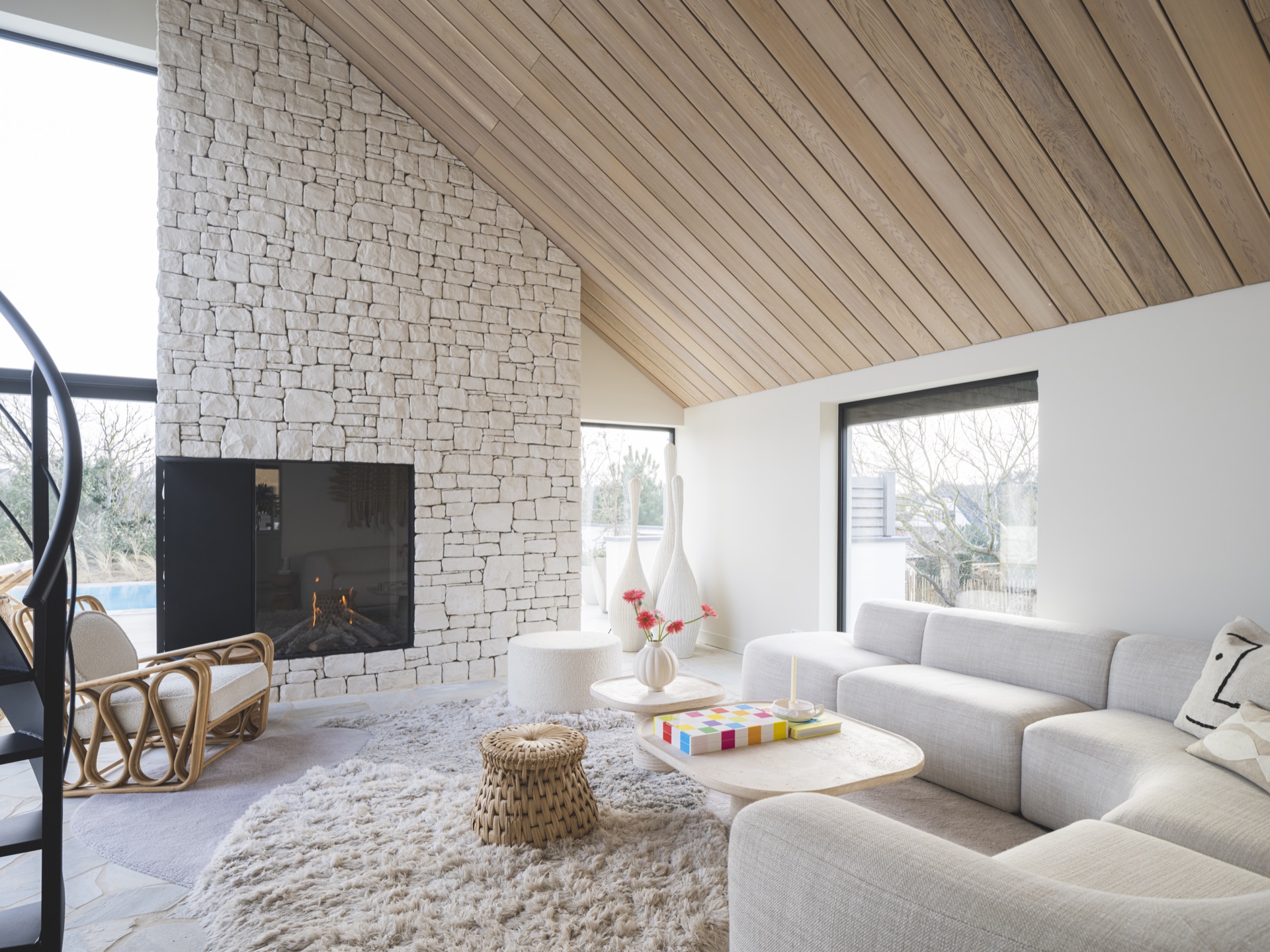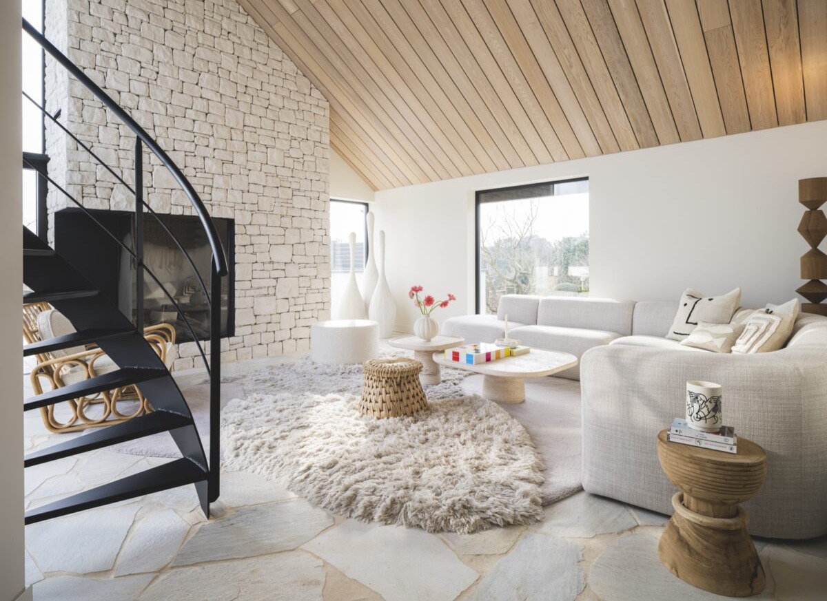 Witamy w tym przytulnym domu wakacyjnym, pięknym projekcie zrealizowanym przez Studio des Bouvrie. Dzięki wyjątkowemu połączeniu komfortu i stylu, ten dom jest idealnym miejscem na relaks. Studio des Bouvrie starannie dobrało materiały i kolory, które tworzą harmonię z otoczeniem. Wnętrze emanuje ciszą i spokojem, z naciskiem na naturalne elementy i ponadczasowy design.