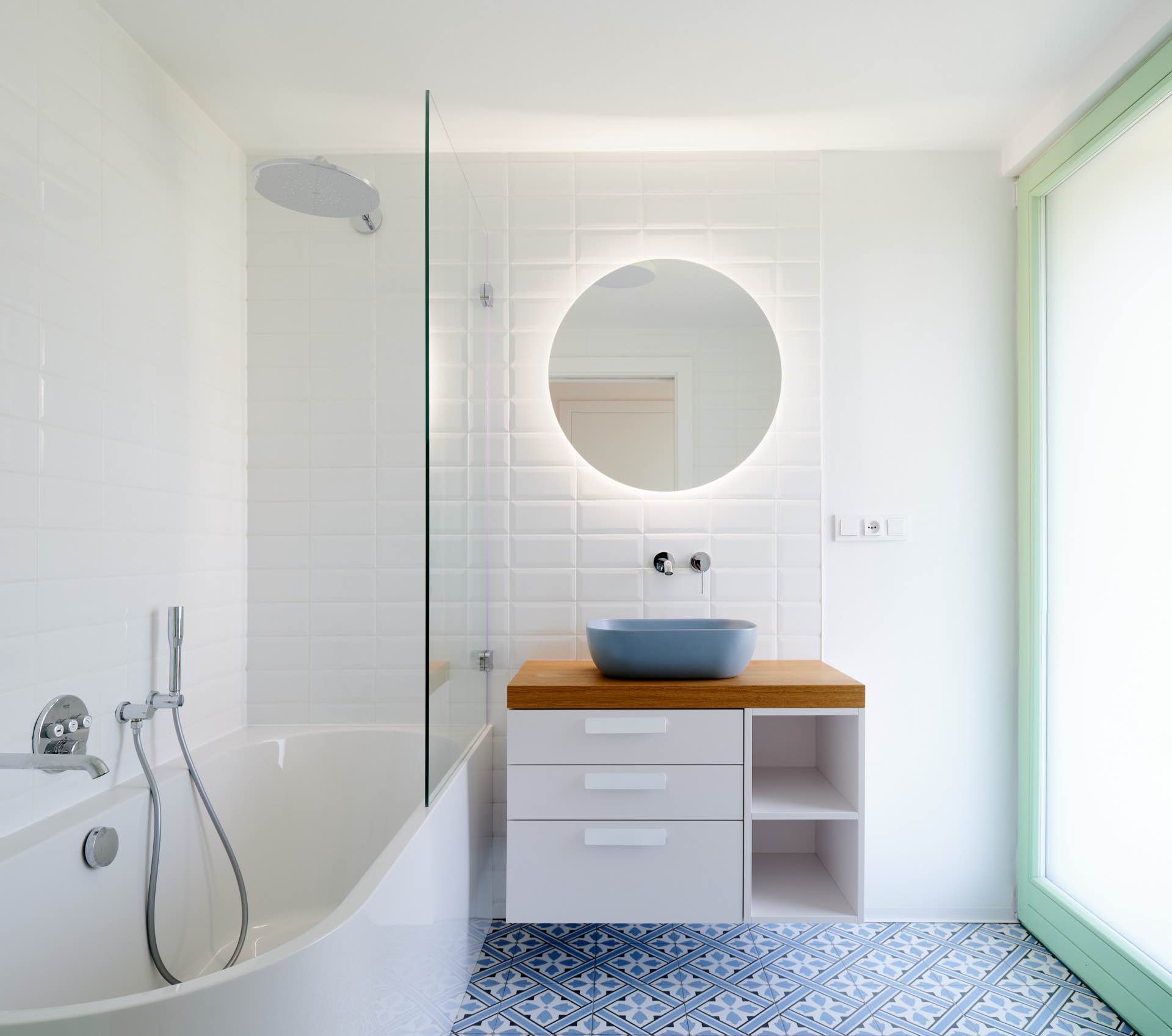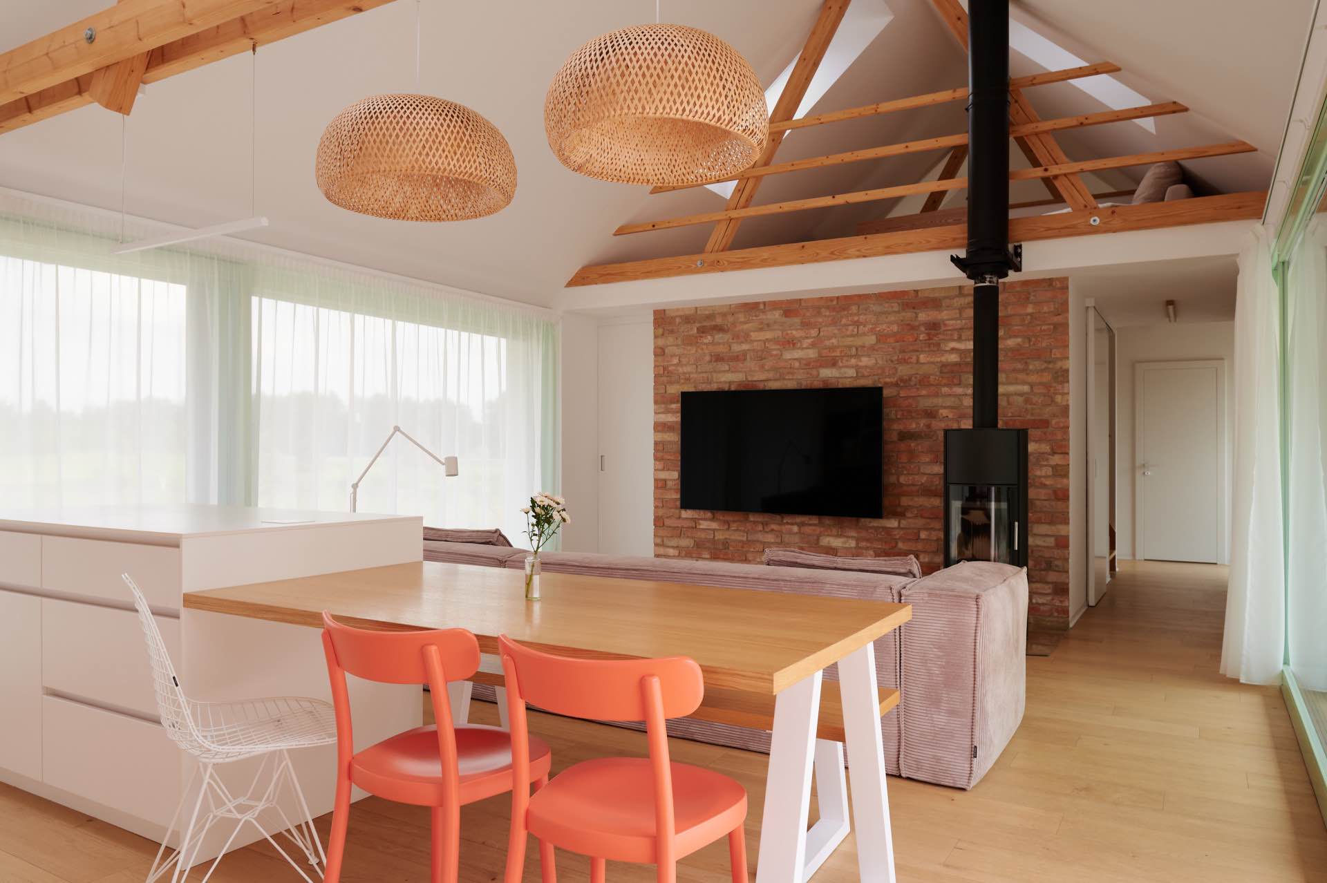 Minimalistyczny charakter wnętrz oparto na zestawieniu bieli i naturalnego drewna, które nadają przestrzeni spokojny, niemal rustykalny charakter. Jednocześnie architekci celowo wprowadzili elementy przełamujące ten klimat – kolorowe meble oraz zielone ramy okienne, które dodają całości współczesnej lekkości i świeżości. To właśnie ten balans pomiędzy tradycją a nowoczesnością sprawia, że dom nie jest stylizacją, lecz nowoczesną interpretacją wiejskiego archetypu.