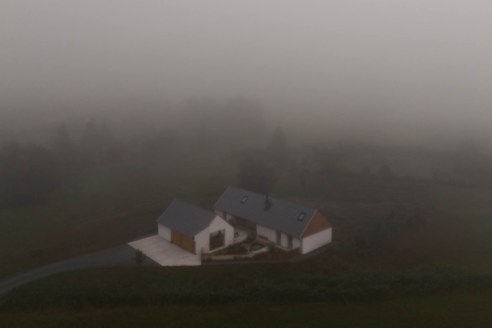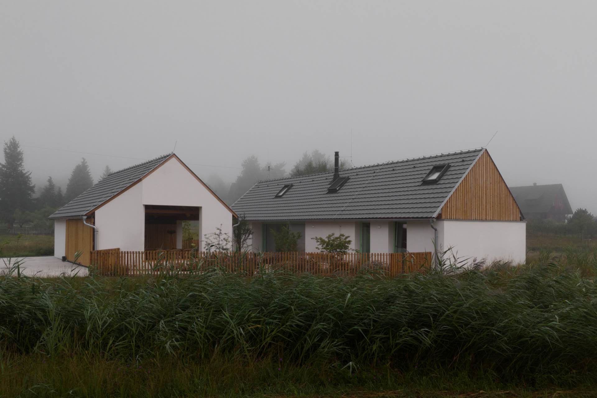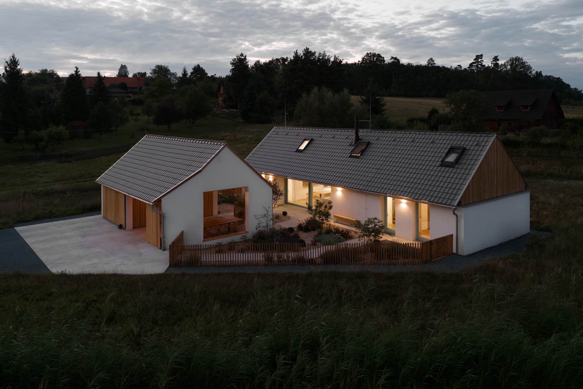 Na skraju miejscowości Bělečko, niedaleko Hradca Králové, powstał rodzinny dom, który na pierwszy rzut oka wygląda jak odrestaurowane wiejskie gospodarstwo. Dwa parterowe budynki z dwuspadowymi dachami, biała elewacja i drewno na szczytach przywodzą na myśl tradycyjne stodoły i zabudowania gospodarcze. W rzeczywistości jest to jednak zupełnie nowa realizacja, zaprojektowana od podstaw przez Air ateliér na tzw. zielonej łące.