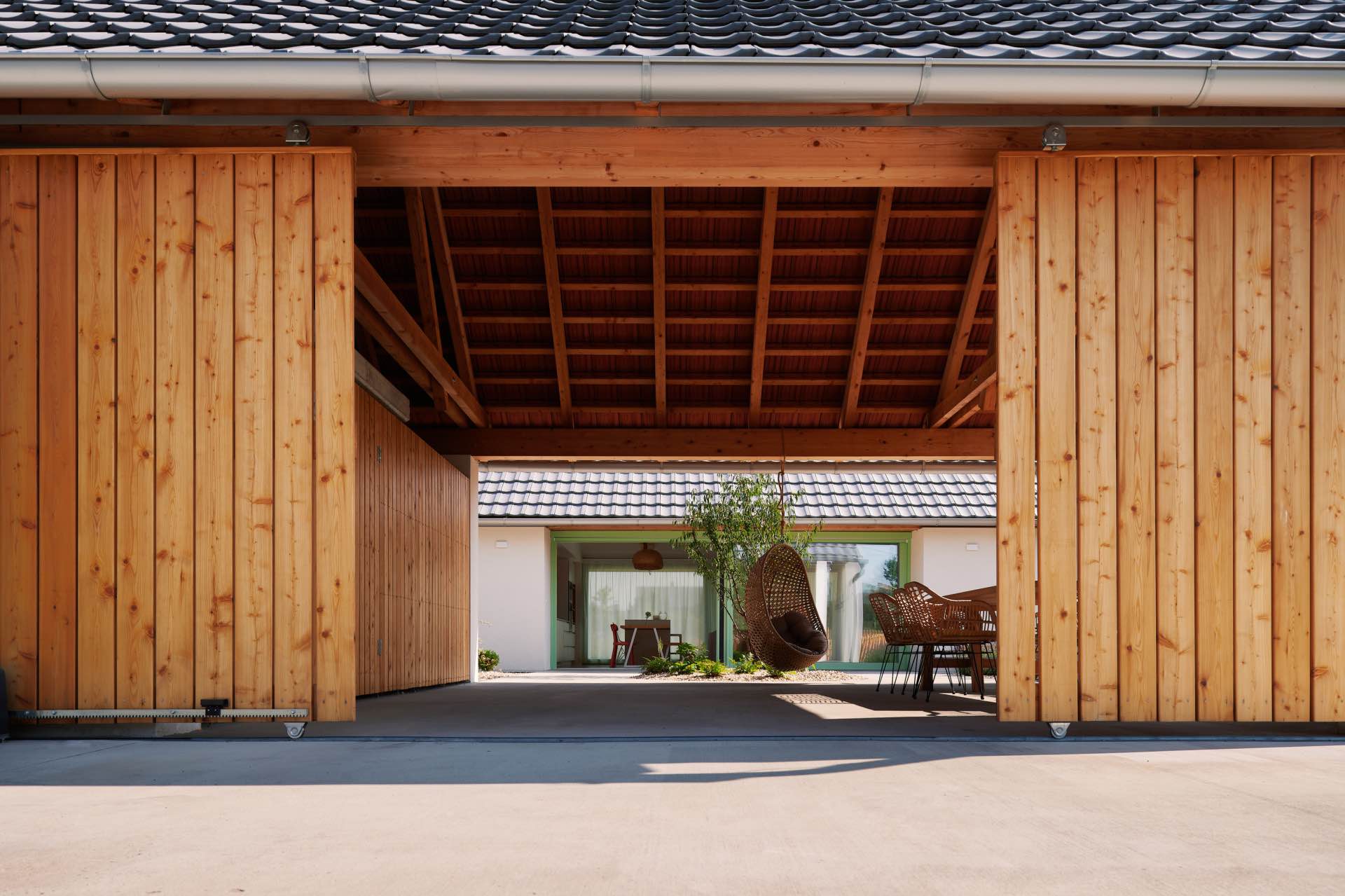 Architekci świadomie sięgnęli po zasady charakterystyczne dla dawnej zabudowy wiejskiej. Dom składa się z dwóch oddzielnych obiektów – głównego budynku mieszkalnego oraz drugiego, pełniącego funkcję gospodarczą. Zamiast zwierząt znajdują się tu dziś samochody, rowery i zadaszone miejsce do siedzenia, które naturalnie staje się przedłużeniem przestrzeni domu. Układ ten nie tylko porządkuje funkcje, ale też wpisuje się w lokalną tradycję swobodnie rozrzuconych, wolno stojących zabudowań.